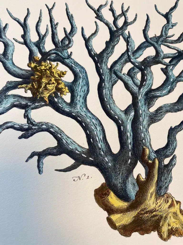 Elegant hand-watercolored print representing Corallium Rubrum in red nuance, Image reproduced from the famous illustrations by Albertus Seba' Cabinet of Natural Curiosities.These prints are available in 3 different representations and 2 colors, red and turquoise, to create a bright and joyful composition.Paper dimension 60 x 44 cmSlab rebate dimension 31 x 25.5 cm(cod. 538)Albertus Seba (May 12, 1665, Etzel near Friedeburg – May 2, 1736, Amsterdam) was a Dutch pharmacist, zoologist, and collector.He accumulated one of the largest cabinets of curiosities in the Netherlands during his time. He sold one of his cabinets in 1717 to Peter the Great of Russia and his later collections were auctioned after his death. He published descriptions of his collections in a lavishly illustrated 4 volume Thesaurus.With an experience of over 40 years, Artecornici design creates high-quality handmade frames using precious woods and working various types of high-quality finishes, lacquers and ageing, offering a vast choice of models.Each print is an artisanal Florentine product, reproducing images of the European 18th and 19th centuries with the same printing techniques (engraving with a star press), the golden age of prints, which are then finished and watercolored exclusively by handThe richness of our work lies in the ability to make our customers' requests our own, creating products with personalized, unique, and precious creations, renewing our collections year after year.