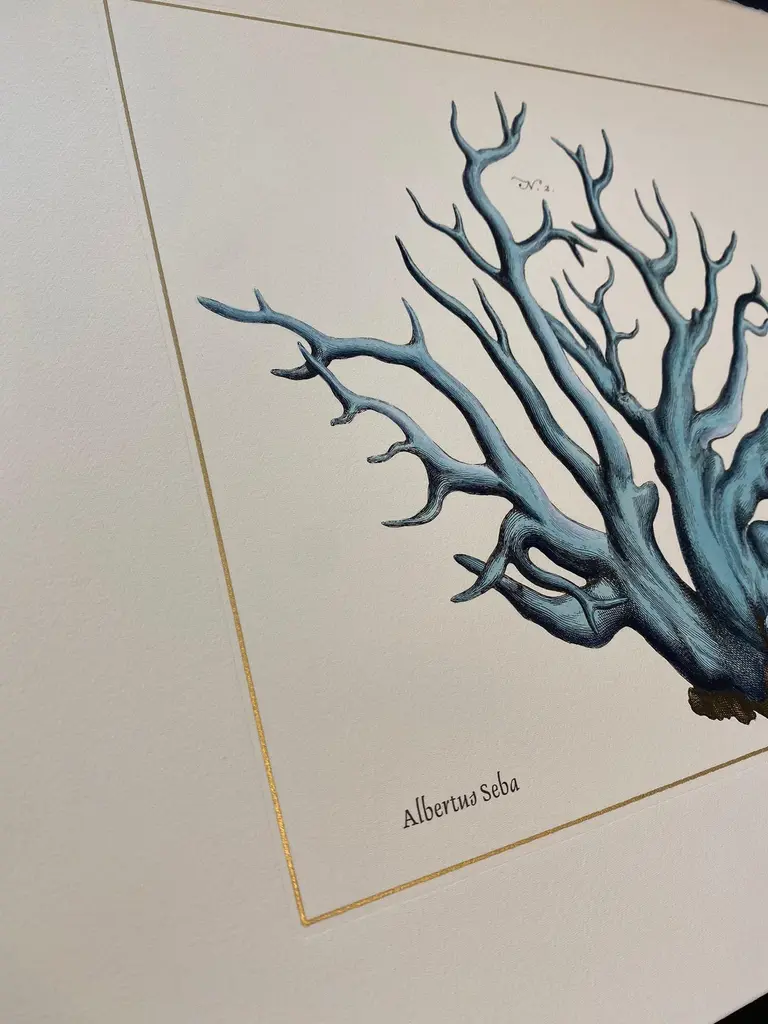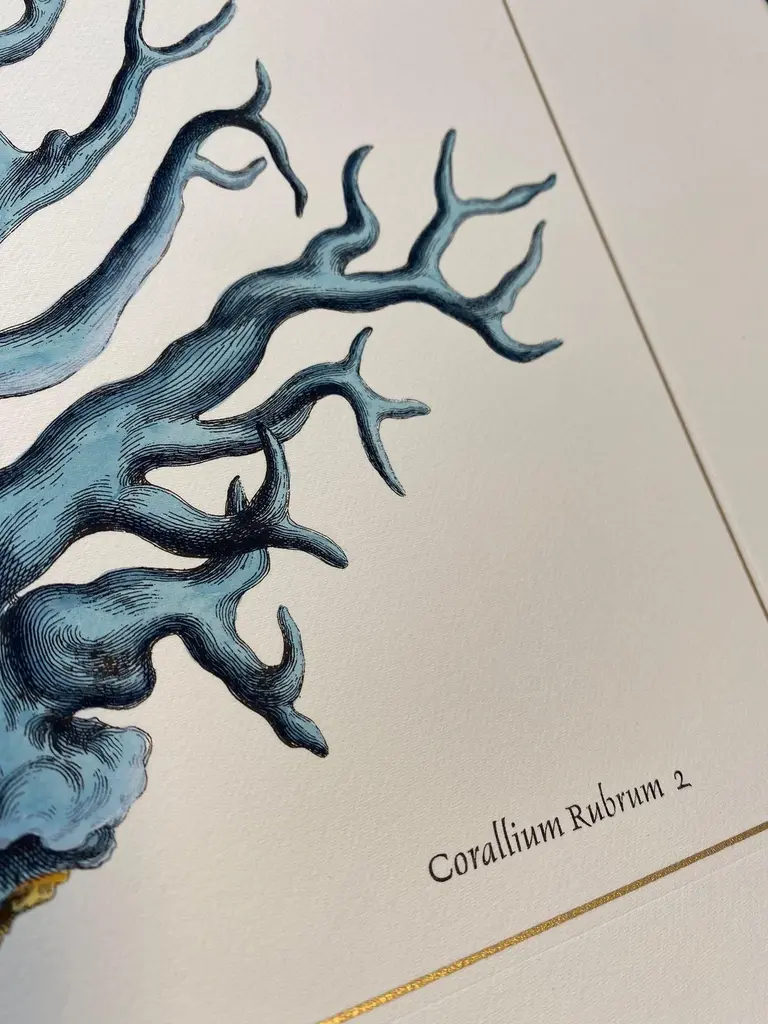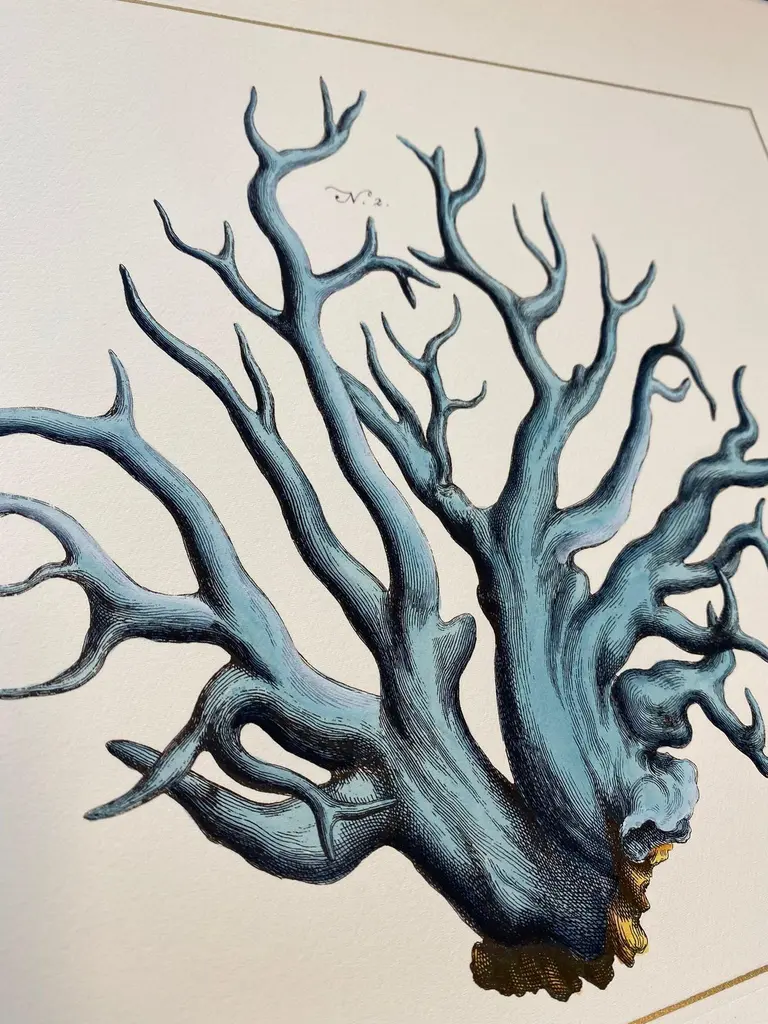 Elegant hand-watercoloured print representing Corallium Rubrum in red nuance, an Image reproduced from the famous illustrations by Albertus Seba' Cabinet of Natural Curiosities.These prints are available in 3 different representations and 2 colors, red and turquoise, to create a bright and joyful composition.Paper dimension 60 x 44 cmSlab rebate dimension 31 x 25.5 cm(cod. 538)Albertus Seba (May 12, 1665, Etzel near Friedeburg – May 2, 1736, Amsterdam) was a Dutch pharmacist, zoologist, and collector.He accumulated one of the largest cabinets of curiosities in the Netherlands during his time. He sold one of his cabinets in 1717 to Peter the Great of Russia and his later collections were auctioned after his death. He published descriptions of his collections in a lavishly illustrated 4 volume Thesaurus.With an experience of over 40 years, Artecornici design creates high-quality handmade frames using precious woods and working various types of high-quality finishes, lacquers and ageing, offering a vast choice of models.Each print is an artisanal Florentine product, reproducing images of the European 18th and 19th centuries with the same printing techniques (engraving with a star press), the golden age of prints, which are then finished and watercolored exclusively by handThe richness of our work lies in the ability to make our customers' requests our own, creating products with personalized, unique, and precious creations, and renewing our collections year after year.
