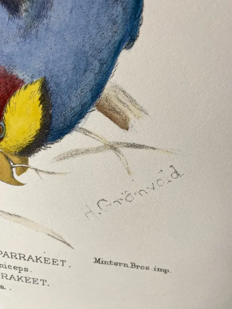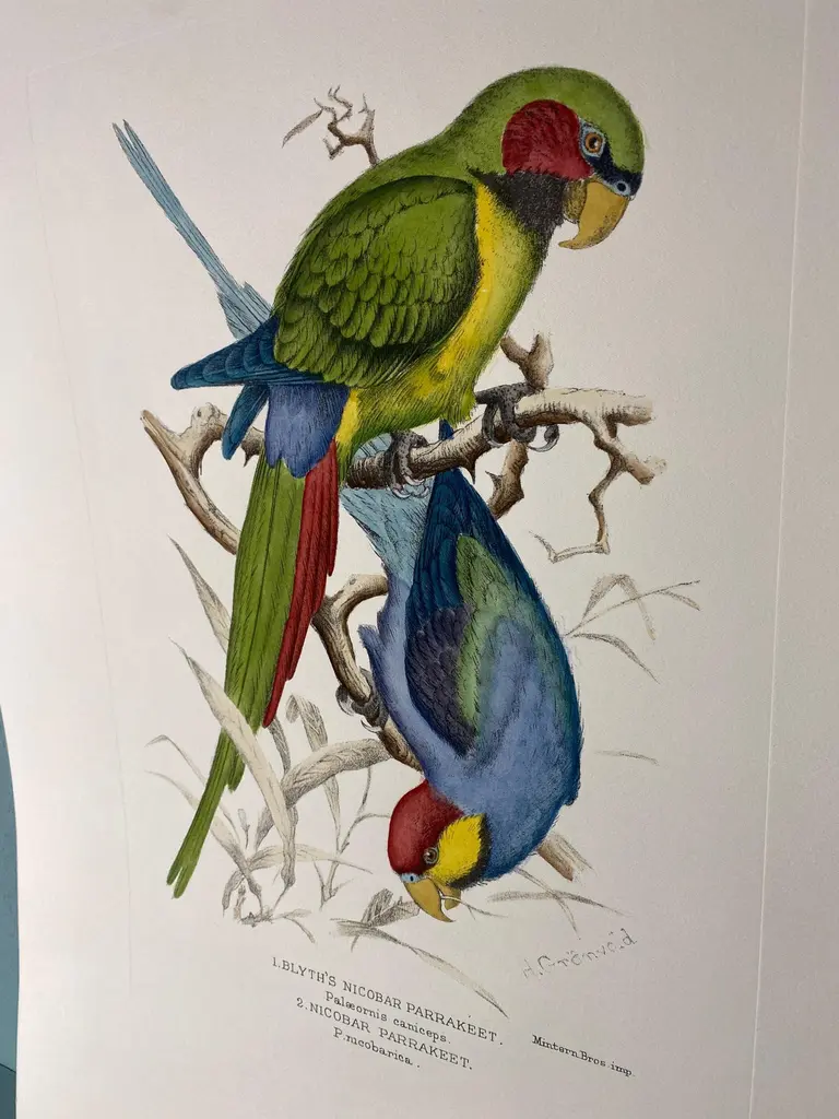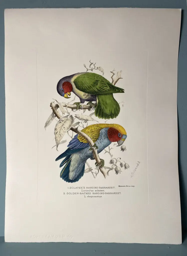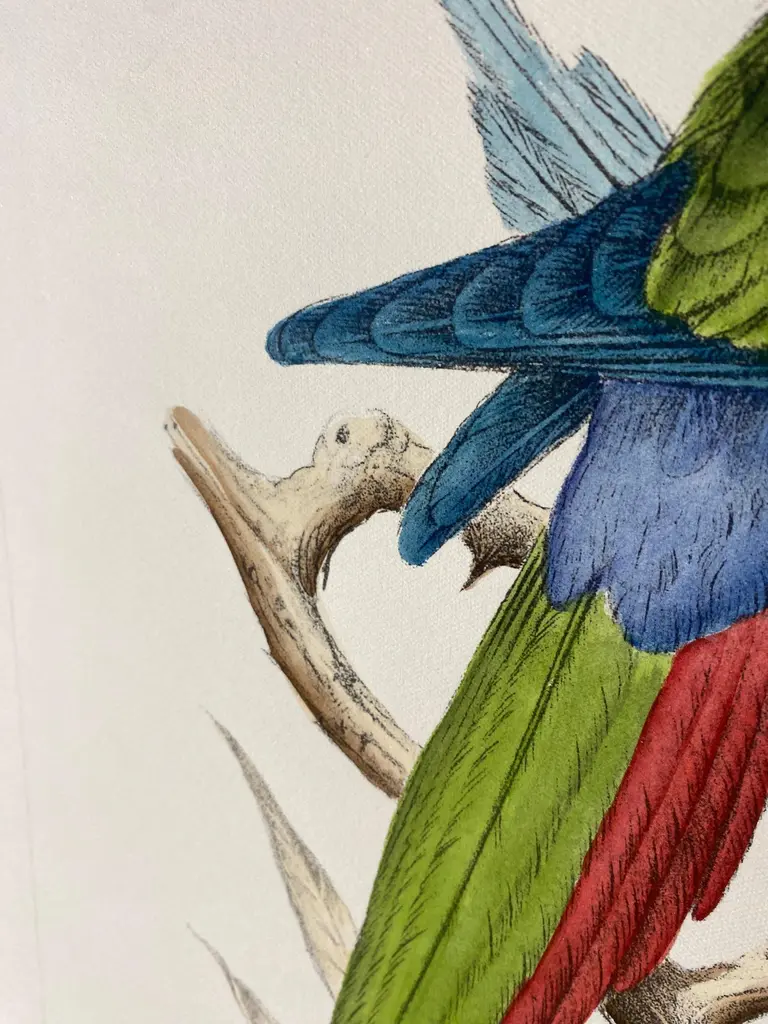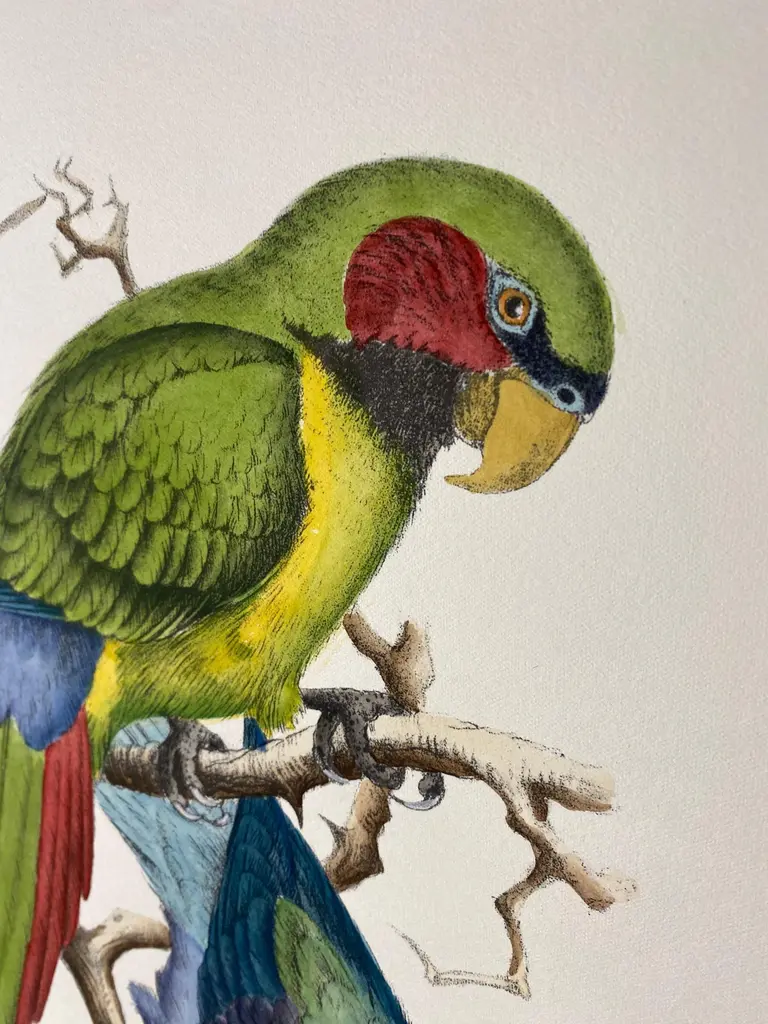 Elegant hand-watercoloured print representing two Hanging Parrakeets in using lots of bright colours. Image reproduced from the famous illustrations by Henrik Grönvold.Printed manually on 100% cotton engraving paper in Florence Italy.Each print is entirely painted by hand with water colors and tempera in multicolors tones.Matted in dark sage green with back hand detailing.Henrik Grønvold (6 September 1858 – 23 March 1940) was a Danish naturalist and artist, known for his illustrations of birds. Grønvold was among the last natural history illustrators to publish lithographs.With an experience of over 40 years, Artecornici design creates high-quality handmade frames using precious woods and working various types of high-quality finishes, lacquers and ageing, offering a vast choice of models.Each print is an artisanal Florentine product, reproducing images of the European 18th and 19th centuries with the same printing techniques (engraving with a star press), the golden age of prints, which are then finished and watercolored exclusively by handThe richness of our work lies in the ability to make our customers' requests our own, creating products with personalized, unique, and precious creations, renewing our collections year after year.