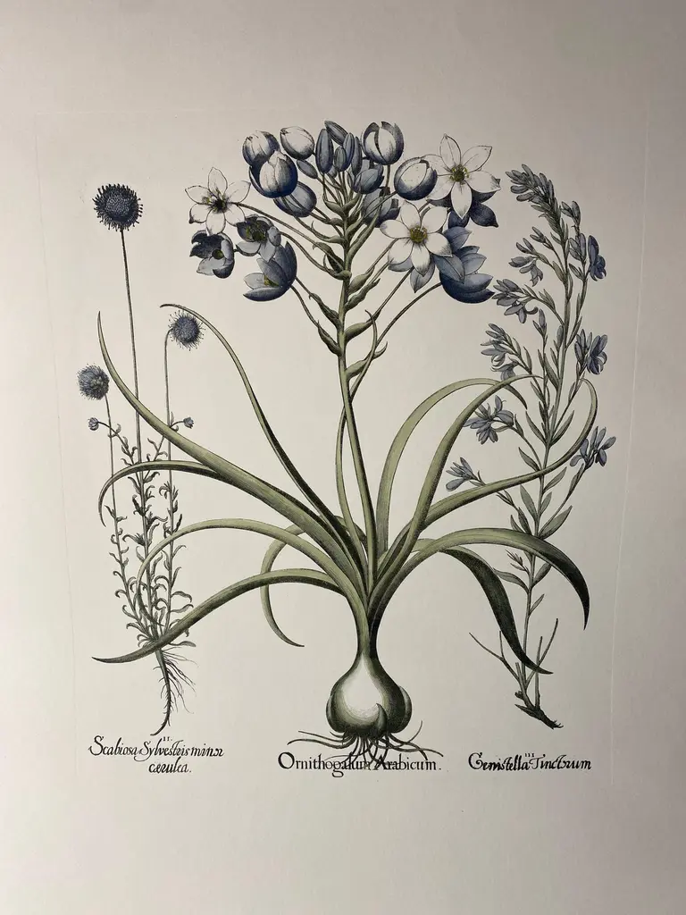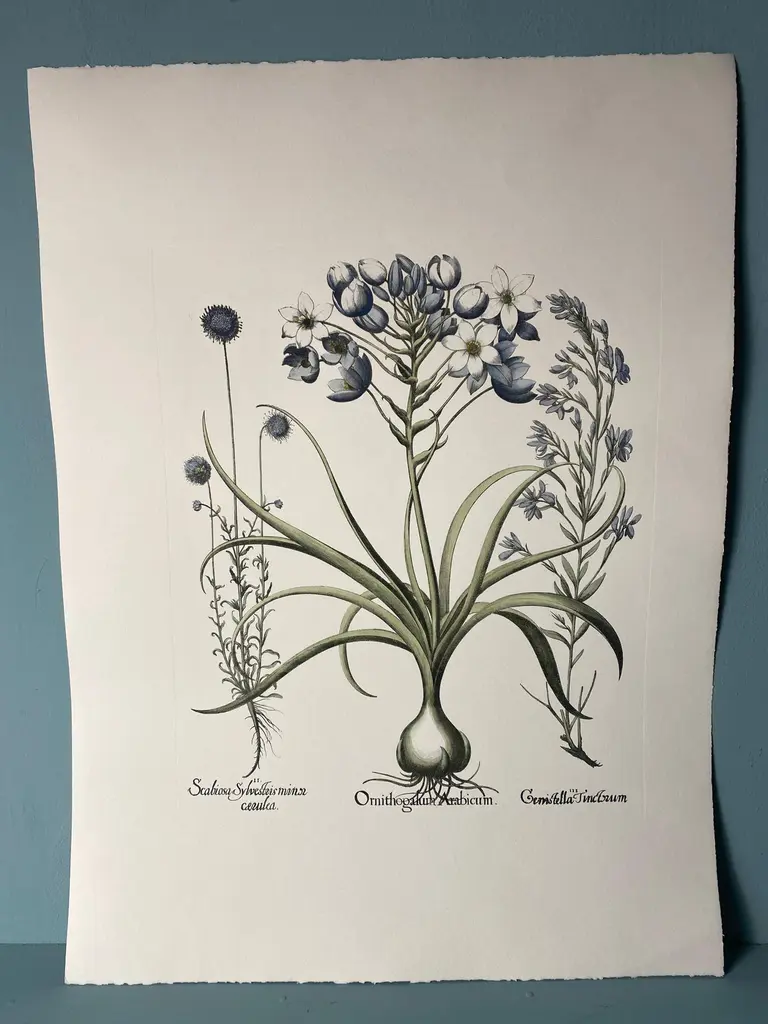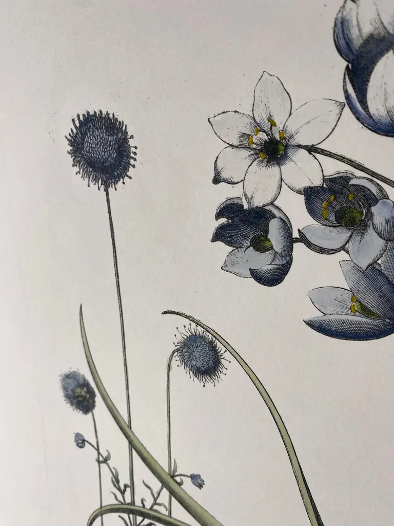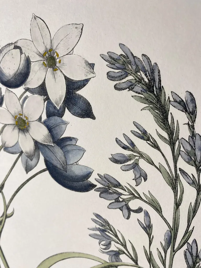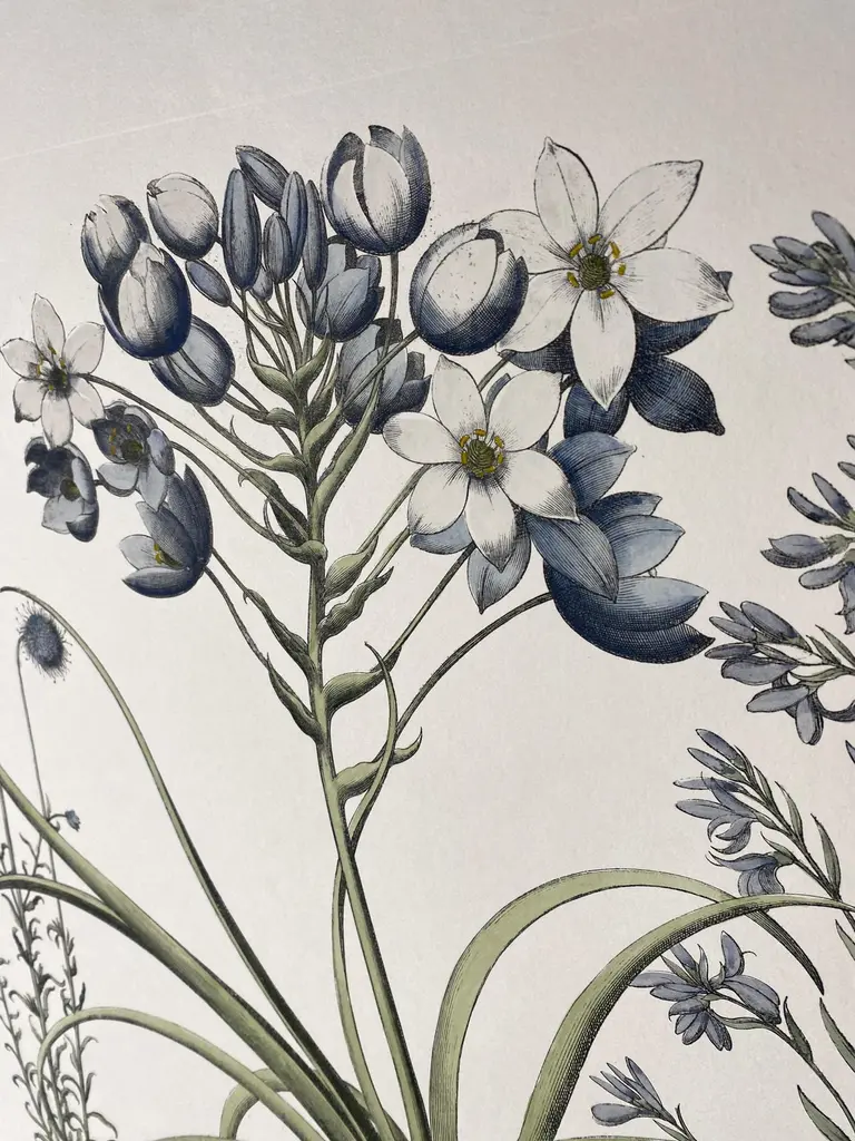 Print from the Collection Botanique Bulbacee representing Ornithogalum, enriched with blue colors and nuances of watercolor.Another different Bulbacee flowers prints are available to create a colourful composition.The collection i composed by:- Iris- Crocus and Lilium- Tulipa and Allium- Papaver - Tulipa and Narcissus- Paeonia- Iris and Viola- Paeonia Peregrina- Ornithogalum- Iris Latifoliaprint measure: 48.5 cm x 40.5 cm (Cod 386B)All the prints are completely hand-coloured by our skilled craftsmen in Florence, Italy.Printed manually on 100% cotton engraving paper in Florence Italy.Each print is entirely painted by hand with water colors and tempera.It is a furnishing accessory that enhances the environment and adapts to many decorative styles.Artecornici design produces hand colored art prints, artisan frames, lightings, decorative accessories and furniture. All our products are designed and produced in Florence by Italian master craftsmen.With an experience of over 40 years, Artecornici design creates high-quality handmade frames using precious woods and working various types of high-quality finishes, lacquers and ageing, offering a vast choice of models.Each print is an artisanal Florentine product, reproducing images of the European 18th and 19th centuries with the same printing techniques (engraving with a star press), the golden age of prints, which are then finished and watercoloured exclusively by handThe richness of our work lies in the ability to make our customers' requests our own, creating products with personalized, unique, and precious creations, renewing our collections year after year.
