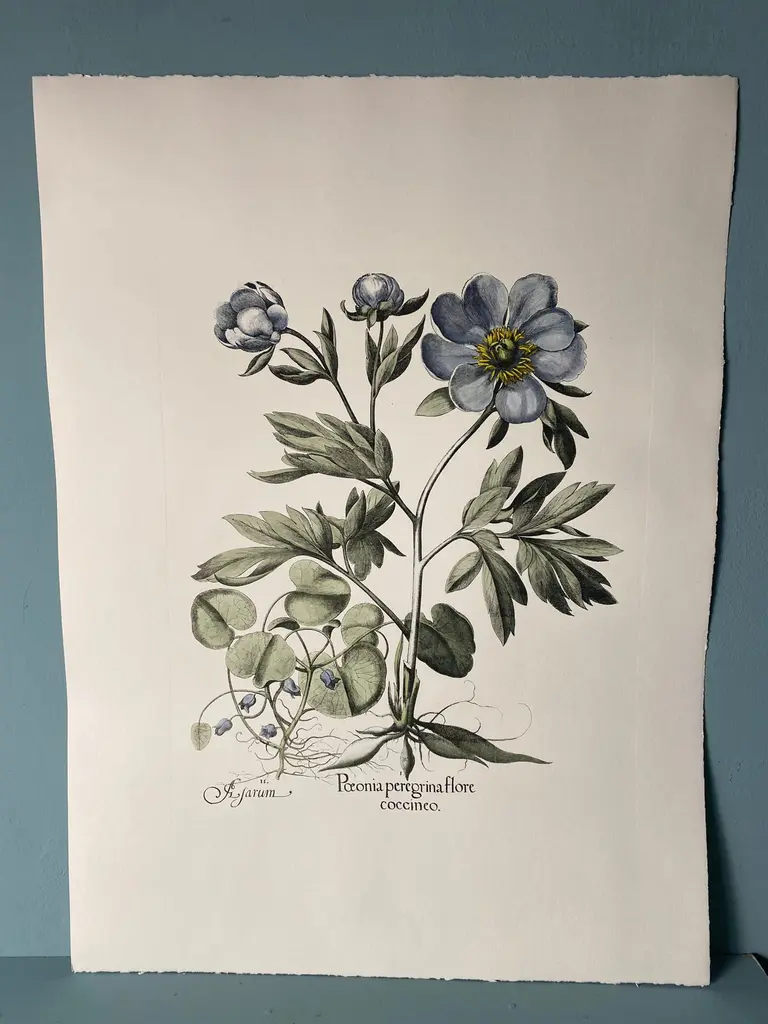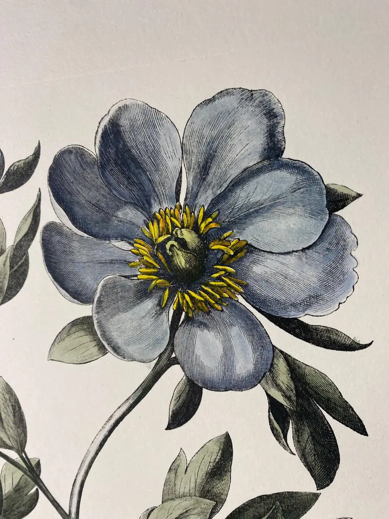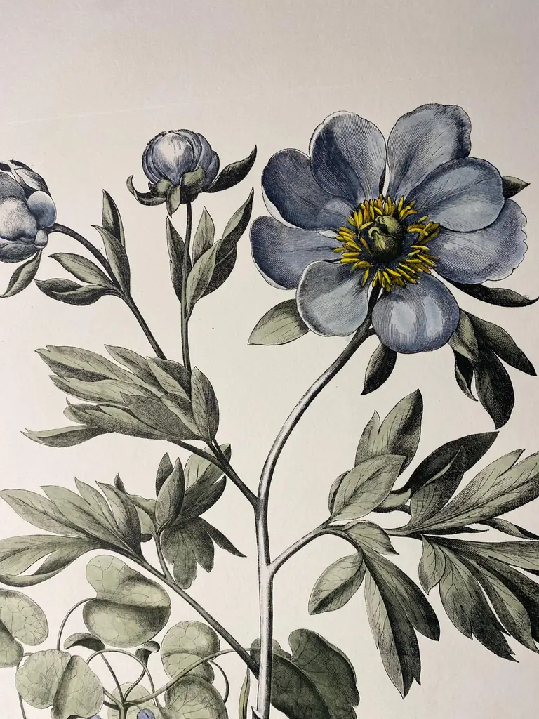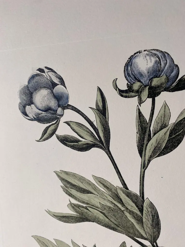 Print from the Collection Botanique Bulbacee representing Paeonia Peregrina, enriched with blue colors and nuances of watercolor.Another different Bulbacee flowers prints are available to create a colourful composition.The collection i composed by:- Iris- Crocus and Lilium- Tulipa and Allium- Papaver - Tulipa and Narcissus- Paeonia- Iris and Viola- Paeonia Peregrina- Ornitholgalum- Iris Latifoliaprint measure: 48.5 cm x 40.5 cm (Cod 386B)All the prints are completely hand-coloured by our skilled craftsmen in Florence, Italy.Printed manually on 100% cotton engraving paper in Florence Italy.Each print is entirely painted by hand with water colors and tempera.It is a furnishing accessory that enhances the environment and adapts to many decorative styles.Artecornici design produces hand colored art prints, artisan frames, lightings, decorative accessories and furniture. All our products are designed and produced in Florence by Italian master craftsmen.With an experience of over 40 years, Artecornici design creates high-quality handmade frames using precious woods and working various types of high-quality finishes, lacquers and ageing, offering a vast choice of models.Each print is an artisanal Florentine product, reproducing images of the European 18th and 19th centuries with the same printing techniques (engraving with a star press), the golden age of prints, which are then finished and watercoloured exclusively by handThe richness of our work lies in the ability to make our customers' requests our own, creating products with personalized, unique, and precious creations, renewing our collections year after year.