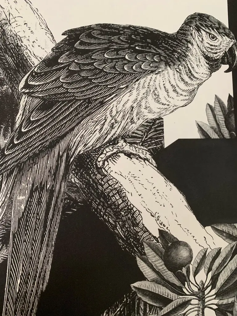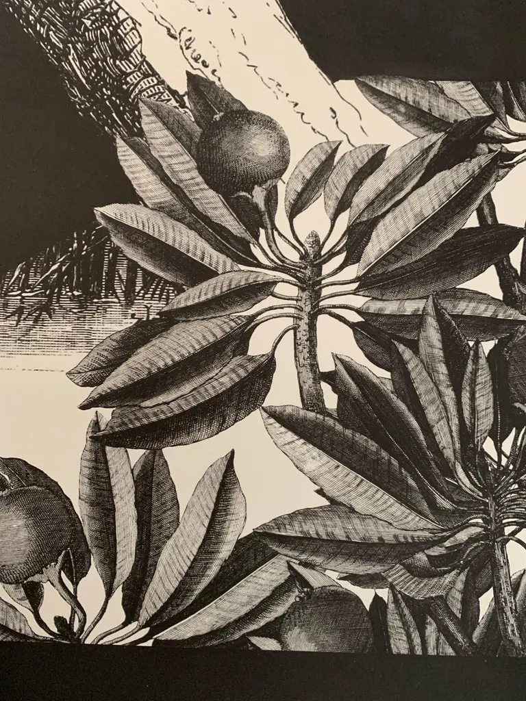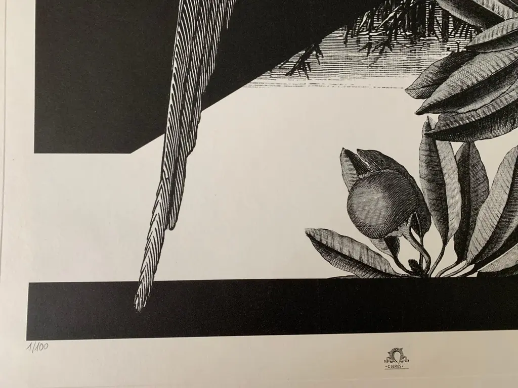 From the limited edition series ''Black & Wild''. Black and white image of tropical fauna and flora handprinted using an antique press on a 100% cotton engraving paper. Panthers rhinos and tropical birds pose against a lush background of palms.Numbered edition of 100 pieces.Taupe mat with hand detailing in black. Available all collection with different animals.Designer black lacquered frame angled molding and corners enhanced with partial frame.Completely produced in Florence, Italy by Artecornici design .rtecornici design produces hand colored art prints, artisan frames, lightings, decorative accessories and furniture. All our products are designed and produced in Florence by Italian master craftsmen.