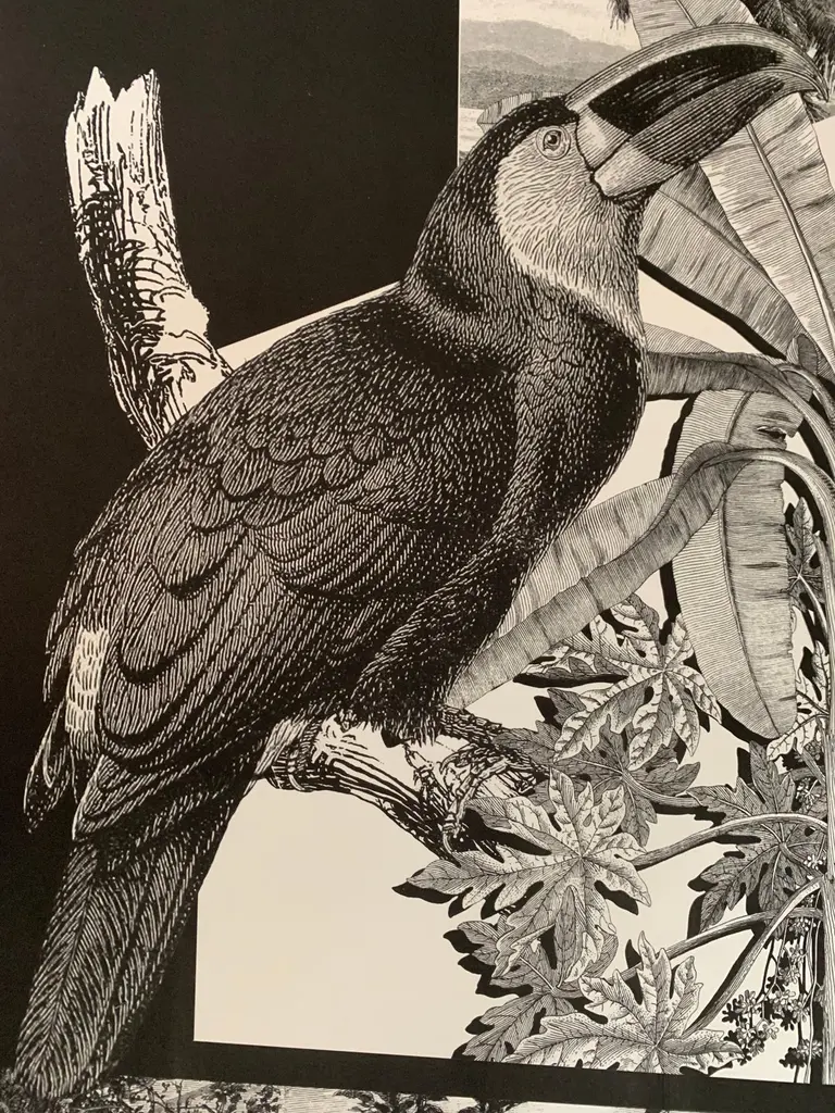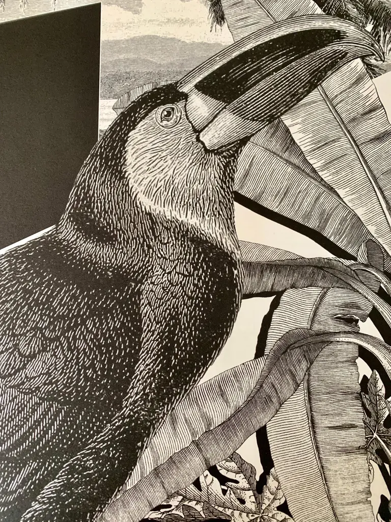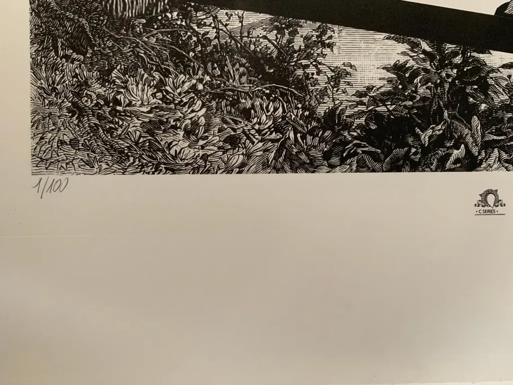 From the limited edition series ''Black & Wild''. Black and white image of tropical fauna and flora handprinted using an antique press on a 100% cotton engraving paper. Panthers rhinos and tropical birds pose against a lush background of palms.Numbered edition of 100 pieces.Taupe mat with hand detailing in black.Designer Black lacquered frame angled molding and corners enhanced with partial frame. Available all collection composed by six different animals.Hand made in Florence, Italy by Artecornici design.Artecornici design produces hand colored art prints, artisan frames, lightings, decorative accessories and furniture. All our products are designed and produced in Florence by Italian master craftsmen.