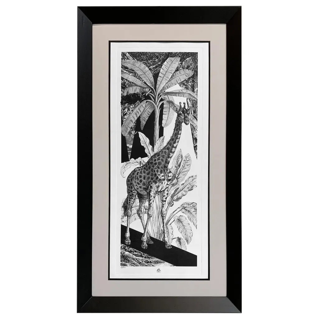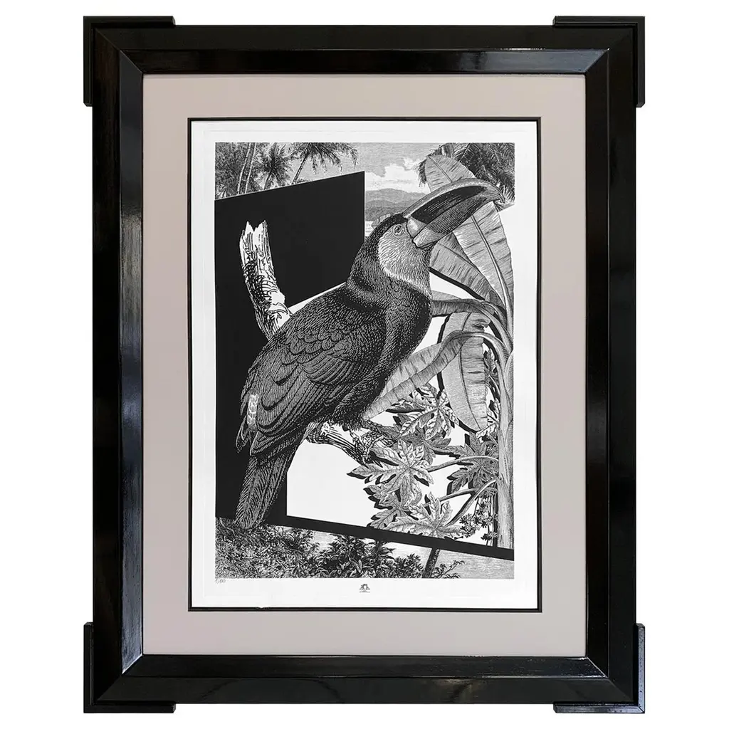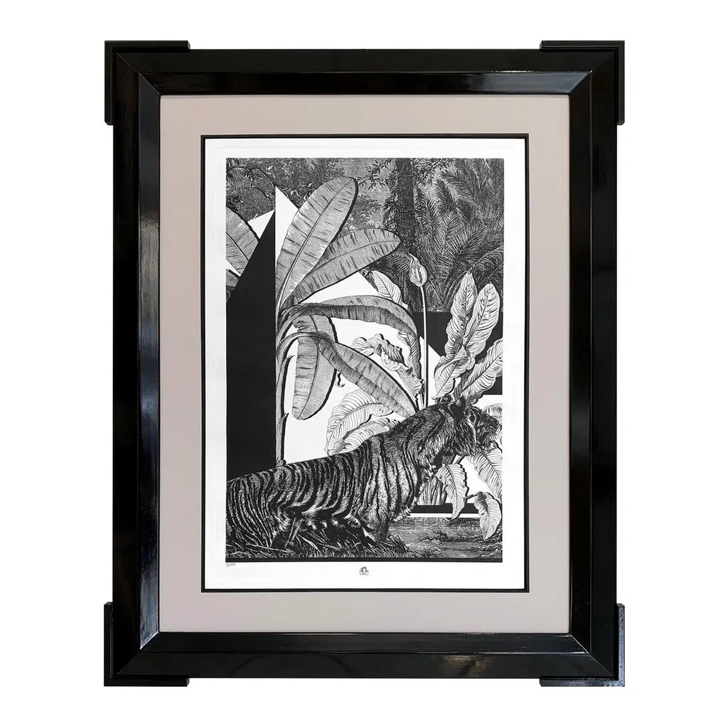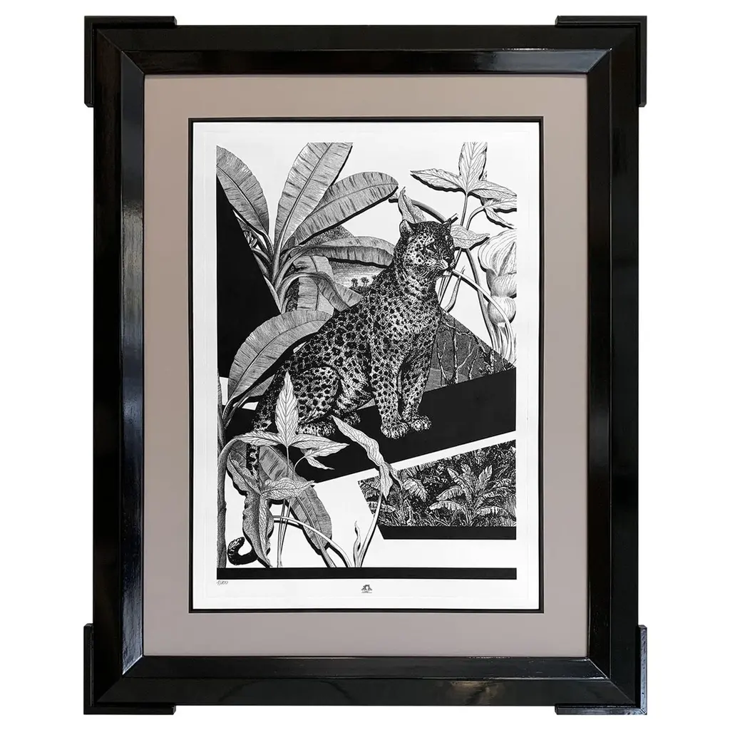 From the limited edition series ''Black & Wild''. Black and white image of tropical fauna and flora handprinted with an antique press on 100% cotton engraving paper. Panthers rhinos and tropical birds pose against a lush background of palms.Numbered edition of 100 pieces.Taupe mat with hand detailing in black.Designer Black lacquered frame angled molding and corners enhanced with partial frame.Completely produced in Florence, Italy by Artecornice design.Completely produced in Florence, Italy. Artecornici design produces hand colored art prints, artisan frames, lightings, decorative accessories and furniture. All our products are designed and produced in Florence by Italian master craftsmen.