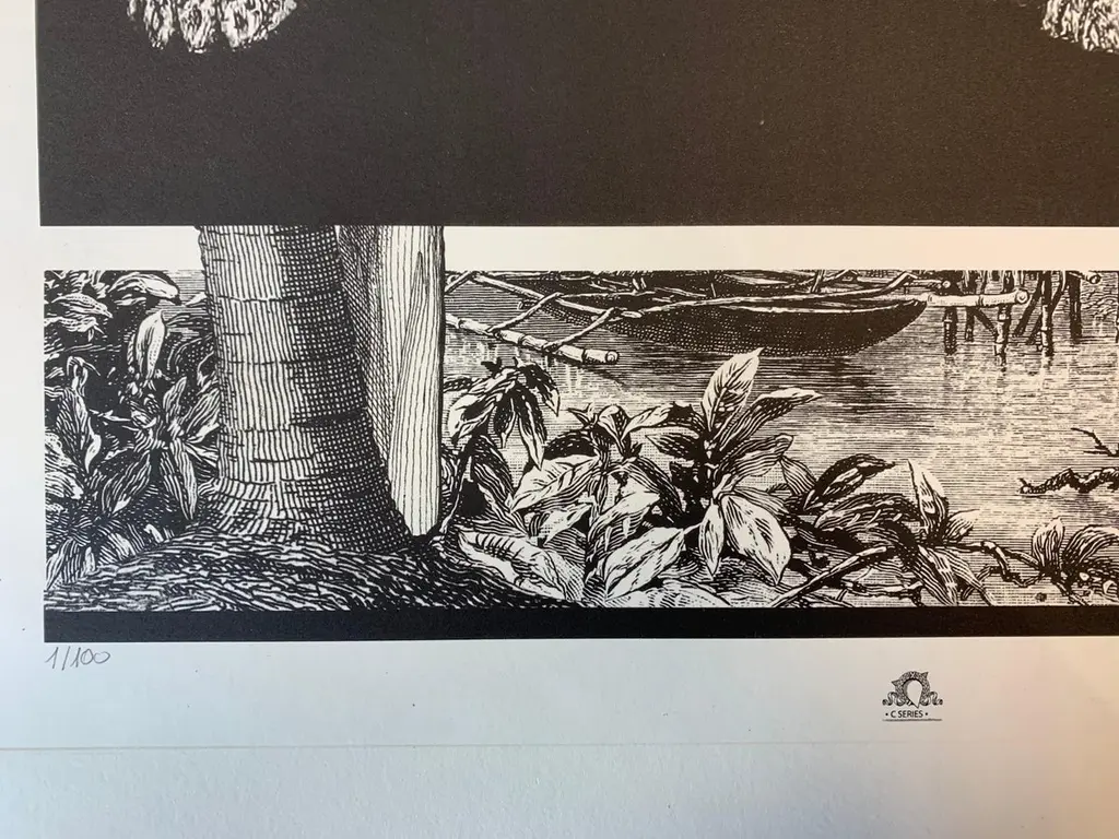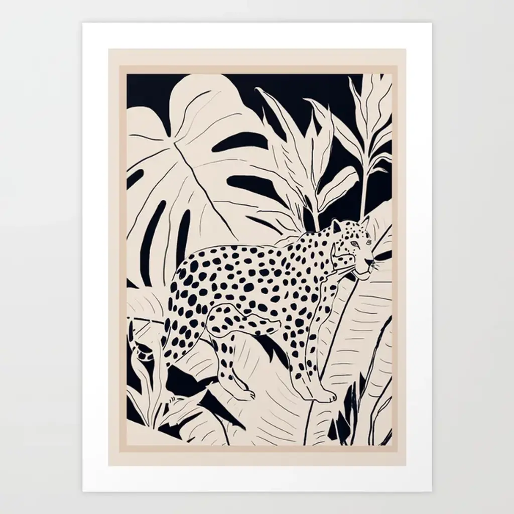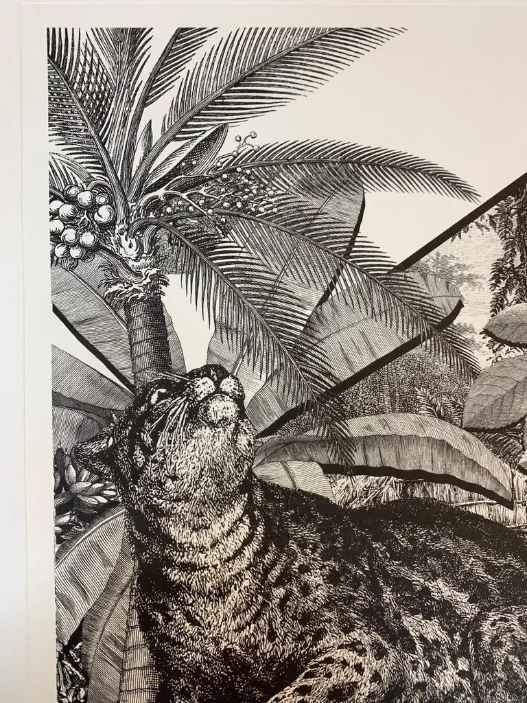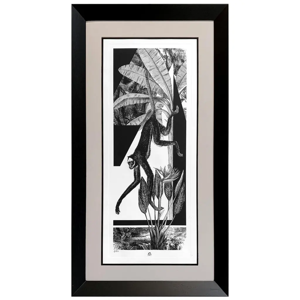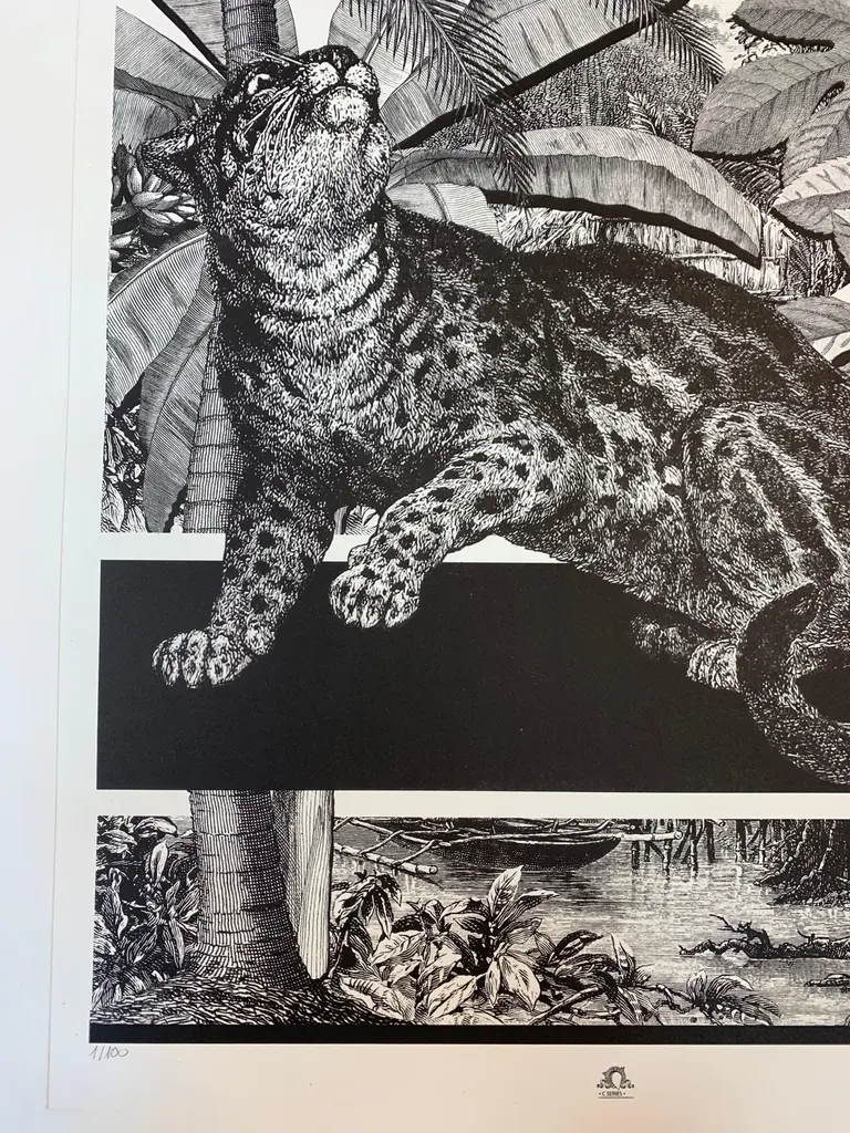 From the limited edition series ''Black & Wild''. Black and white image of tropical fauna and flora handprinted with an antique press on 100% cotton engraving paper. Panthers rhinos and tropical birds pose against a lush background of palms.Numbered edition of 100 pieces.Taupe mat with hand detailing in black.Designer Black lacquered frame angled molding and corners enhanced with partial frame.Completely produced in Florence, Italy by Artecornice design.Completely produced in Florence, Italy. Artecornici design produces hand colored art prints, artisan frames, lightings, decorative accessories and furniture. All our products are designed and produced in Florence by Italian master craftsmen.