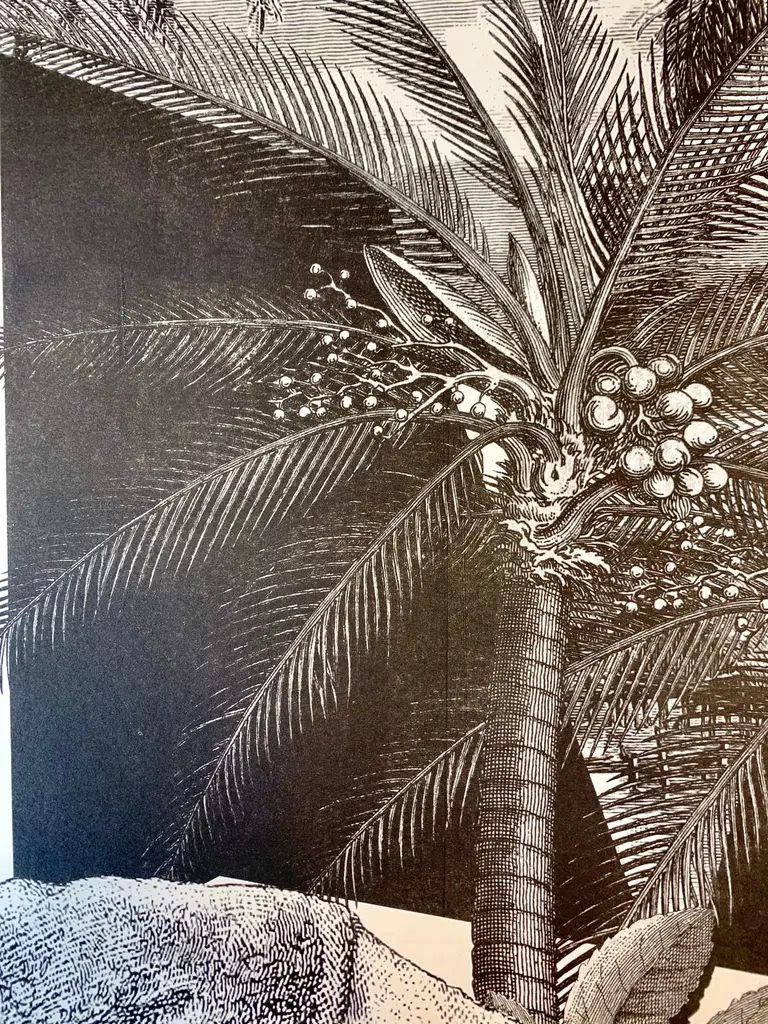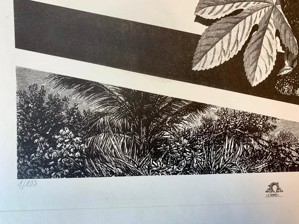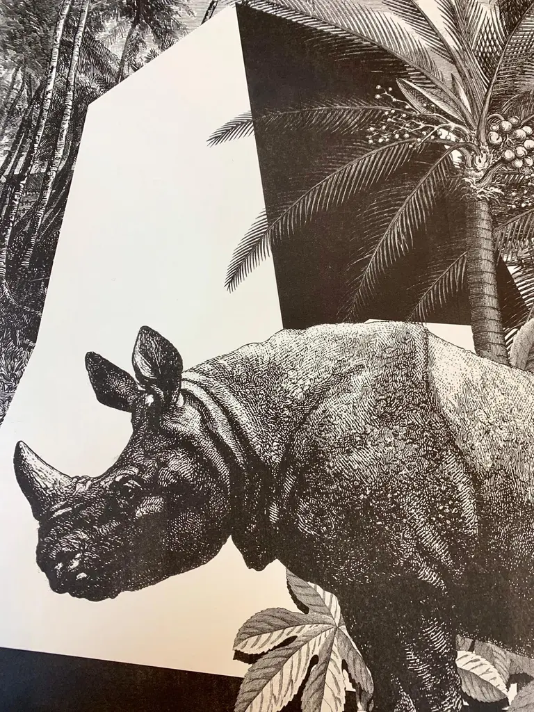 From the limited edition series ''Black & Wild''. Black and white image of tropical fauna and flora handprinted with an antique press on 100% cotton engraving paper. Panthers rhinos and tropical birds pose against a lush background of palms.Numbered edition of 100 pieces.Taupe mat with hand detailing in black.Designer black lacquered frame angled molding and corners enhanced with partial frame.Completely produced in Florence Italy by Artecornici design.Artecornici design produces hand colored art prints, artisan frames, lightings, decorative accessories and furniture. All our products are designed and produced in Florence by Italian master craftsmen.