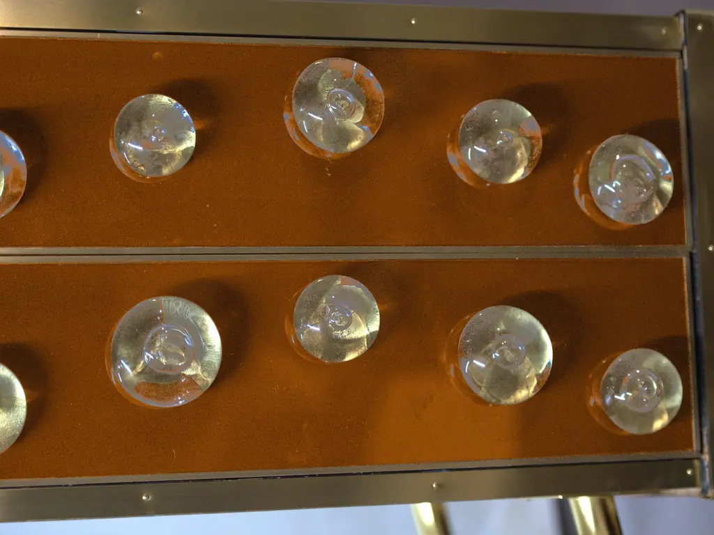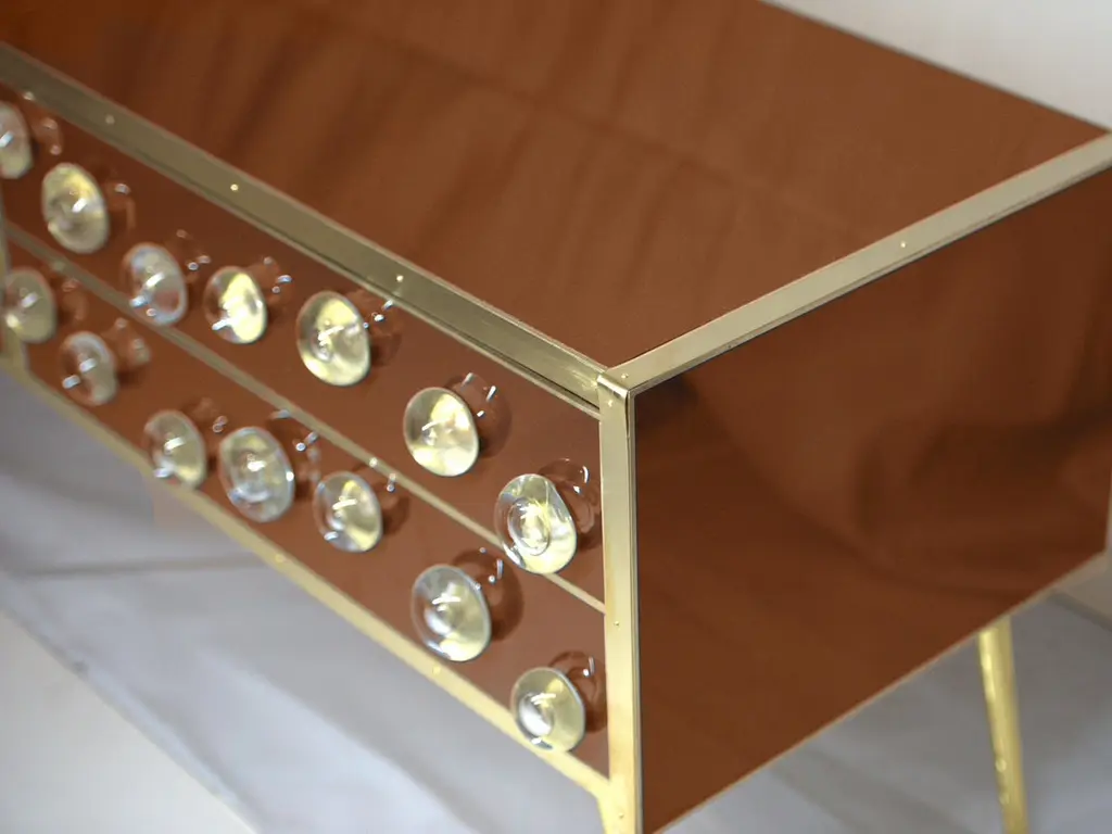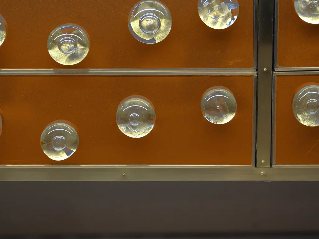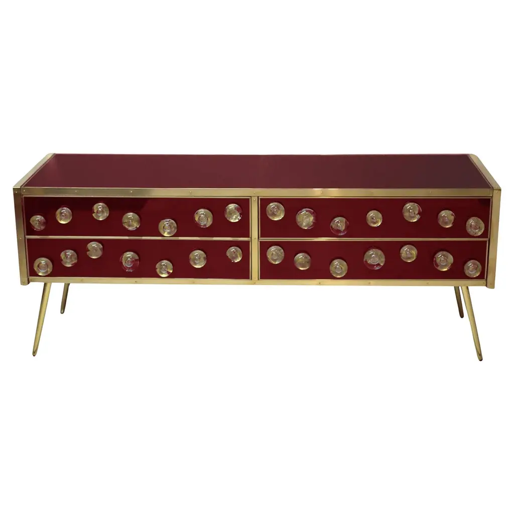 This Mid-Century Italian sideboard is an extraordinary blend of modern design and traditional craftsmanship, featuring a solid birch frame adorned with 28 exquisite Murano glass spheres. The sideboard's brass feet add a touch of elegance, while brown Murano glass provides a rich, luxurious finish. Handcrafted in Italy, this piece flaunts meticulous techniques such as painting and hand carving, reflecting the timeless beauty of Italian art. With four spacious drawers, it offers functionality and style. Originally unveiled at the Milan Furniture Fair in 2020, this sideboard embodies the essence of mid-century Italian design, making it a valuable addition to any sophisticated interior. Production takes 6-7 weeks to ensure that each piece is made to perfection.