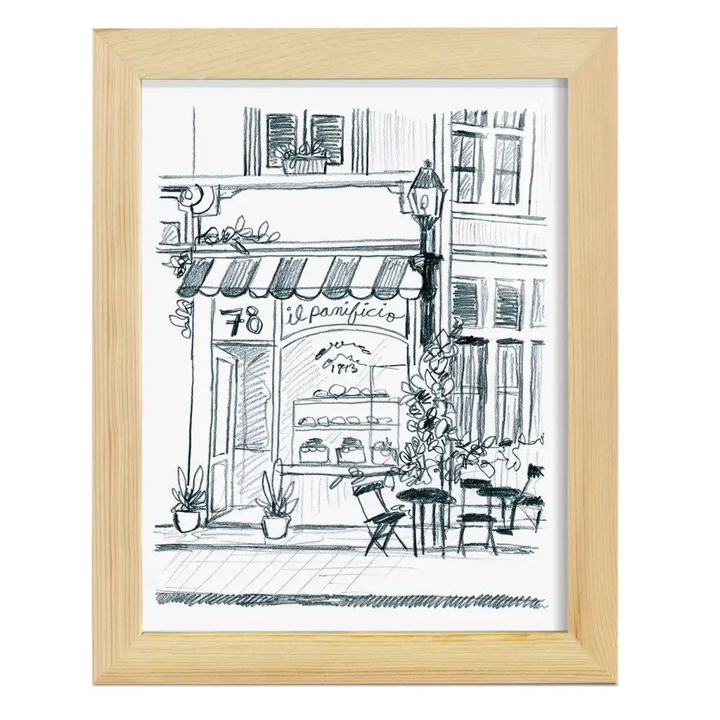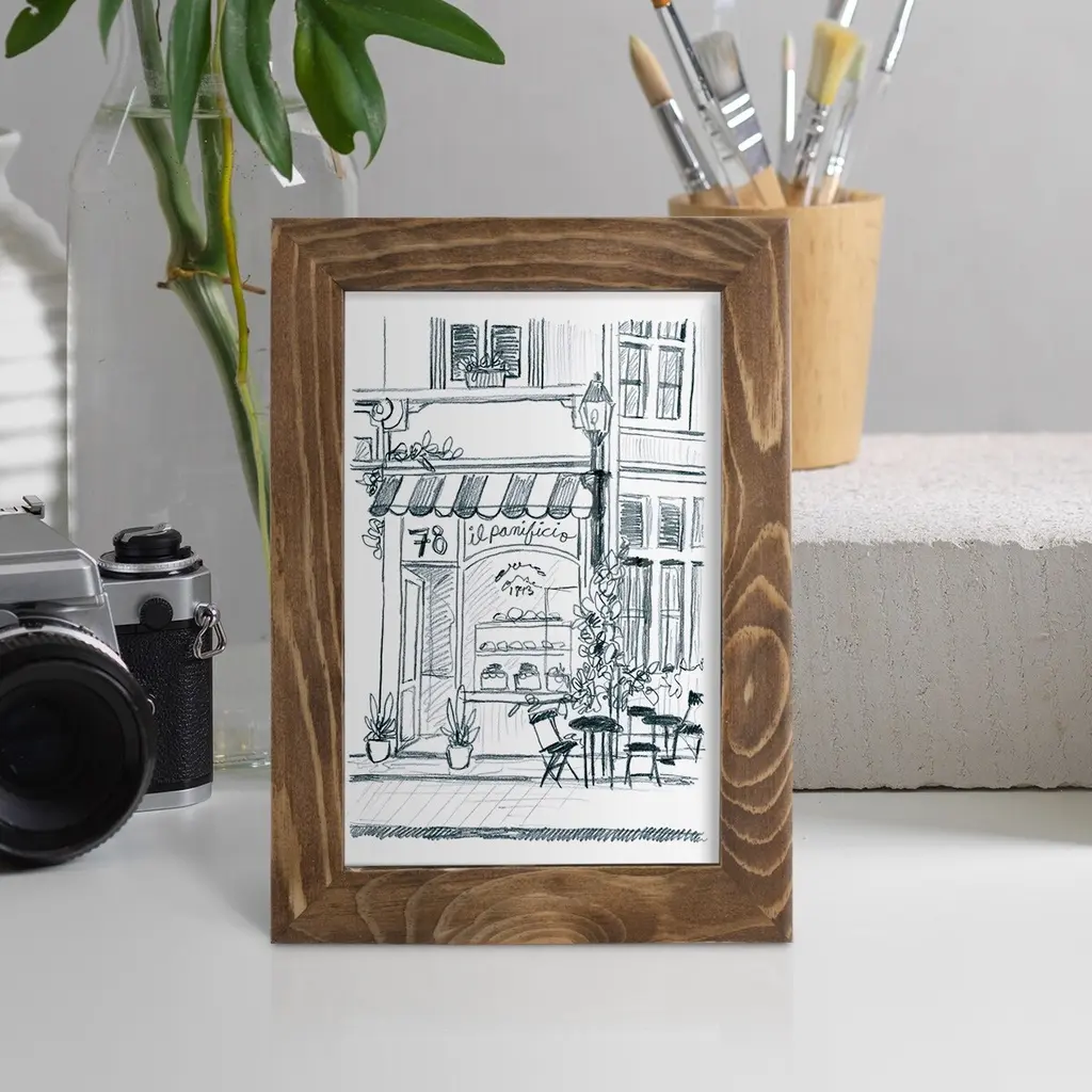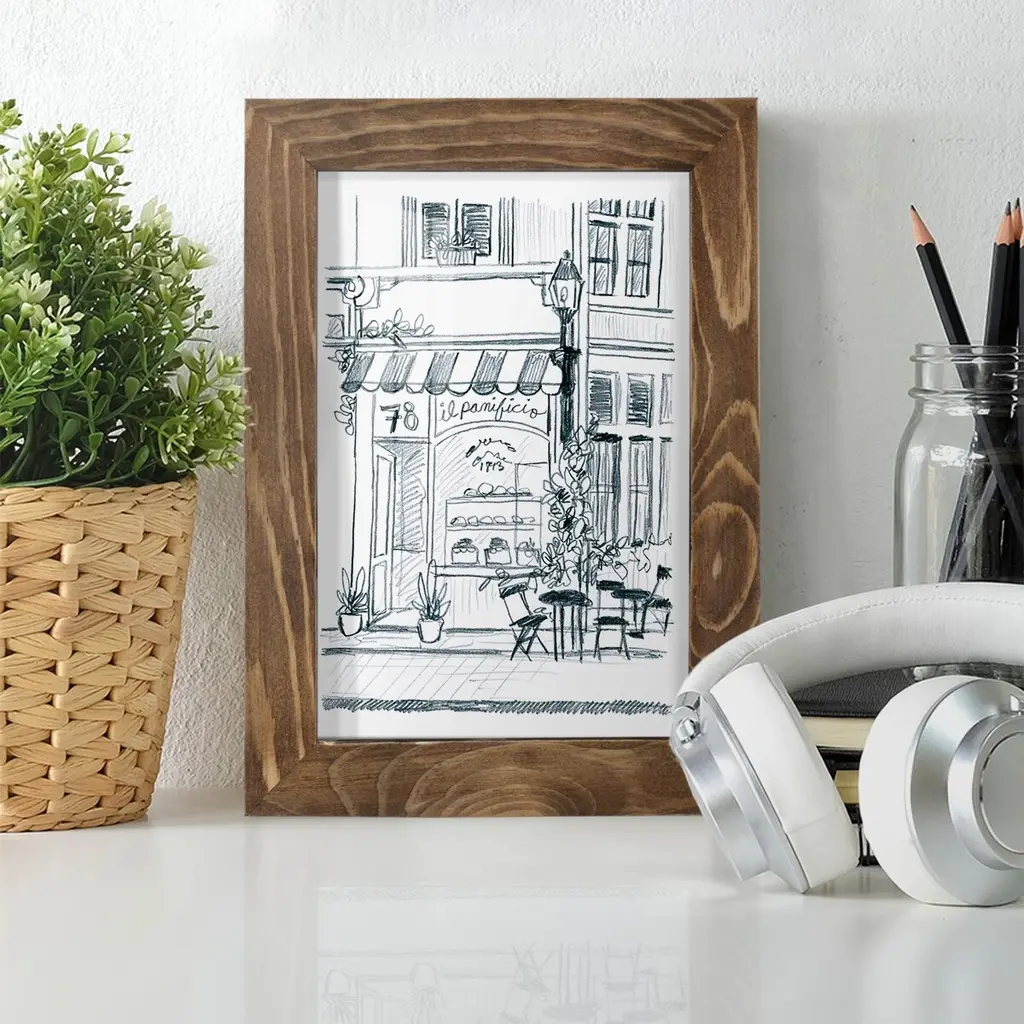Italian Street Sketch I -EZ SWITCH Framed Print w/glass-Cherry Red A delightful, framed print. Featuring a solid wood frame with real wood glass. This premium print is giclee quality. In addition, every frame features a removable back and table top stand. This allows you to change your art in the future or to just stand the art on a table for a new look. We are sure you'll enjoy our new series of EZ SWITCH Framed Art. Solid Wood Frame Real Glass Removable / Replaceable Art Built in Tabletop Stand Sizes range from 4x6 up to 12x15 - buy just one or pair them up as sets as you see fit.