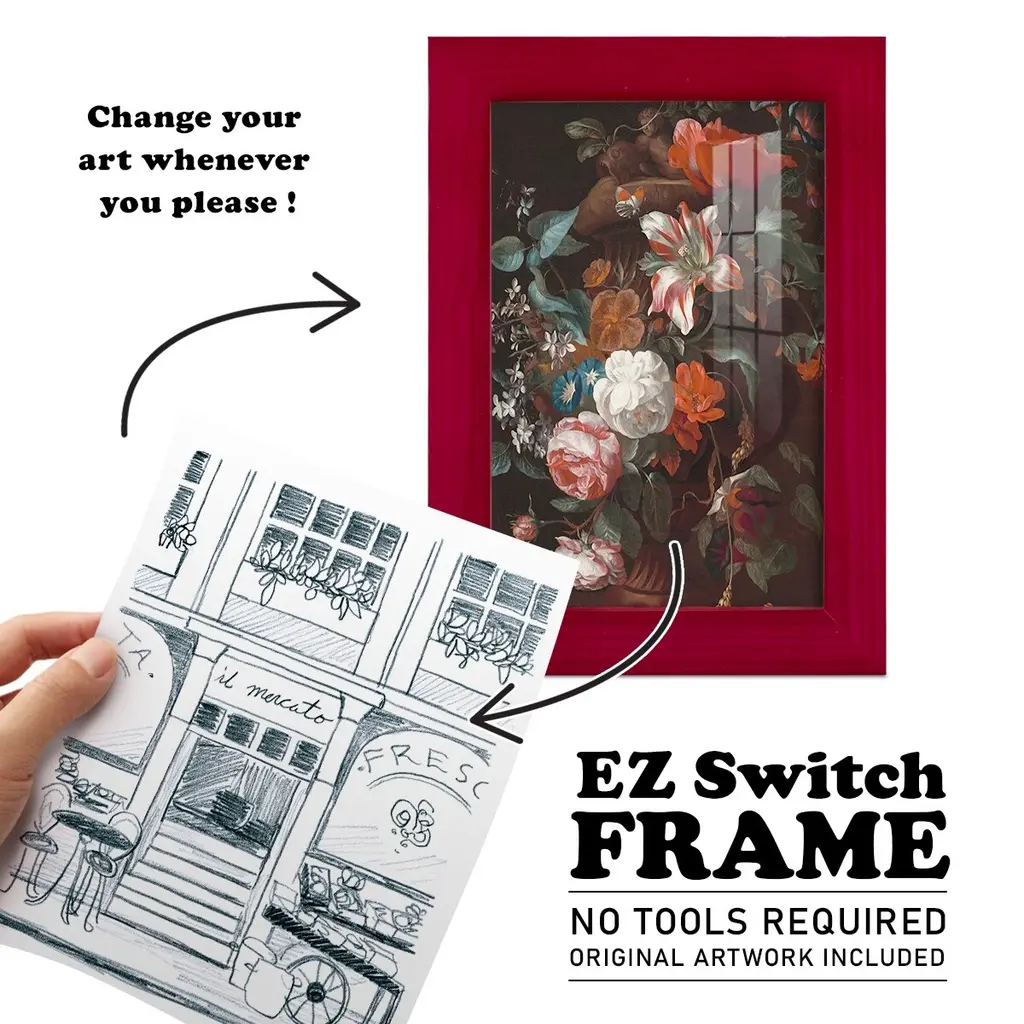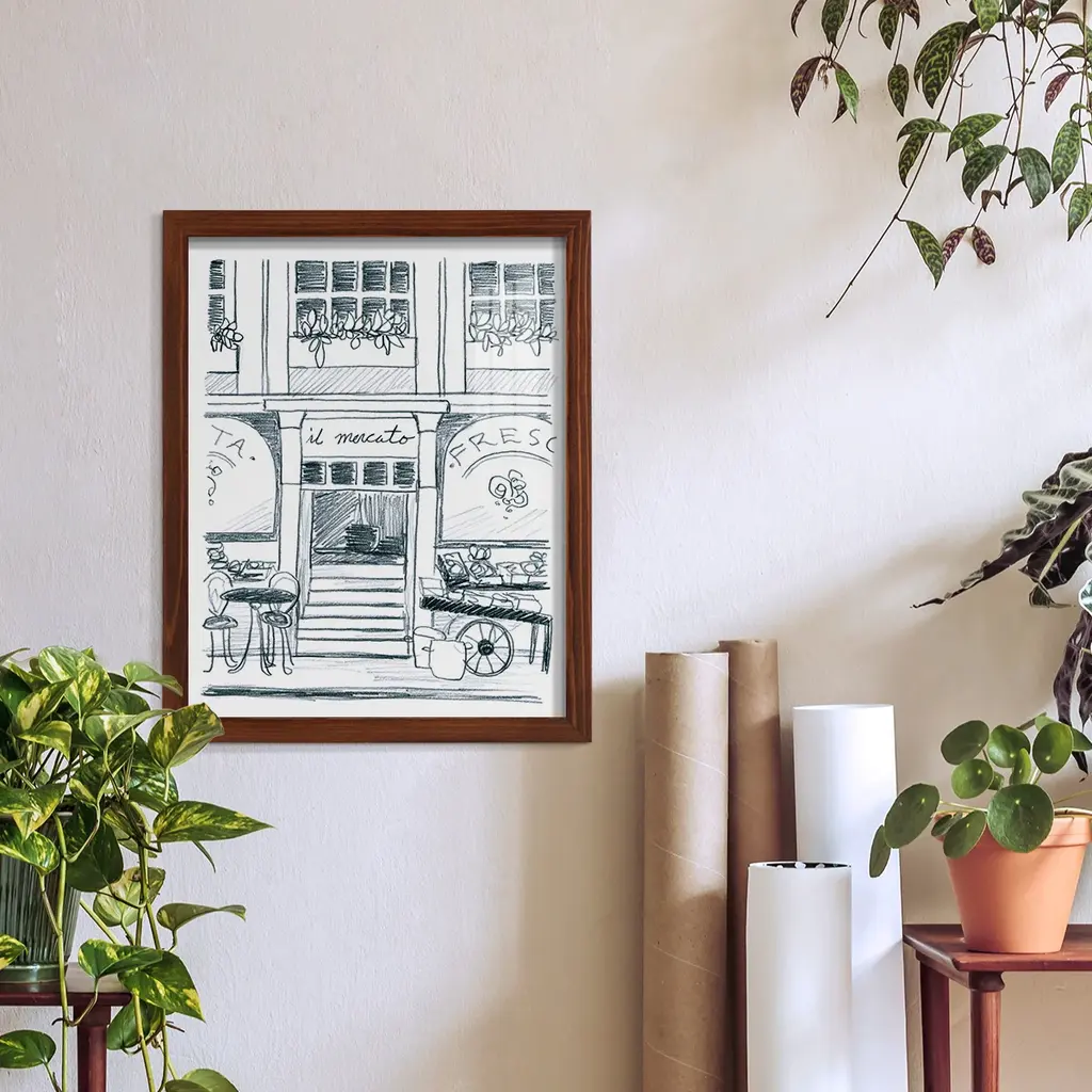 Italian Street Sketch IV -EZ SWITCH Framed Print w/glass-Cherry Red A delightful, framed print. Featuring a solid wood frame with real wood glass. This premium print is giclee quality. In addition, every frame features a removable back and table top stand. This allows you to change your art in the future or to just stand the art on a table for a new look. We are sure you'll enjoy our new series of EZ SWITCH Framed Art. Solid Wood Frame Real Glass Removable / Replaceable Art Built in Tabletop Stand Sizes range from 4x6 up to 12x15 - buy just one or pair them up as sets as you see fit.