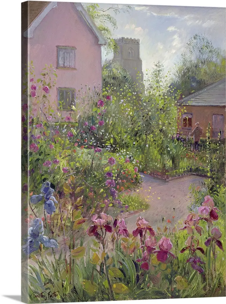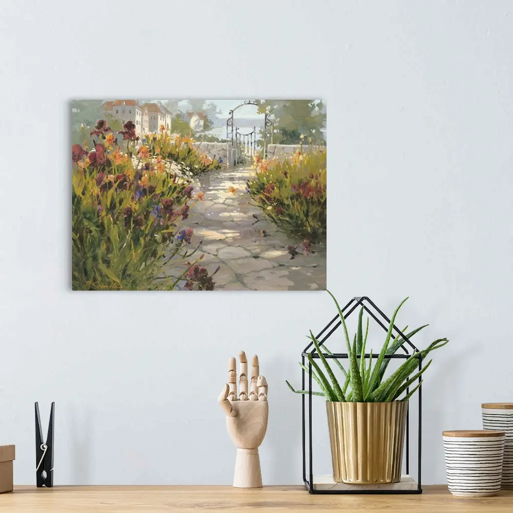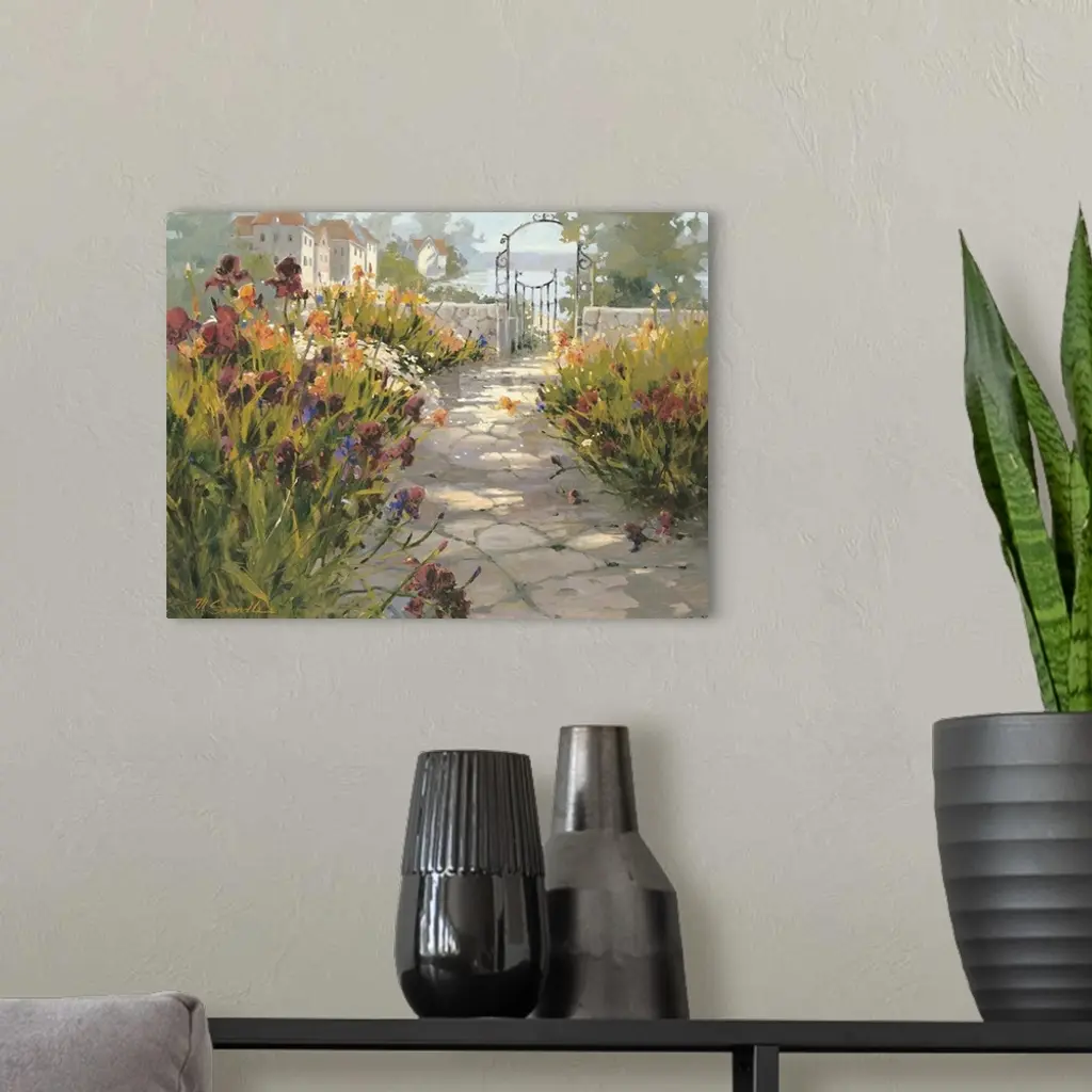Contemporary painting of an old Italian village garden, with stone path leading to garden entrance.