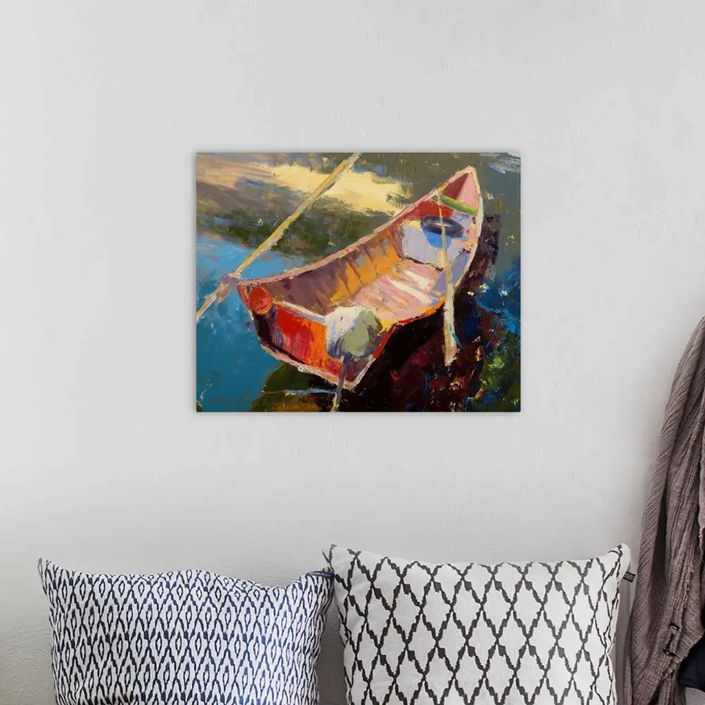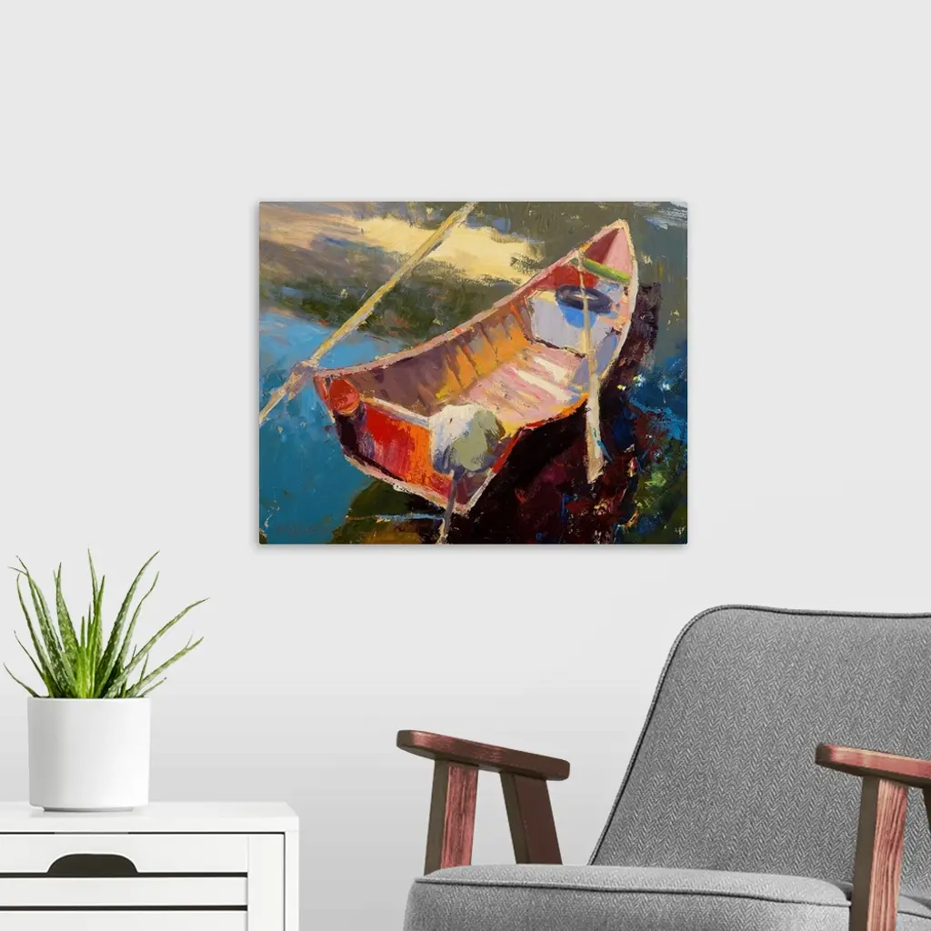 A contemporary coastal themed painting of a row boat sitting in still water.