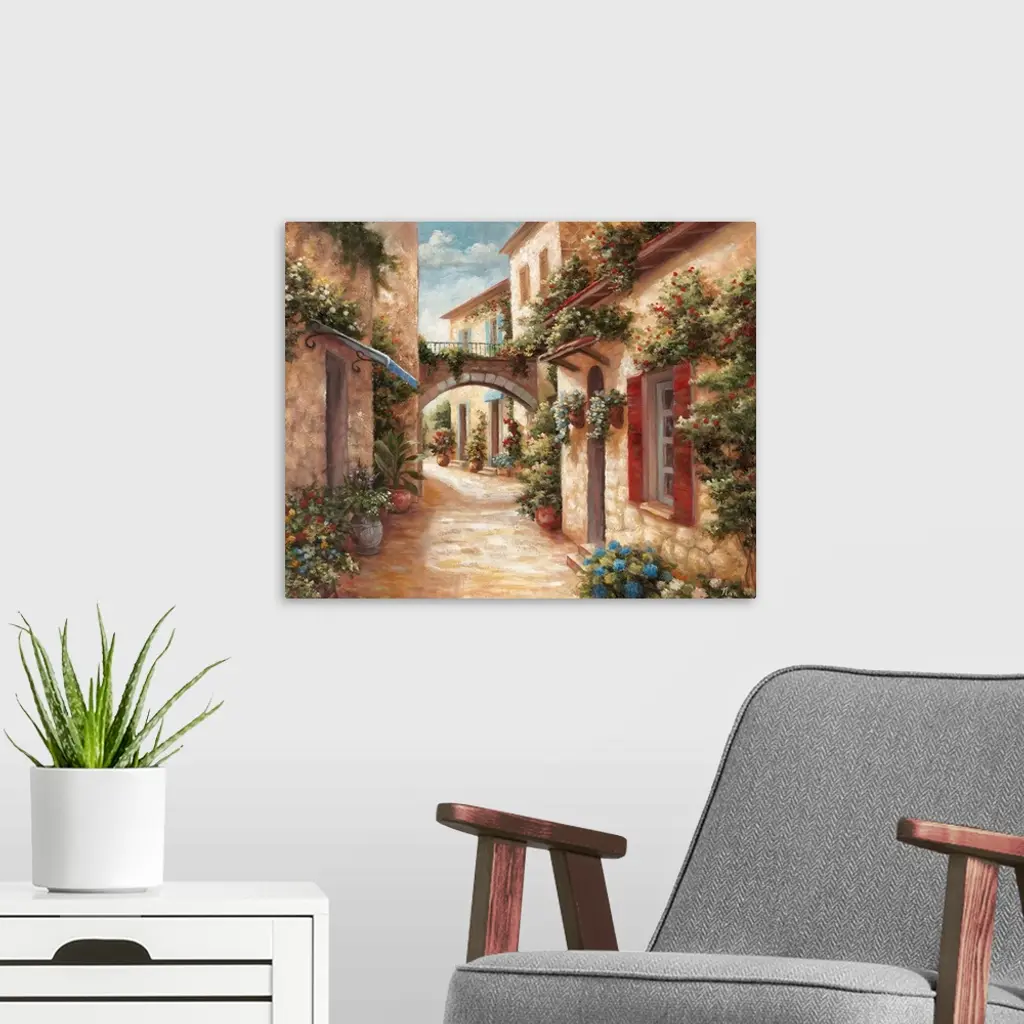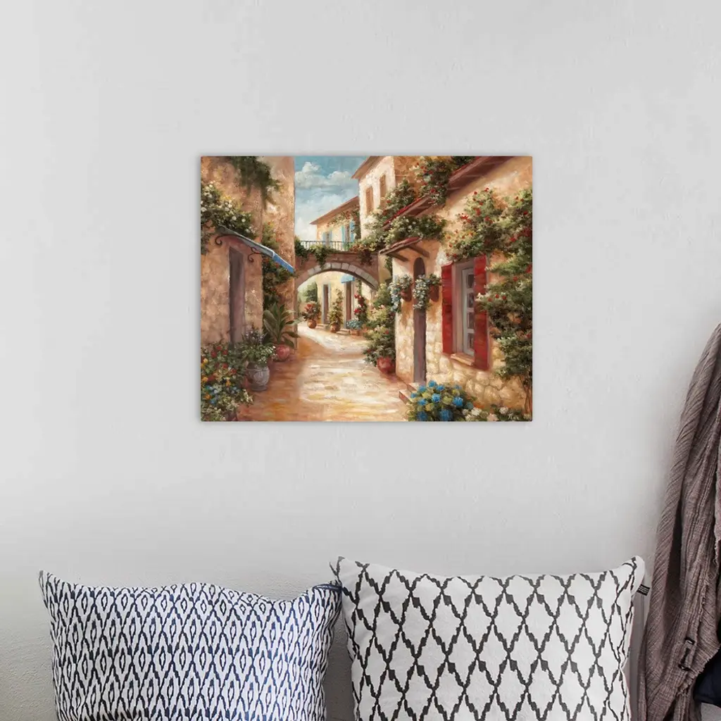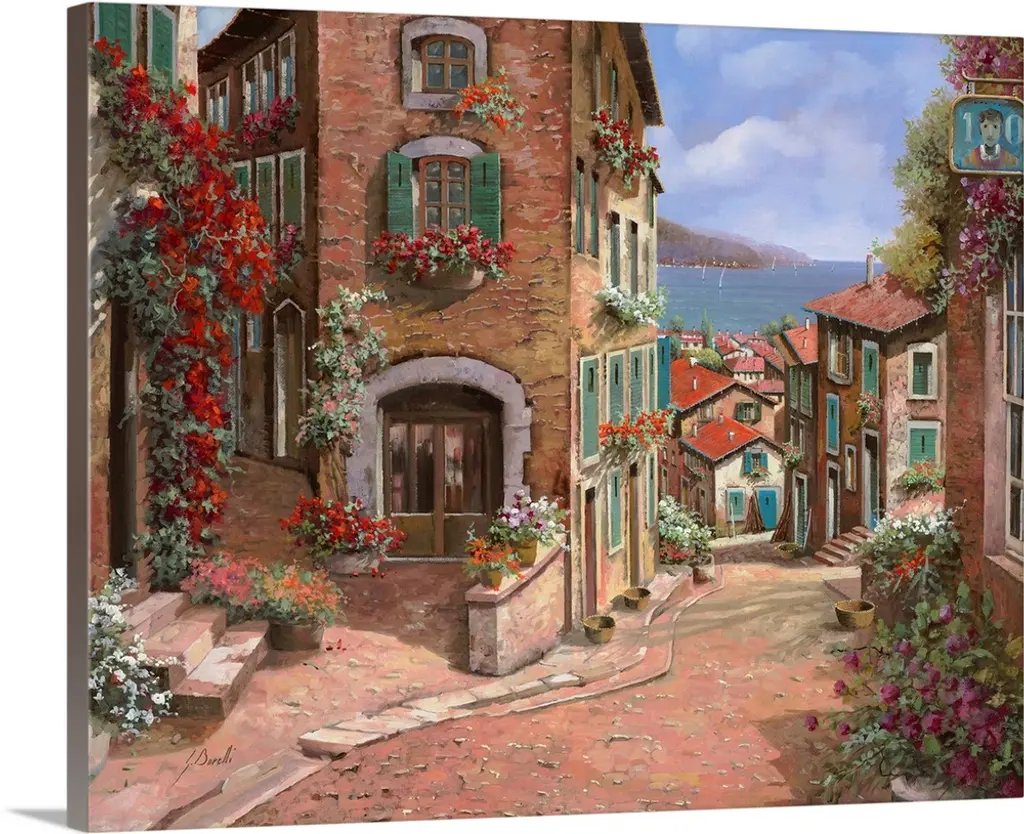 A traditional style painting of a cobblestone alleyway in an Italian village, with doors and windows surrounded by flowers.