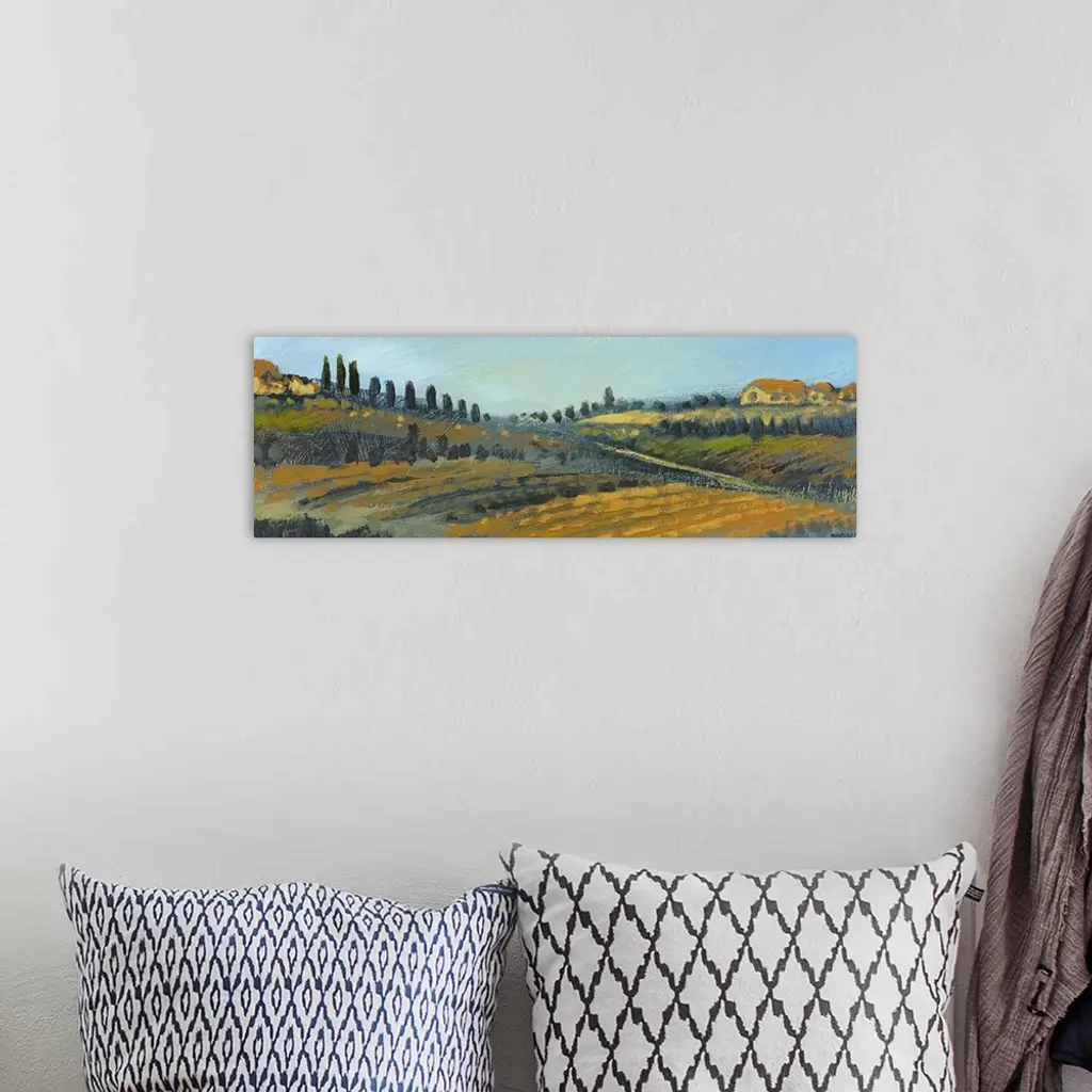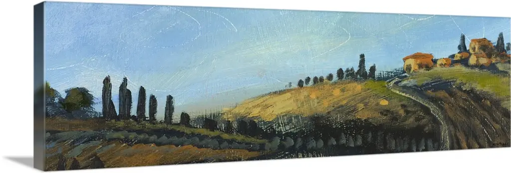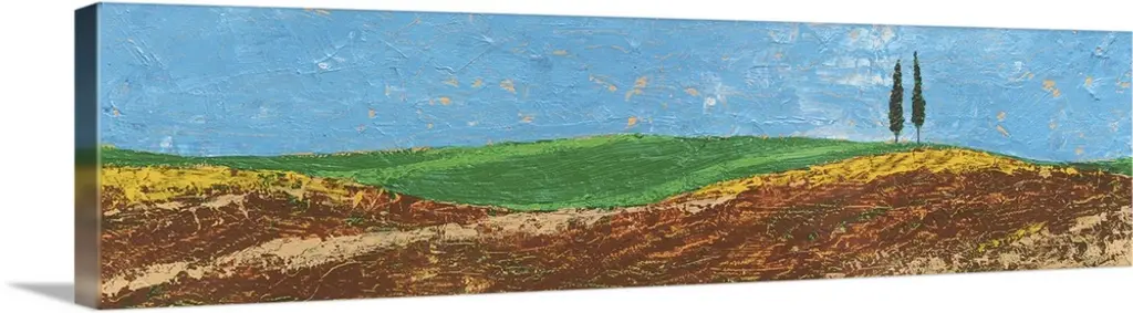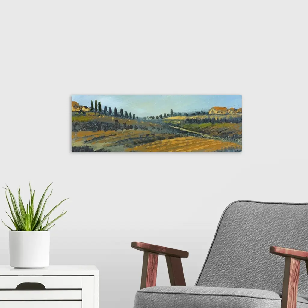 Panoramic painting of countryside with rolling hills with rowed fills lined with tall skinny cypress trees.