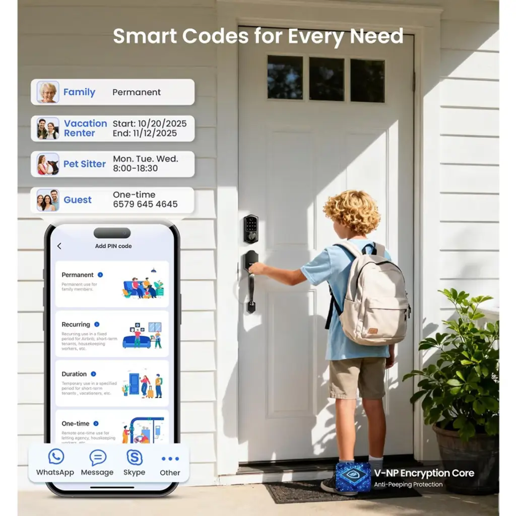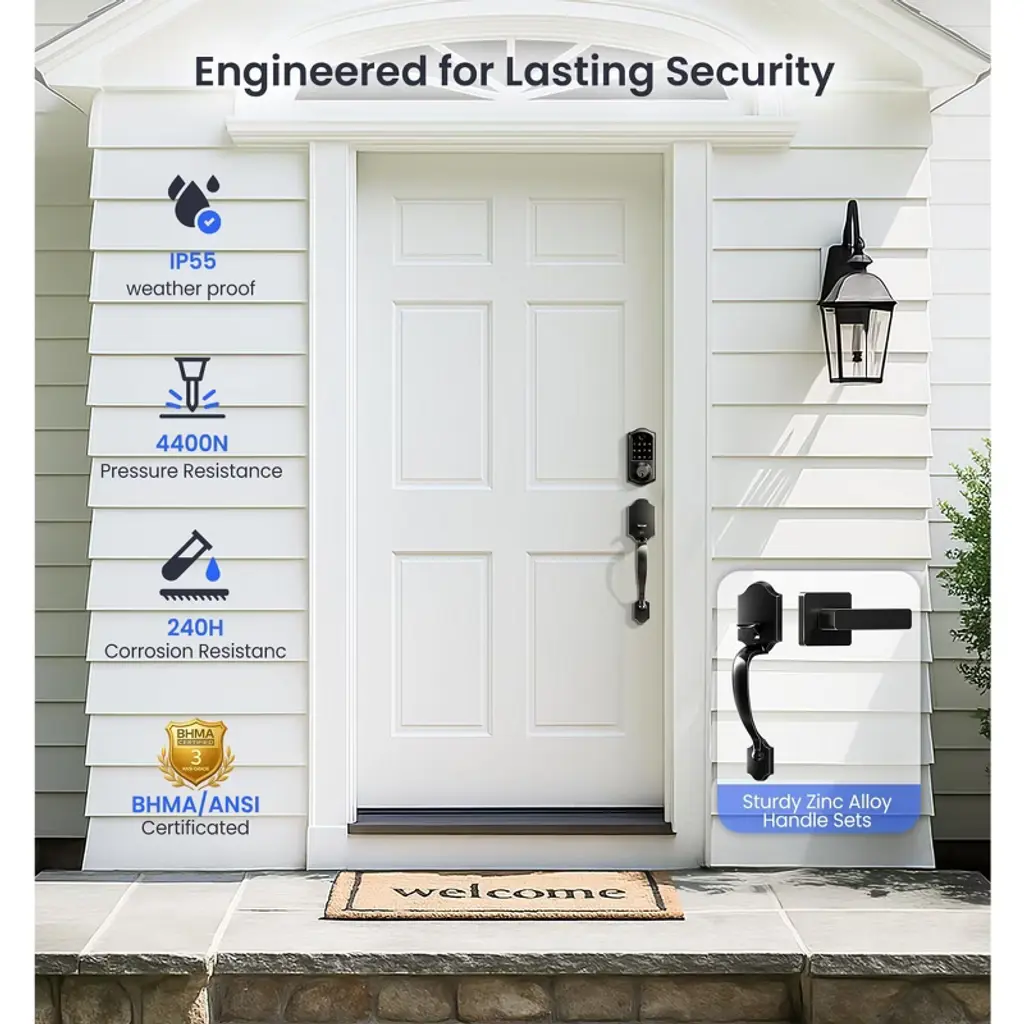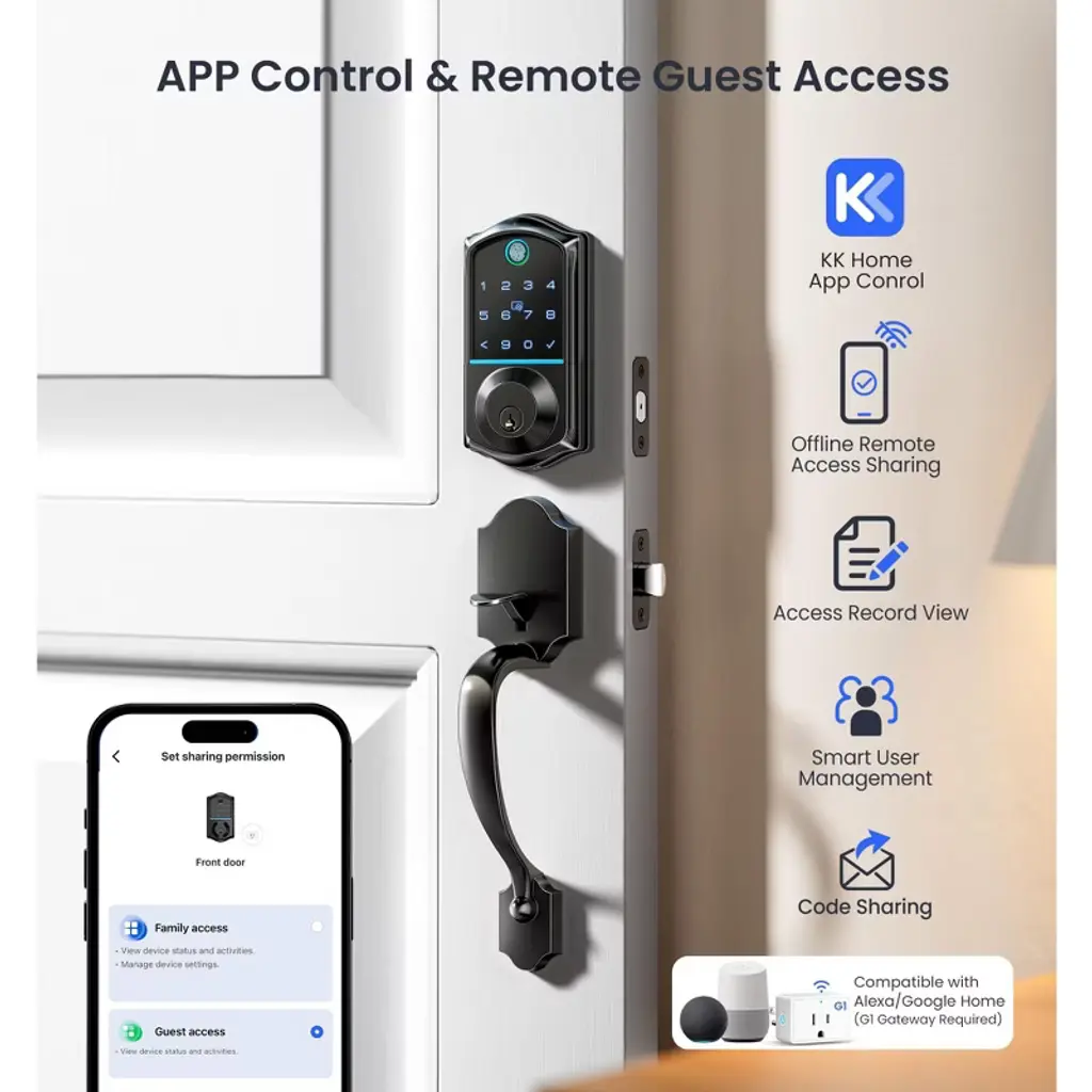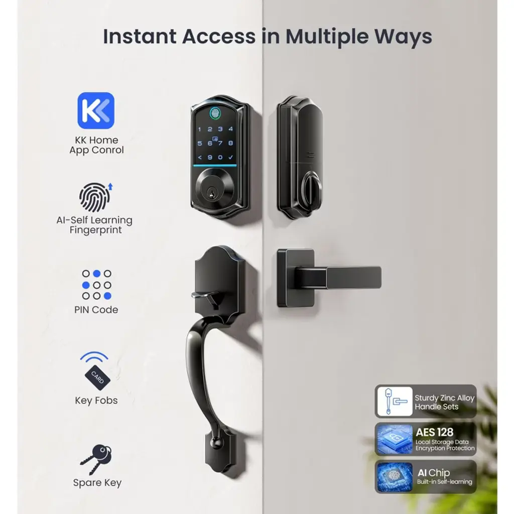 Upgrade your home security with this smart front door lock set. It offers five unlock and lock options, including app control, fingerprint, password, fobs, and traditional keys, providing flexibility and convenience. The app allows you to remotely manage access, generate temporary codes, and share keys, with support for English, Spanish, and French voice announcements. High - level security is ensured by AES - 128 encryption for biometric data and an IP55 rating to withstand extreme weather. Installation is a breeze, taking only 15 minutes and fitting both left - handed and right - handed US - standard doors. For modern living, it can be integrated with a separate gateway for full smart home control, offering voice commands, remote unlocking, and activity logs. Whether you're a homeowner, vacation rental host, or property manager, this lock is a great addition to your home, enhancing security and convenience.