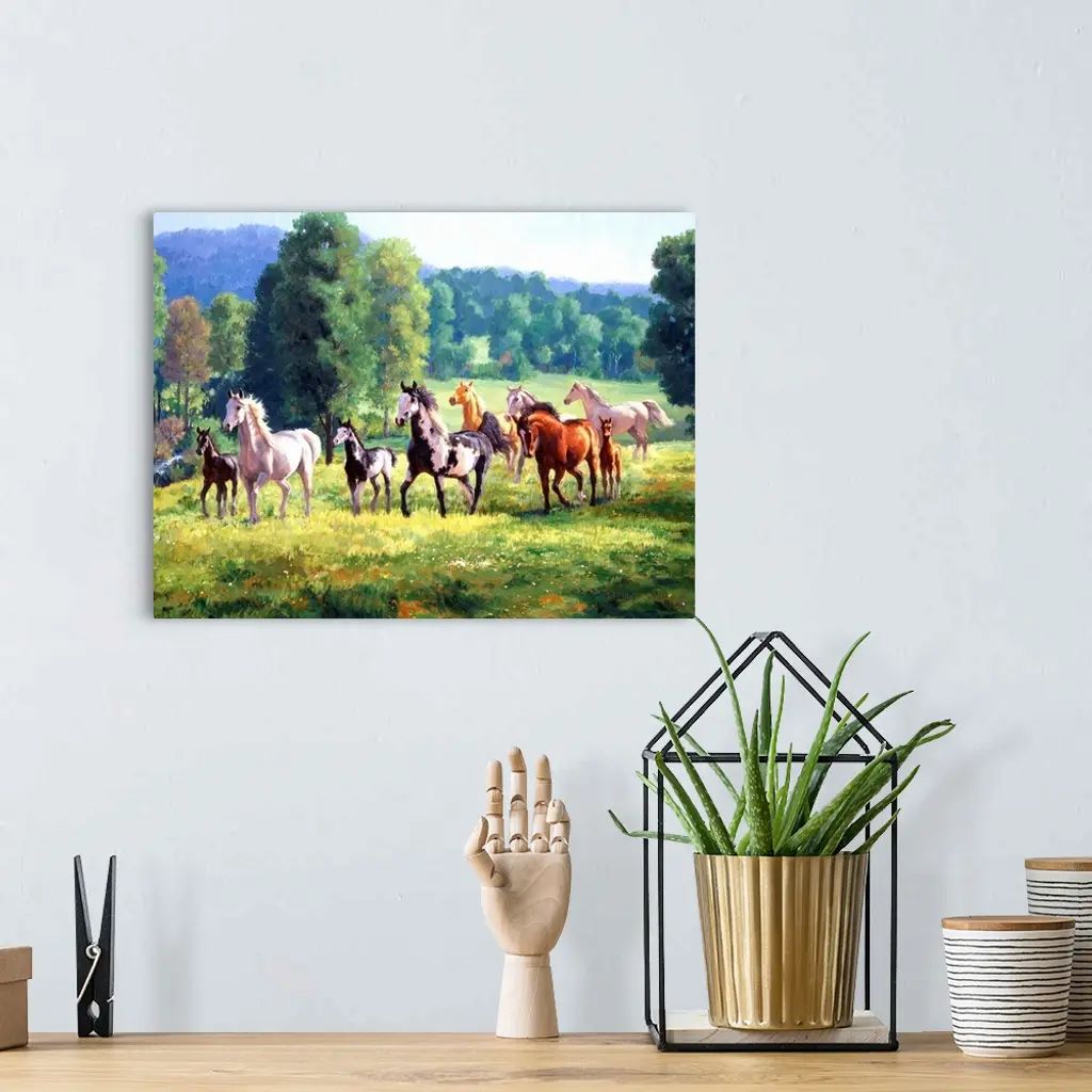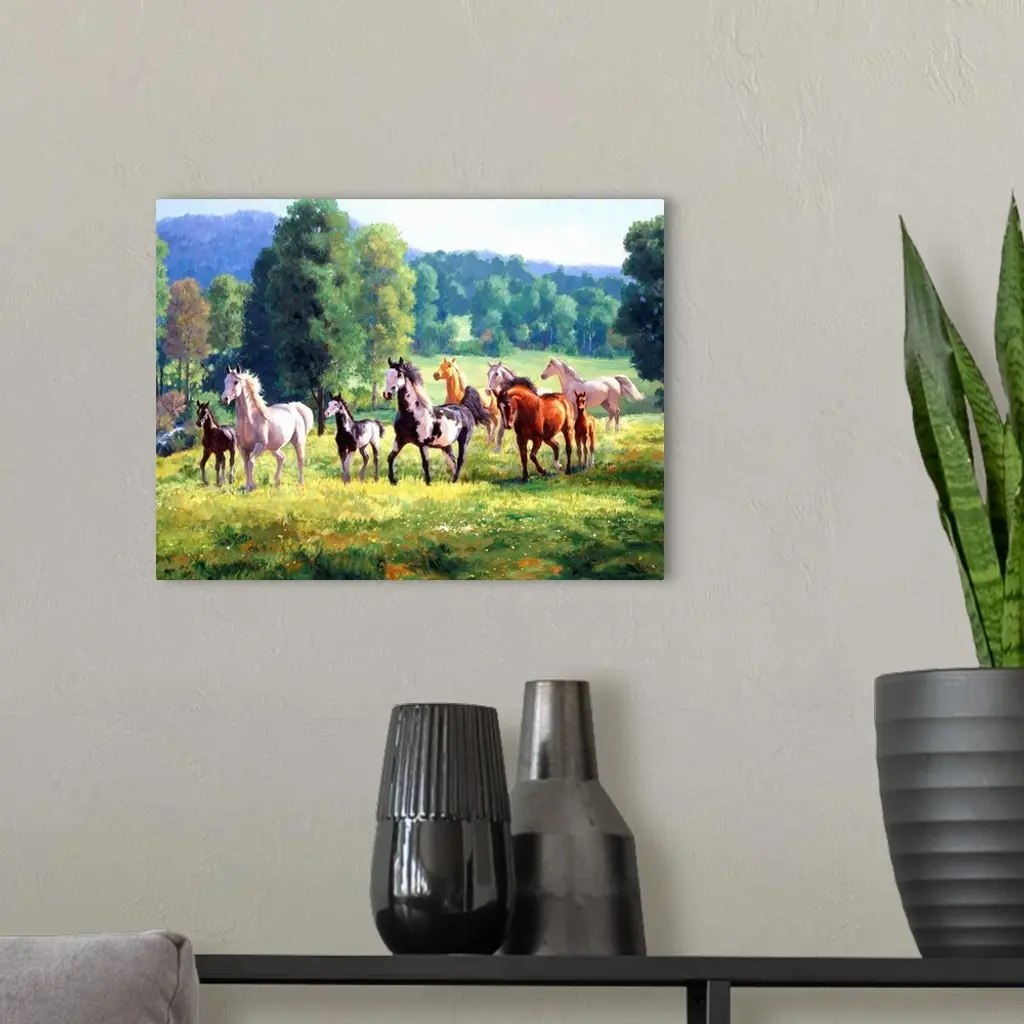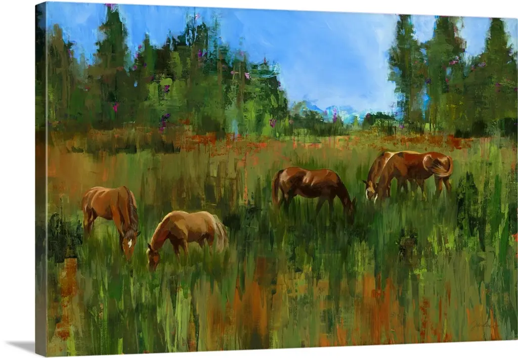 Contemporary colorful painting of a herd of horses in a countryside clearing.