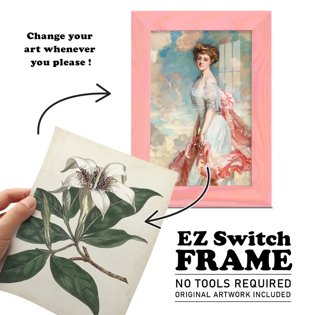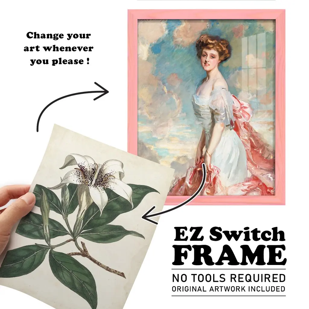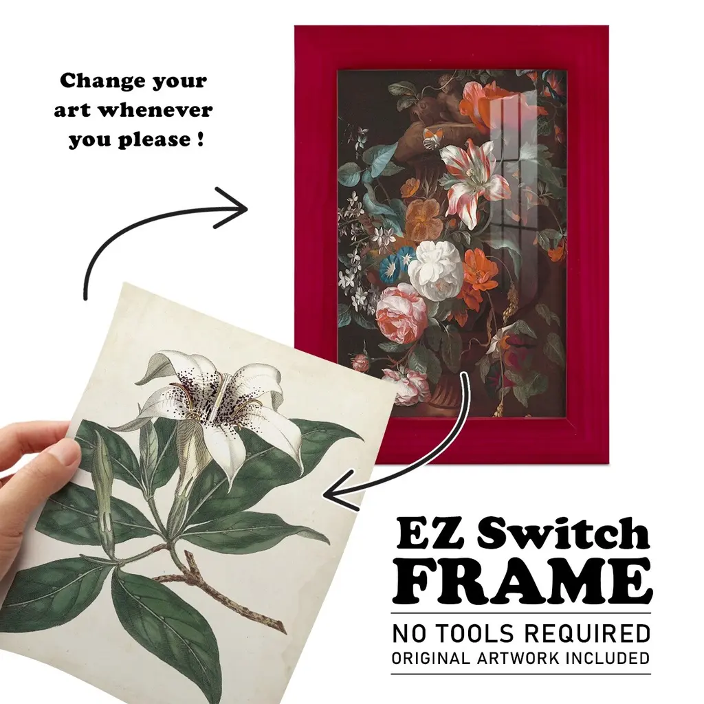 Ivory Garden I -EZ SWITCH Framed Print w/glass-Cherry Red A delightful, framed print. Featuring a solid wood frame with real wood glass. This premium print is giclee quality. In addition, every frame features a removable back and table top stand. This allows you to change your art in the future or to just stand the art on a table for a new look. We are sure you'll enjoy our new series of EZ SWITCH Framed Art. Solid Wood Frame Real Glass Removable / Replaceable Art Built in Tabletop Stand Sizes range from 4x6 up to 12x15 - buy just one or pair them up as sets as you see fit.