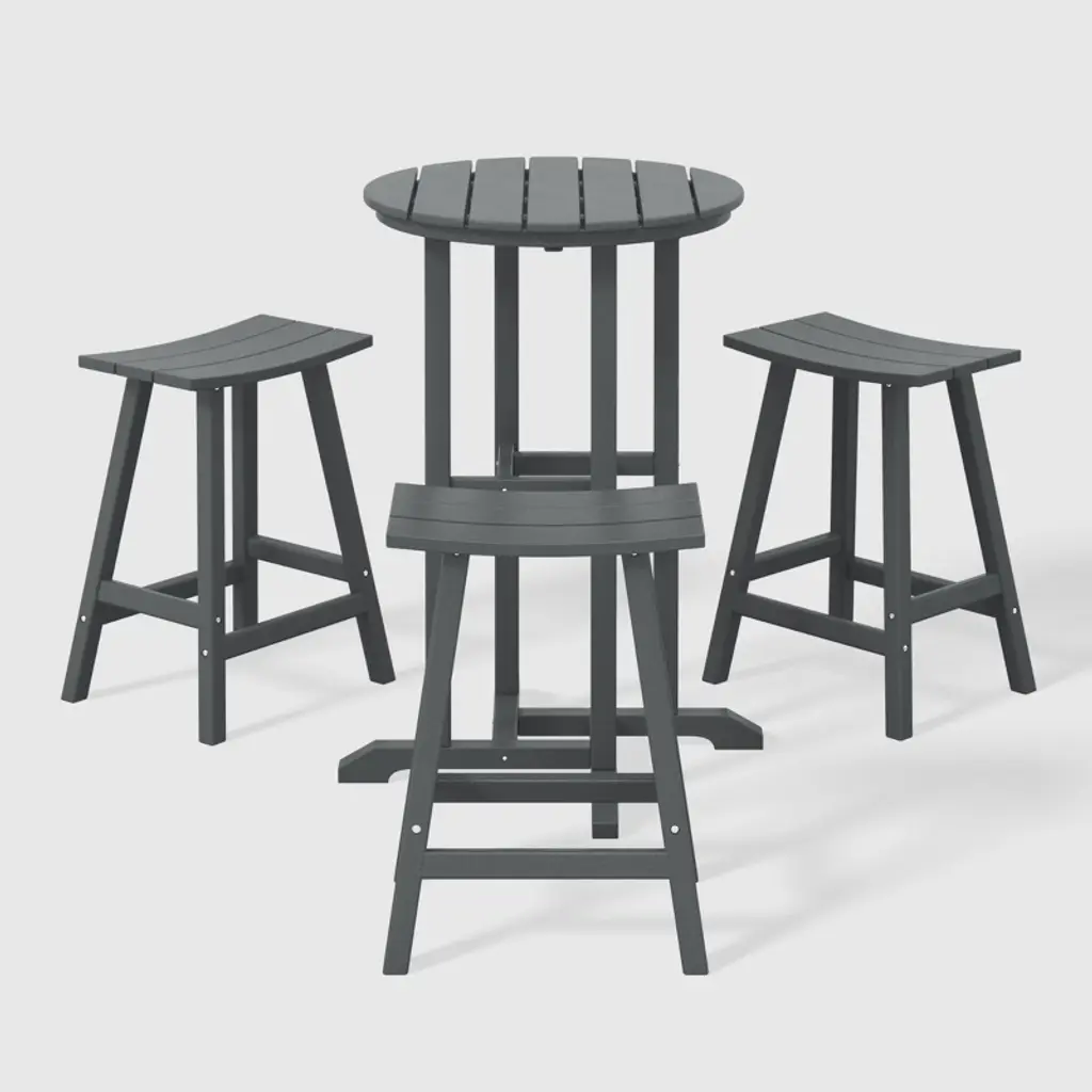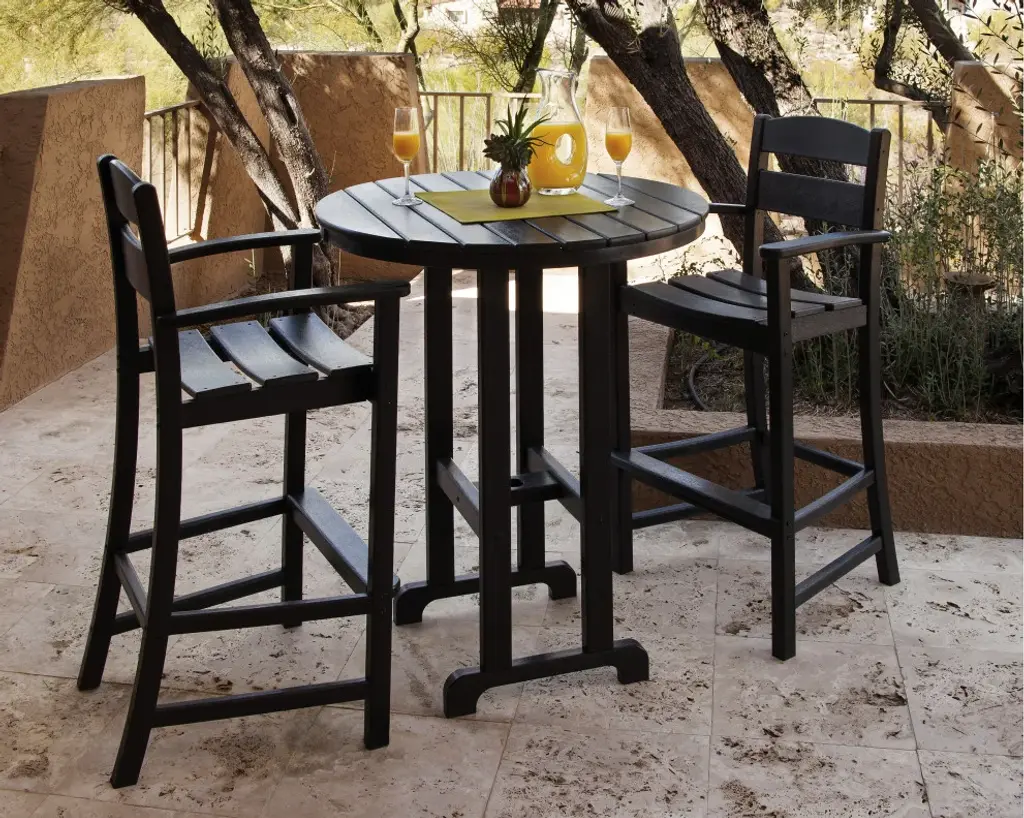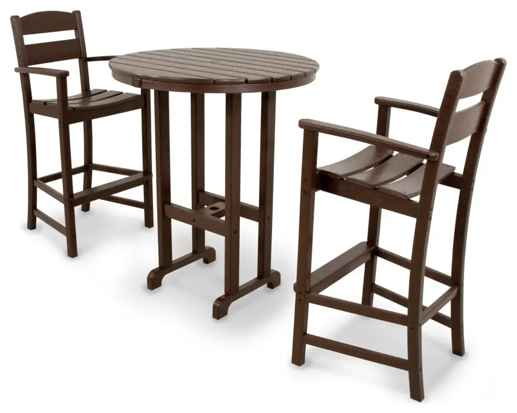 The Ivy Terrace Classics 3-Piece Bar Set includes two IVTD212 Classics Bar Arm Chairs and an IVRBT236 Classics Round 36" Bar Table. This bar set doesn't just look good, it's eco-friendly. Each piece is made of All-Weather HDPE lumber which contains mostly recycled content. All-Weather HDPE lumber has the great look of painted wood but requires no painting, staining, waterproofing, or similar maintenance. Assembled with solid dimensional lumber and Marine-grade quality hardware, this set can withstand most anything nature throws at it. All-Weather HDPE lumber will not splinter, crack, chip, or peel. Further, coloring runs throughout the UV-stabilized plastic lumber so there is no exterior finish to wear or scratch off. - This bar set is stain resistant and cleans easily with soap and water. Ivy Terrace furniture boasts a 20-year warranty and is proudly made in the USA. Some assembly required.Includes two IVTD212 Classics Bar Arm Chairs and an IVRBT236 Classics Round 36" Bar TableConstructed of genuine POLYWOOD lumber, a proprietary blend of plastics which includes recycled milk jugs and detergent bottlesSolid, heavy-duty construction withstands most anything nature can throw at itUV protectant and color continuously throughout the HDPE material; requires no painting or waterproofingWill not splinter, crack, chip, peel, rot, or suffer from insect infestationMarine-grade quality hardware20-year residential warranty; 3-year commercial warrantyResists stains and is easy to clean with soap and waterSome assembly requiredMade in the USATable outfittedwith 1.625" center hole for standard umbrella (sold separately); hole cover included