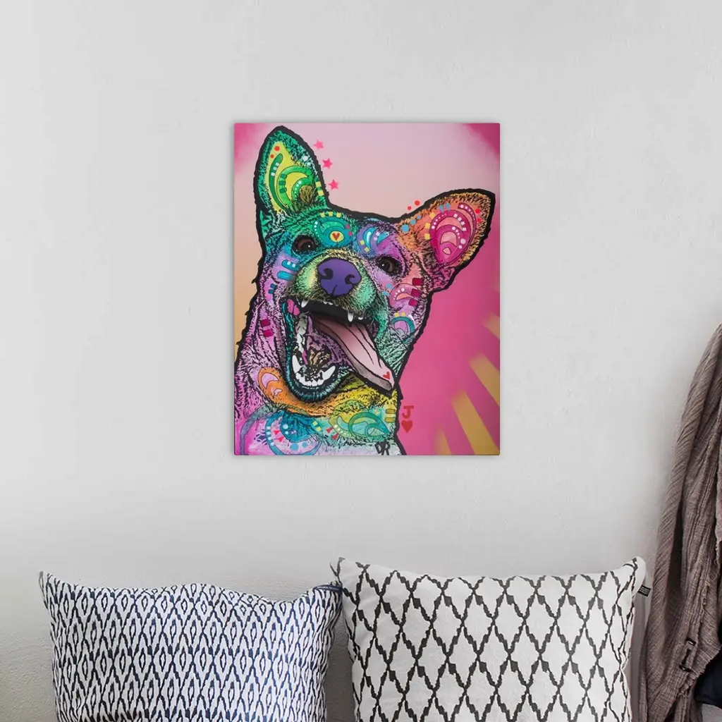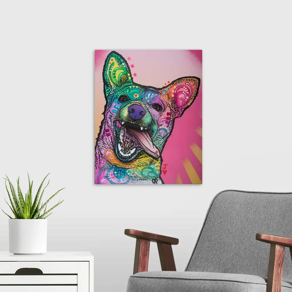 Funny painting of a colorful dog with its mouth open and tongue sticking out on a pink background with gold beams at the bottom.