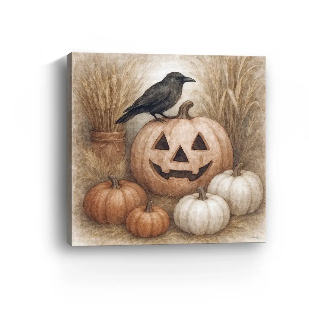 This gentle Halloween composition features a carved pumpkin surrounded by dried grasses and perched by a mysterious raven. The palette of ivory, terracotta, and dusty taupe evokes a nostalgic autumn mood. Our Gallery Wrap Canvas Prints are proudly assembled with high quality materials in California, USA. Each piece is printed on a thick, archival grade canvas using Giclee technology. It is then hand-stretched by our experienced artisans over solid wood bars, which will not warp over time. The final product is a piece personally crafted for you to confidently display on your wall. Care and Assembly: Ensure that the location of your piece has little to no exposure to heat, sunlight, and moisture. Wipe clean, only if needed. Each piece includes hanging hardware to hang on your wall horizontally.