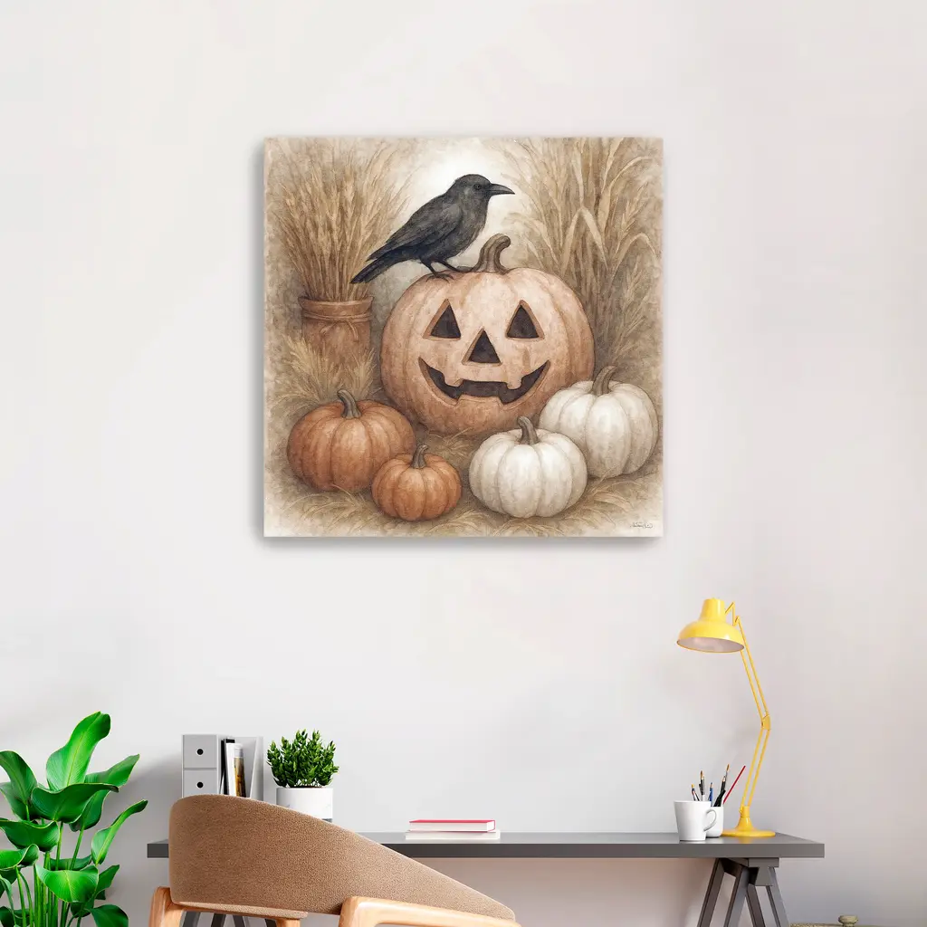 This gentle Halloween composition features a carved pumpkin surrounded by dried grasses and perched by a mysterious raven. The palette of ivory, terracotta, and dusty taupe evokes a nostalgic autumn mood. Our Gallery Wrap Canvas Prints are proudly assembled with high quality materials in California, USA. Each piece is printed on a thick, archival grade canvas using Giclee technology. It is then hand-stretched by our experienced artisans over solid wood bars, which will not warp over time. The final product is a piece personally crafted for you to confidently display on your wall. Care and Assembly: Ensure that the location of your piece has little to no exposure to heat, sunlight, and moisture. Wipe clean, only if needed. Each piece includes hanging hardware to hang on your wall horizontally.