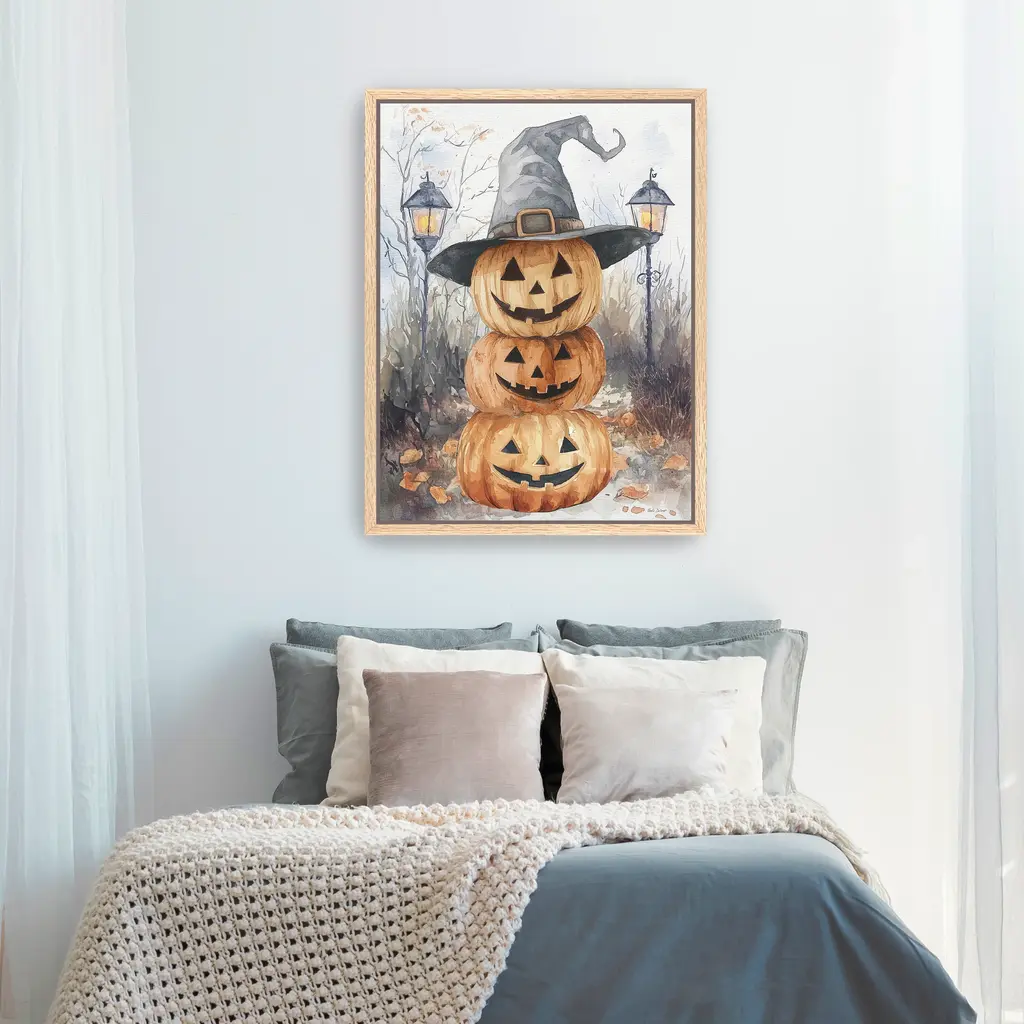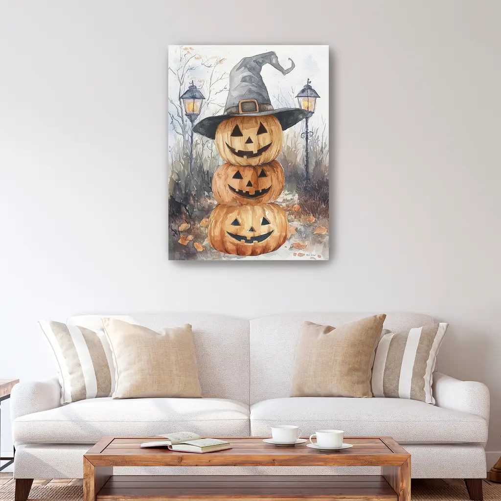 This playful trio of carved pumpkins grins beneath a pointed witch hat, surrounded by glowing streetlamps and swirling leaves. The palette of burnt orange, foggy blue, and charcoal black adds cozy magic to your Halloween decor. Our Gallery Wrap Canvas Prints are proudly assembled with high quality materials in California, USA. Each piece is printed on a thick, archival grade canvas using Giclee technology. It is then hand-stretched by our experienced artisans over solid wood bars, which will not warp over time. The final product is a piece personally crafted for you to confidently display on your wall. Care and Assembly: Ensure that the location of your piece has little to no exposure to heat, sunlight, and moisture. Wipe clean, only if needed. Each piece includes hanging hardware to hang on your wall vertically.