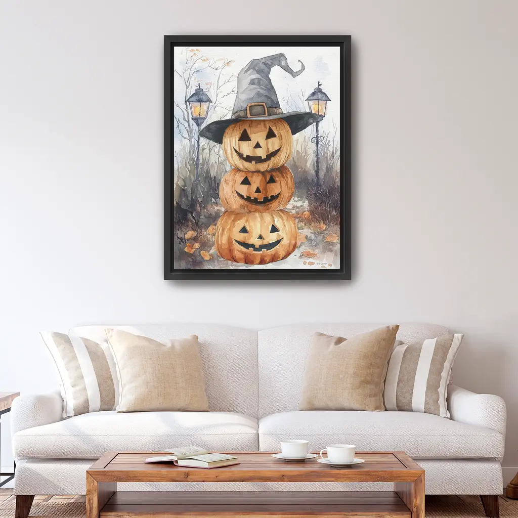 This playful trio of carved pumpkins grins beneath a pointed witch hat, surrounded by glowing streetlamps and swirling leaves. The palette of burnt orange, foggy blue, and charcoal black adds cozy magic to your Halloween decor. Our Gallery Wrap Canvas Prints are proudly assembled with high quality materials in California, USA. Each piece is printed on a thick, archival grade canvas using Giclee technology. It is then hand-stretched by our experienced artisans over solid wood bars, which will not warp over time. The final product is a piece personally crafted for you to confidently display on your wall. Care and Assembly: Ensure that the location of your piece has little to no exposure to heat, sunlight, and moisture. Wipe clean, only if needed. Each piece includes hanging hardware to hang on your wall vertically.
