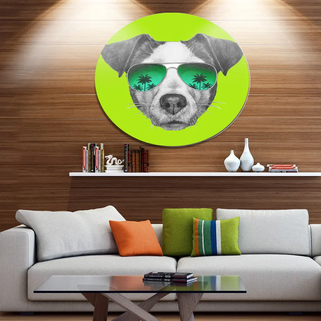 Bring Contemporary Abstraction to your home with this large Circle Metal wall art. This Jack Russell in Green Glasses Metal Artwork makes it the focal point of any room or office. - White Gloss Coating ensures colors are extra vibrant with light reflection.- Aluminum grade Sheet Metal with 1 inch mounting frame on the back giving the illusion that the artwork is floating on the wall..- Mounting Brackets are included along with instructions.- High Quality Digital images are created directly into a glossy aluminum panel producing a stunning and captivating print into the glossy finish of the metal.- Water, Fire and Scratch resistant HD Aluminum panels.- Looks better than any photo paper and guaranteed to last at least 20 years- Easy to clean with a microfiber cloth. Colors are far superior to regular Canvas Art. - Easy to Hang
