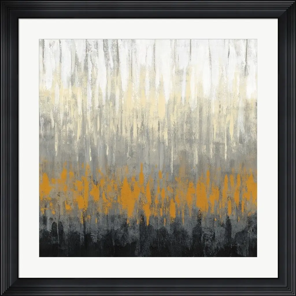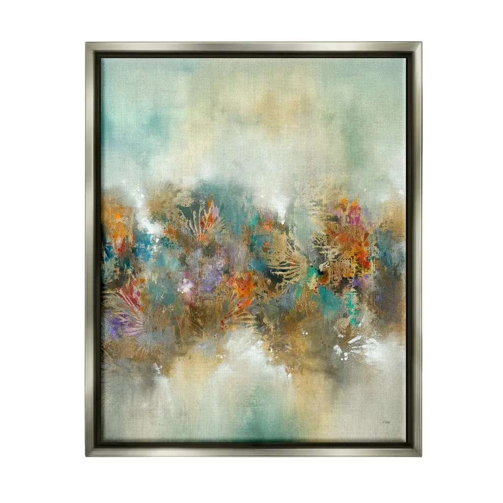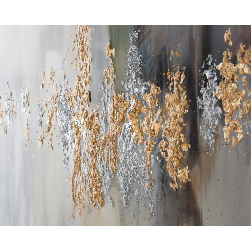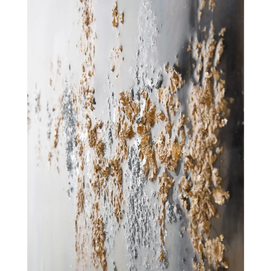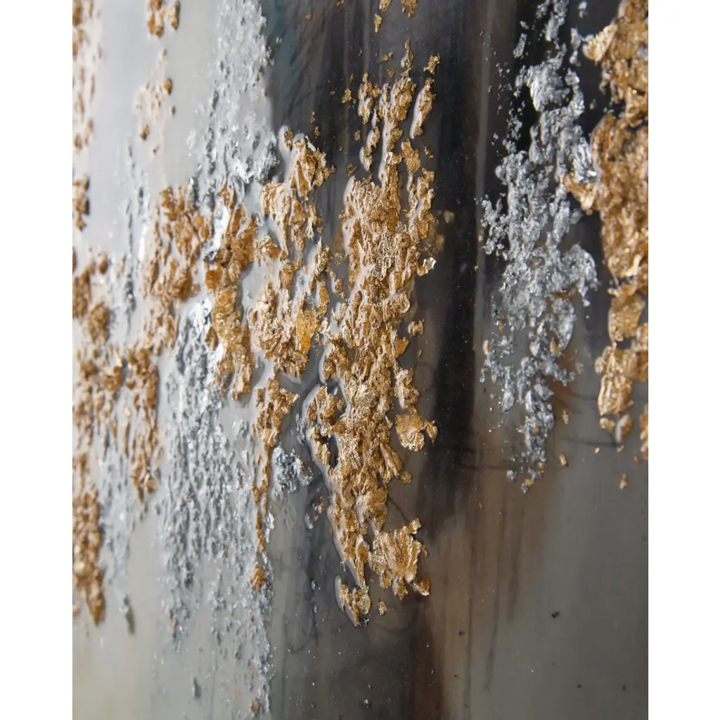 37.5"W X 48.5"H X 2.5"D This neutral painting by Jackie Ellens is highlighted by textural gold and silver leaf. The piece is complete with a high-gloss vitreous finish and surrounded by a silver-edged gallery molding.