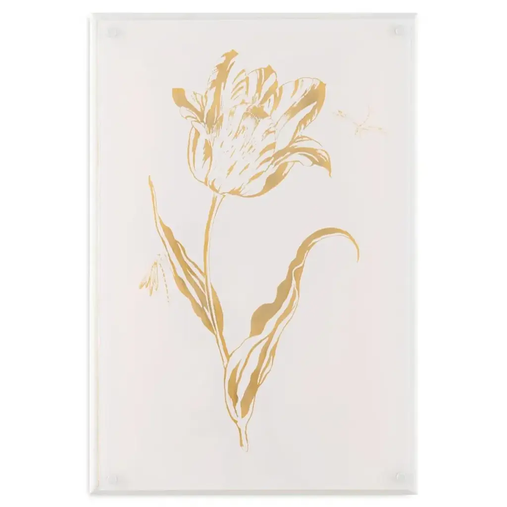 Gilded Tulips - Grace is a naturally inspired giclee print on acrylic with a satin finish, showcasing a gorgeous tulip flower embellished with shimmering gold leaf. This stunning artwork is affixed with standoffs at the corners and may only be displayed in a vertical orientation.