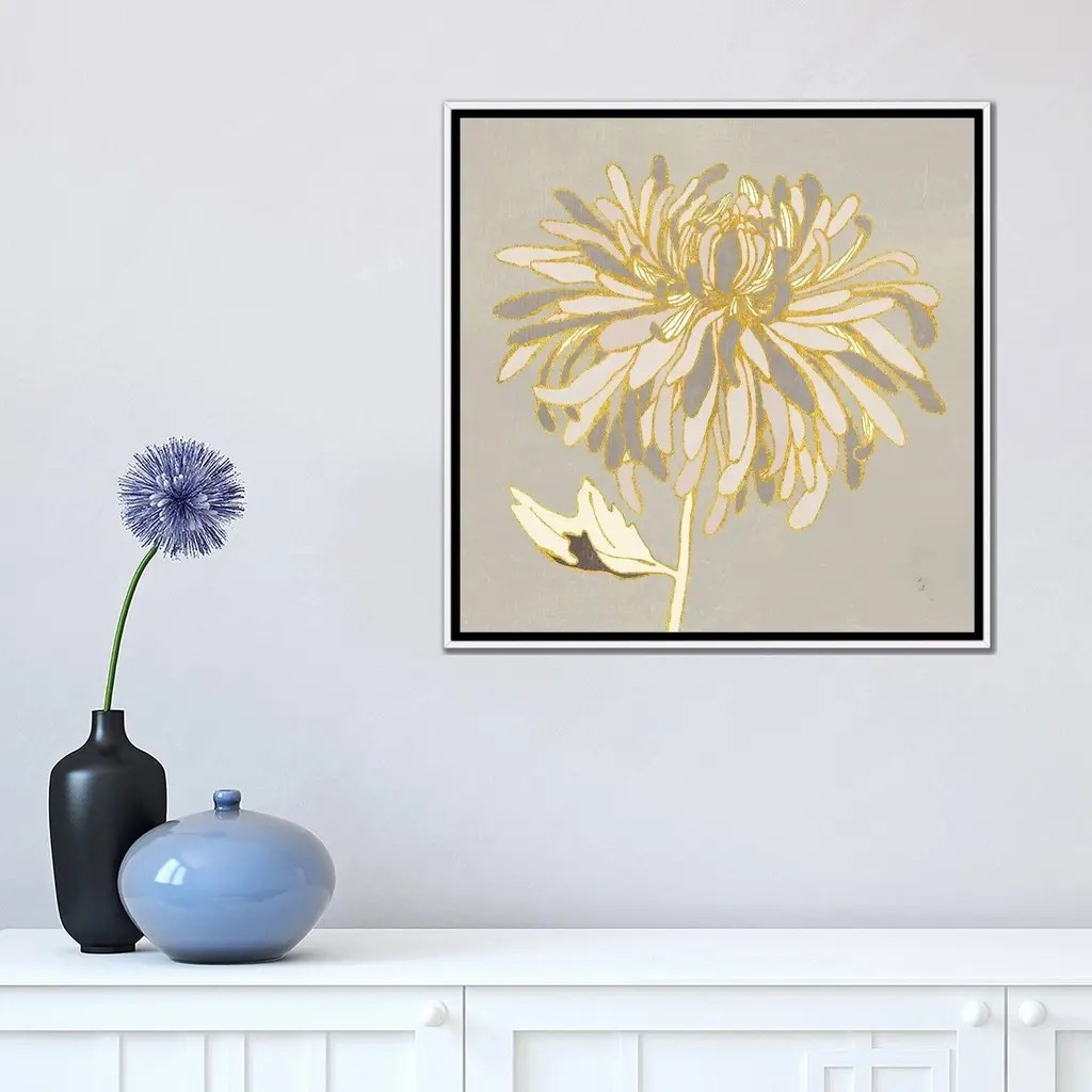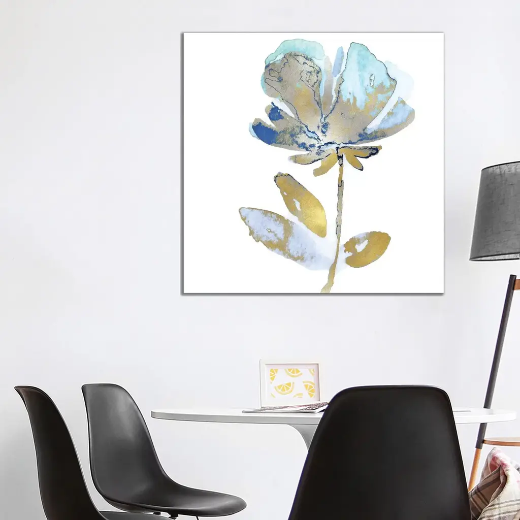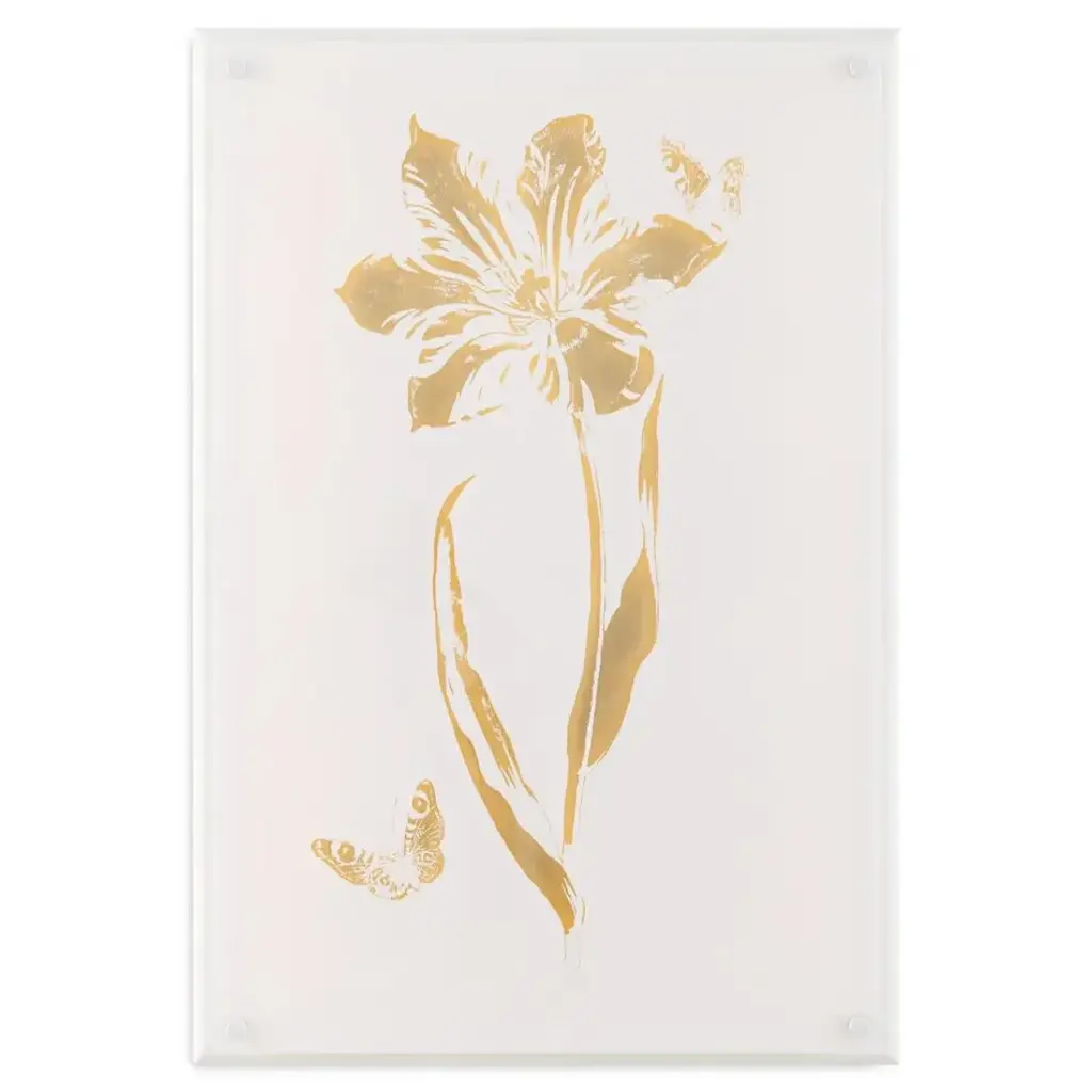 Gilded Tulips - Majestic Grow is a naturally inspired giclee print on acrylic with a satin finish, showcasing a gorgeous tulip flower embellished with shimmering gold leaf. This stunning artwork is affixed with standoffs at the corners and may only be displayed in a vertical orientation.