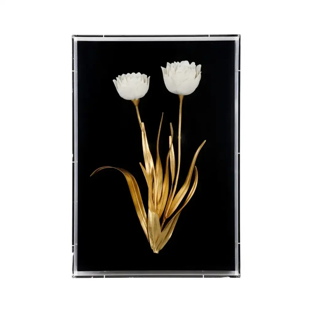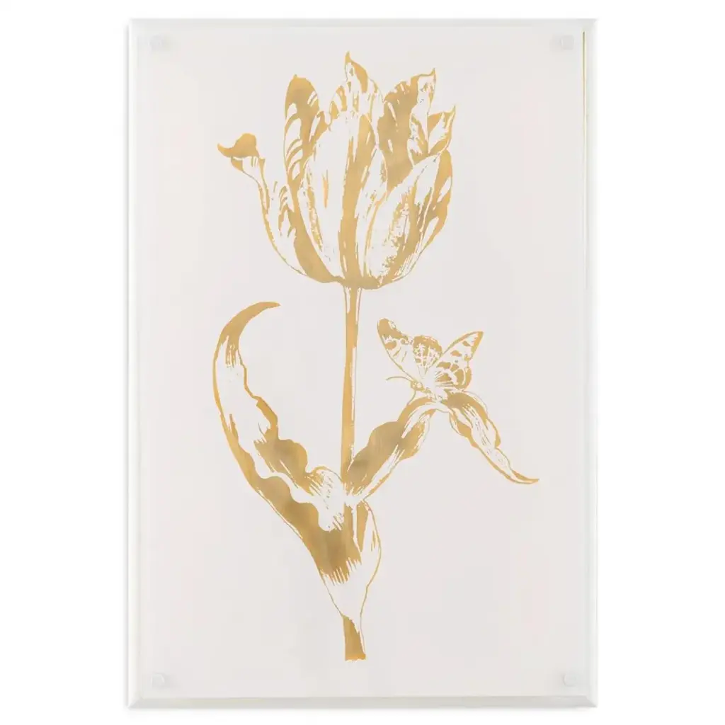 Gilded Tulips - Opulent Flourish is a naturally inspired giclee print on acrylic with a satin finish, showcasing a gorgeous tulip flower embellished with shimmering gold leaf. This stunning artwork is affixed with standoffs at the corners and may only be displayed in a vertical orientation.