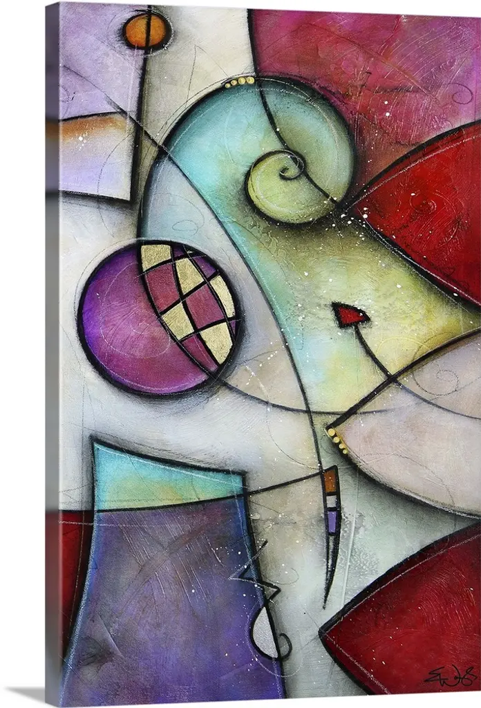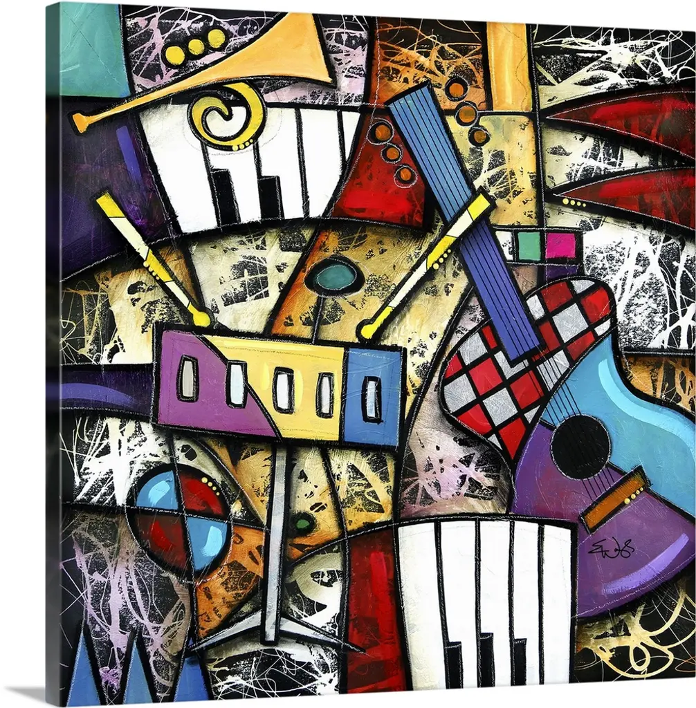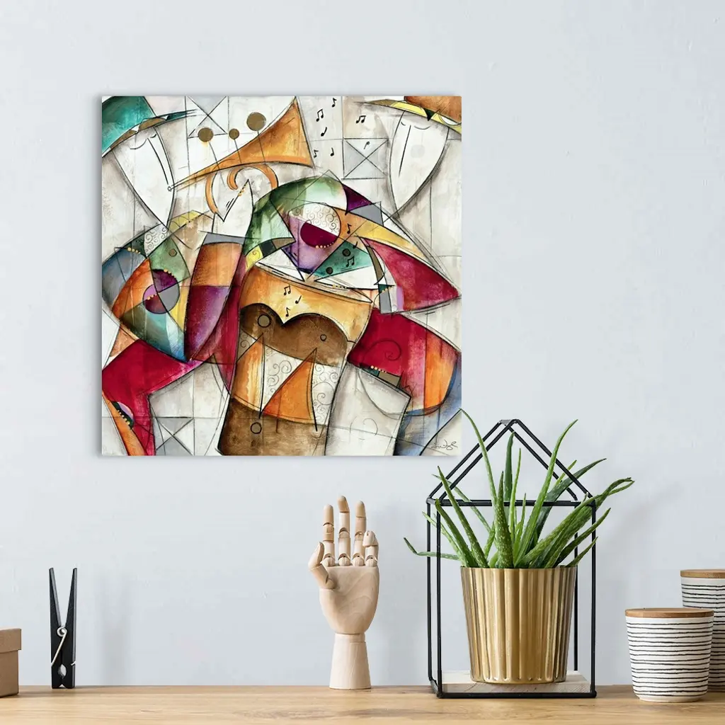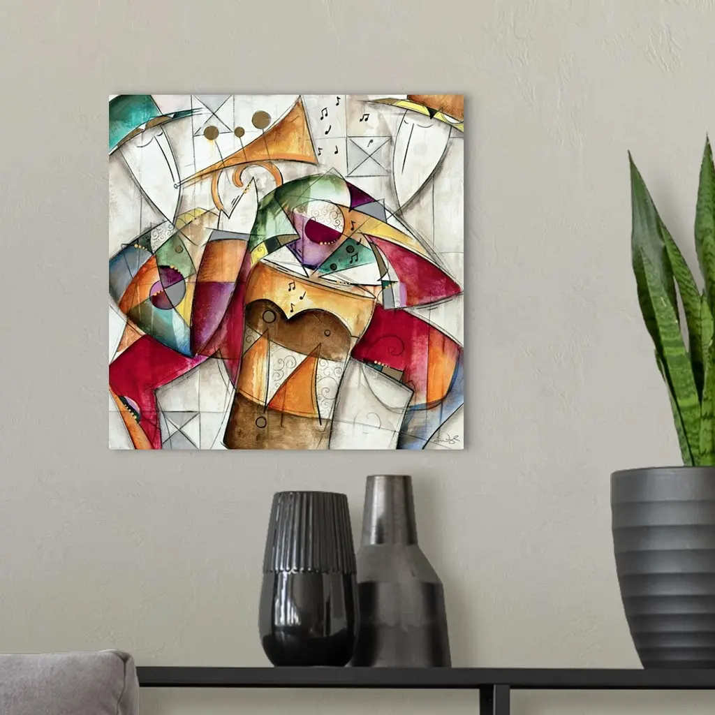 Jam Session I by Eric Waugh. A square abstract painting of musicians playing instruments.