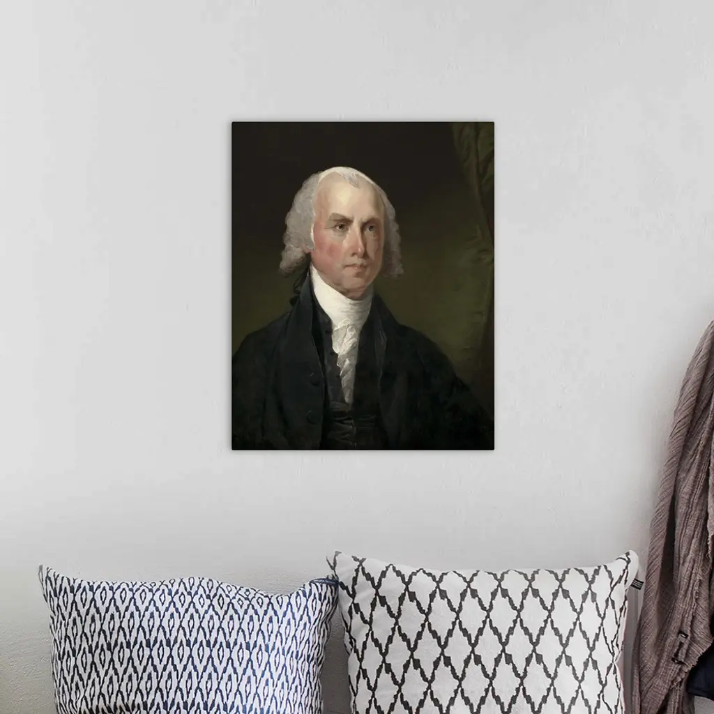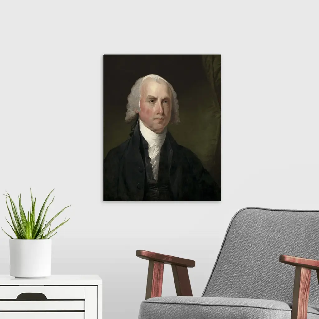 James Madison, by Gilbert Stuart , 1821, American painting, oil on canvas. Colonel George Gibbs, Rhode Island, commissioned Stuart to paint five American Presidents in the 1820s. This Madison portrait was likely based on other pictures Stuart had painted
