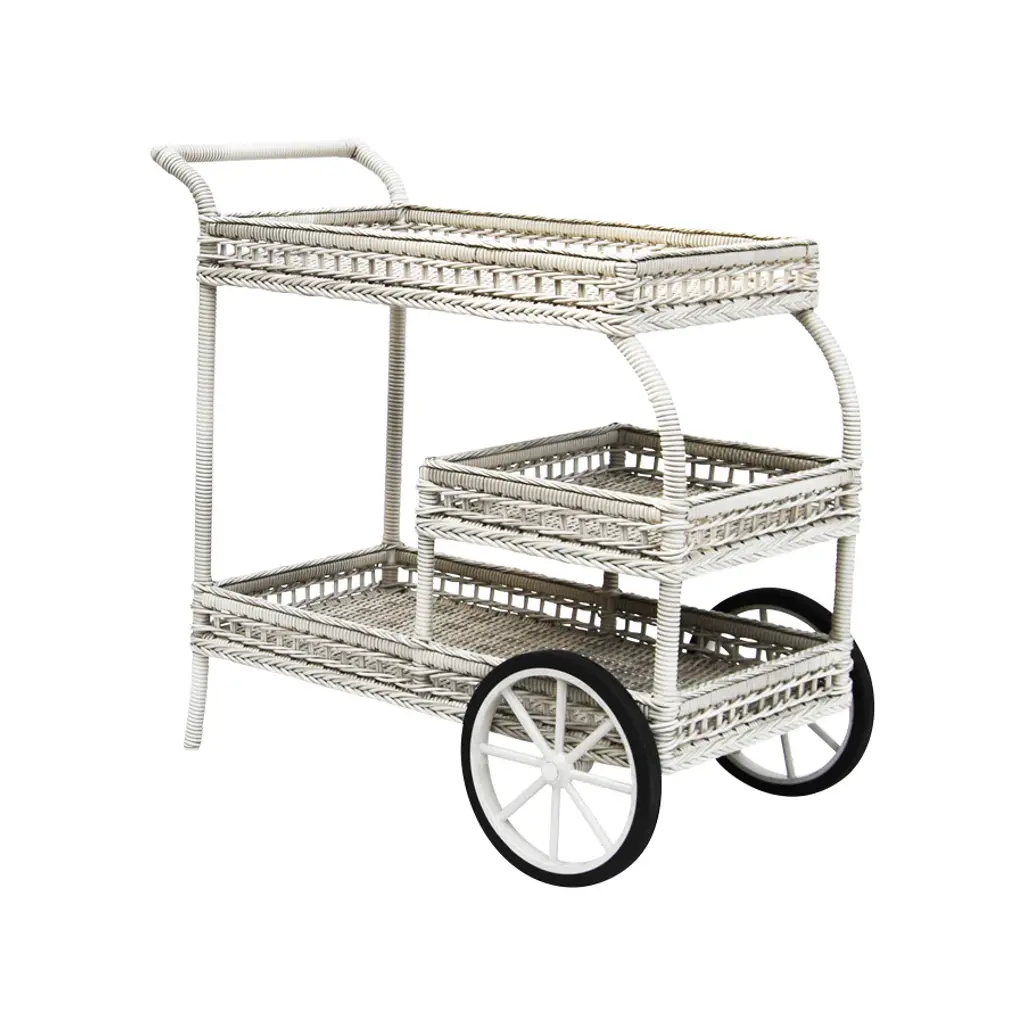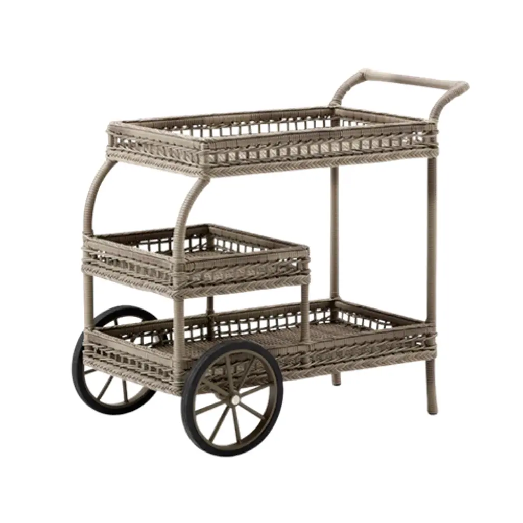 The James Trolley is the perfect accessory for serving (and impressing) guests on your deck or terrace. Three off-set shelves keep everything in order, and the prominent wheels and handle add style and functionality. The bar cart is a classic style inspired by sketches found in old books and on postcards. It is crafted from maintenance-free fibers woven on aluminum frame, making it durable enough for outdoor use..