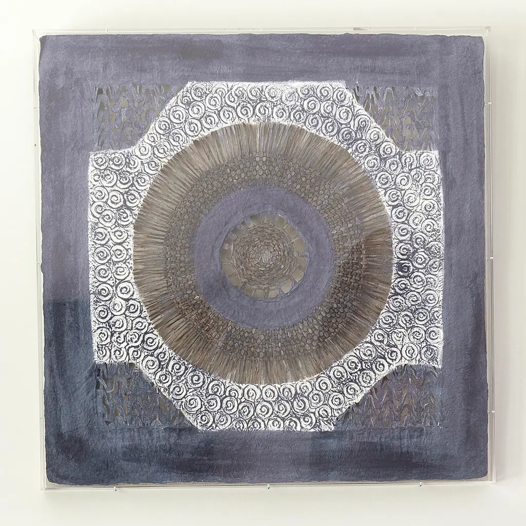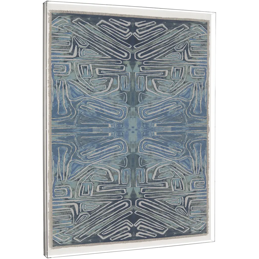 Batik dyed paper in intricate patterns are placed behind acrylic to create this immersive piece of wall art. Using different techniques to create patterns of blue and white print and deep indigo dyed woven paper, this art piece will mesmerize any onlooker. Made of hand-dyed paper set on 100% linen Acrylic Shadow Box Hangs vertical only Hand-painted Intricate Design D-Loop Hanging Mechanism MDF Black Velvet Backing