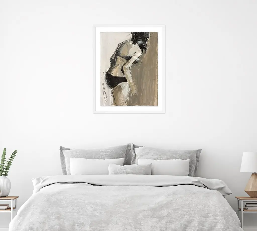 A faithful giclée reproduction of a painting by Jane Feil, this study of shadow, light, and the human form is floated above a white mat within a wood frame. It arrives ready to hang.Born in Chicago, Jane Feil received a BFA from the California College of the Arts in 1976. In the decades that have followed, her paintings have focused on the endlessly fascinating human figure. Feil has raised six children and lived in Santa Monica for nearly 30 years.