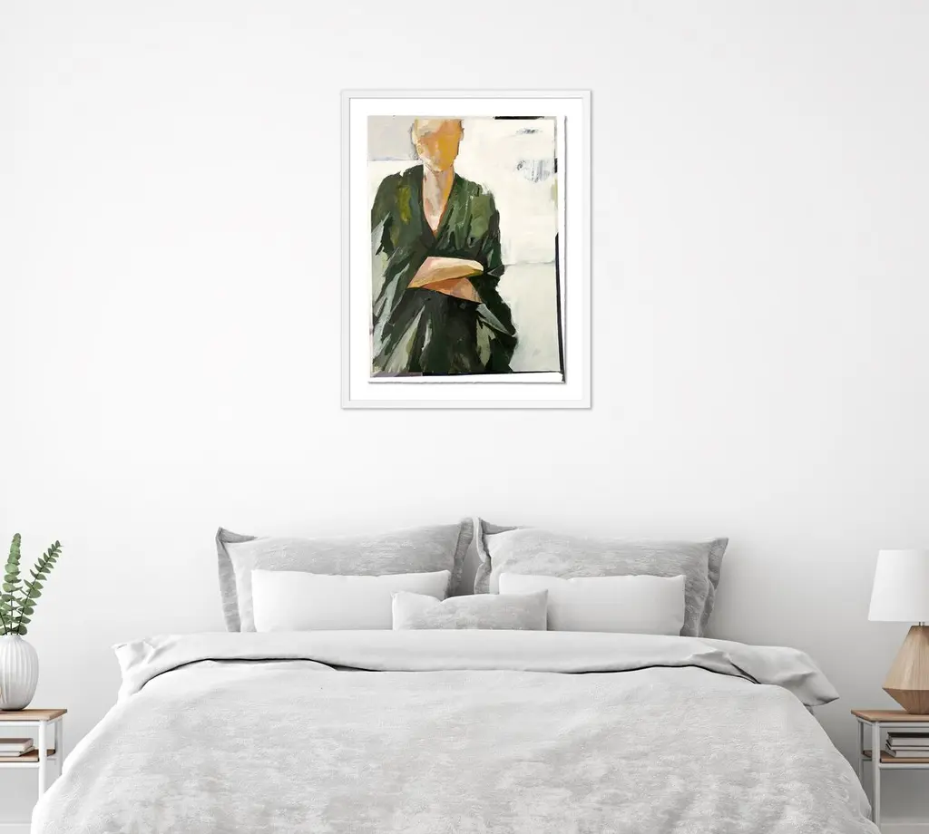 This evocative portrait is a faithful giclée reproduction of a painting by Jane Feil. Floated above a white mat within a wood frame, it arrives ready to hang.Born in Chicago, Jane Feil received a BFA from the California College of the Arts in 1976. In the decades that have followed, her paintings have focused on the endlessly fascinating human figure. Feil has raised six children and lived in Santa Monica for nearly 30 years.