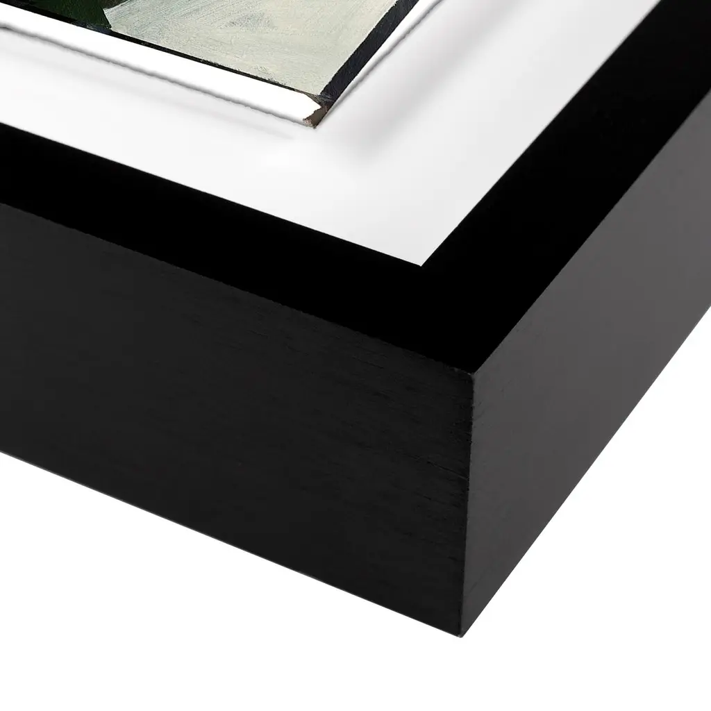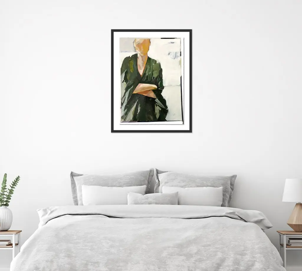 This evocative portrait is a faithful giclée reproduction of a painting by Jane Feil. Floated above a white mat within a wood frame, it arrives ready to hang.Born in Chicago, Jane Feil received a BFA from the California College of the Arts in 1976. In the decades that have followed, her paintings have focused on the endlessly fascinating human figure. Feil has raised six children and lived in Santa Monica for nearly 30 years.