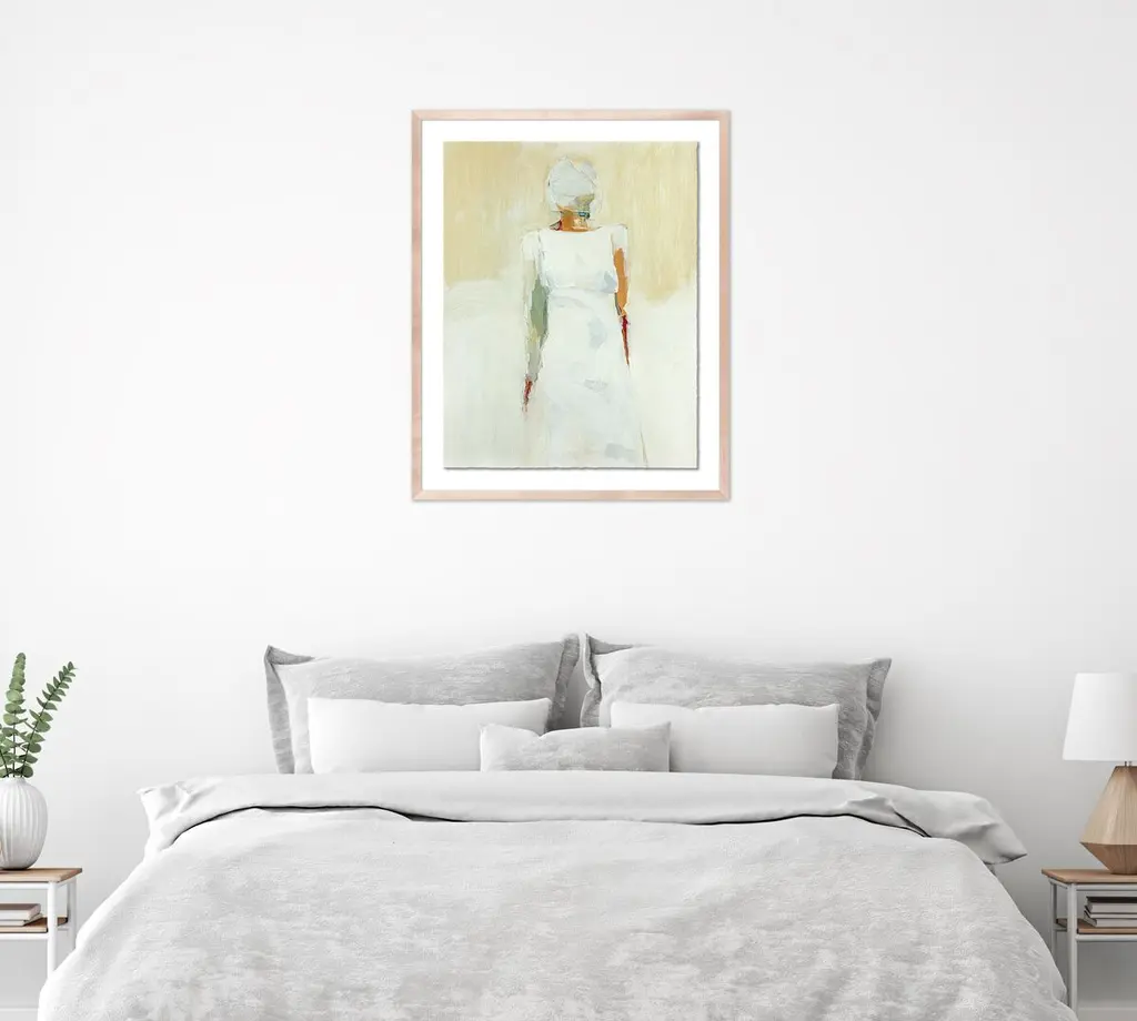 This evocative, impressionistic portrait is a faithful giclée reproduction of a painting by Jane Feil. Floated above a white mat within a wood frame, it arrives ready to hang.Born in Chicago, Jane Feil received a BFA from the California College of the Arts in 1976. In the decades that have followed, her paintings have focused on the endlessly fascinating human figure. Feil has raised six children and lived in Santa Monica for nearly 30 years.