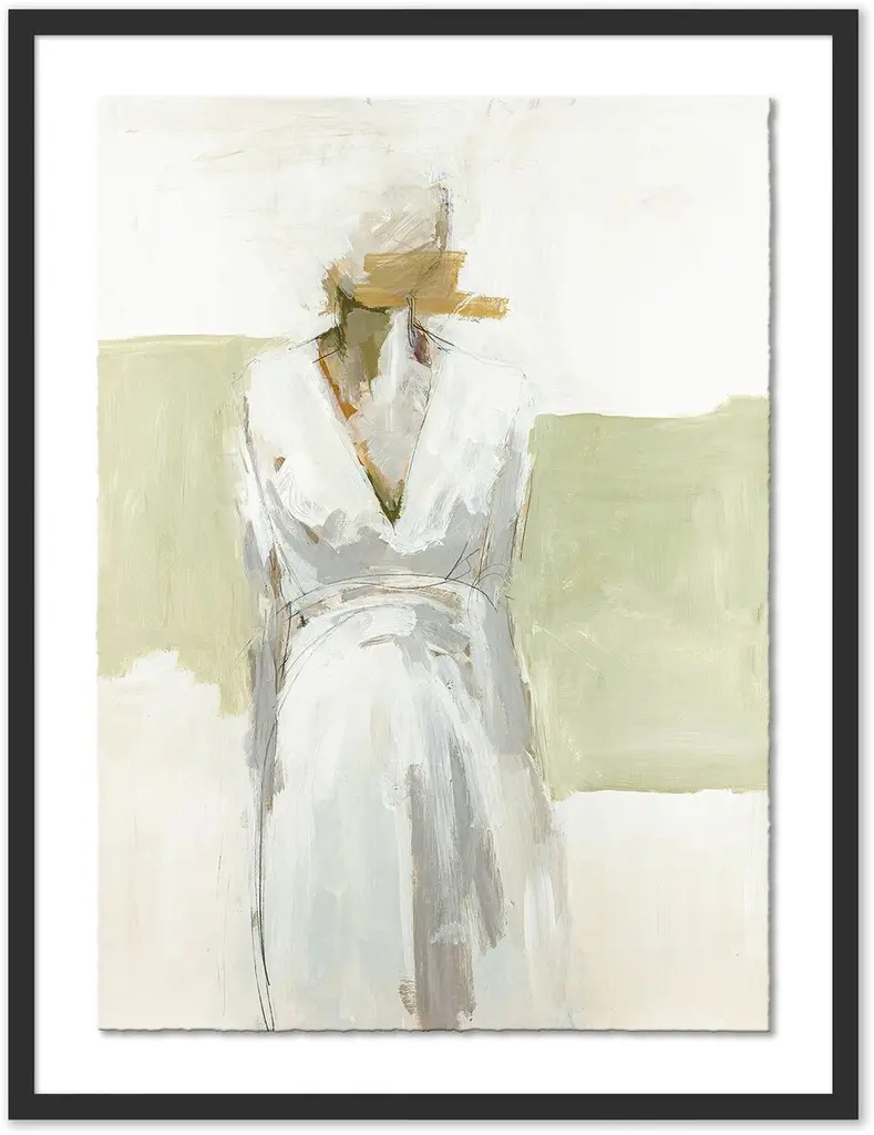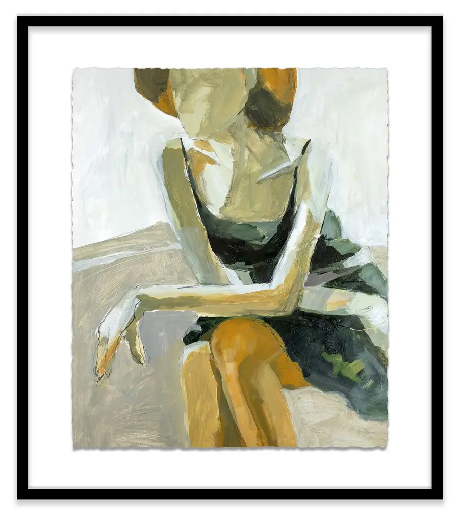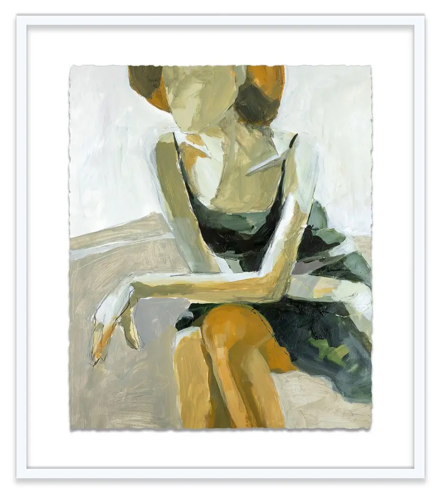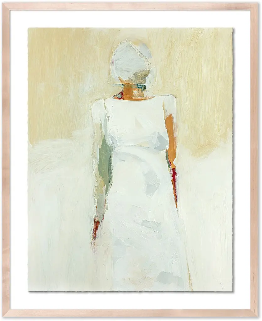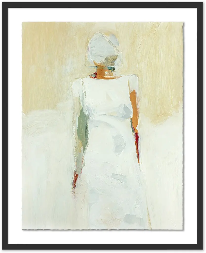 This evocative, impressionistic portrait is a faithful giclée reproduction of a painting by Jane Feil. Floated above a white mat within a wood frame, it arrives ready to hang.Born in Chicago, Jane Feil received a BFA from the California College of the Arts in 1976. In the decades that have followed, her paintings have focused on the endlessly fascinating human figure. Feil has raised six children and lived in Santa Monica for nearly 30 years.
