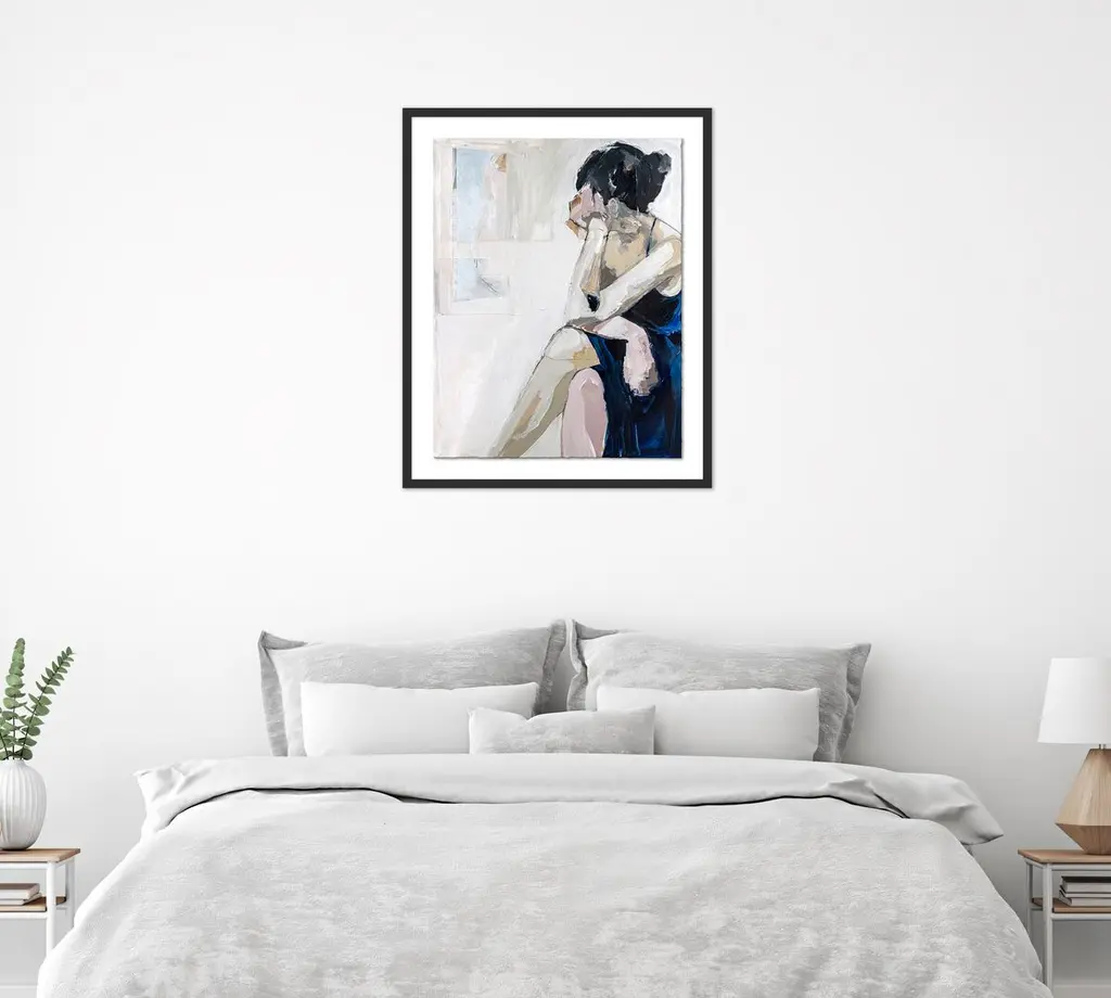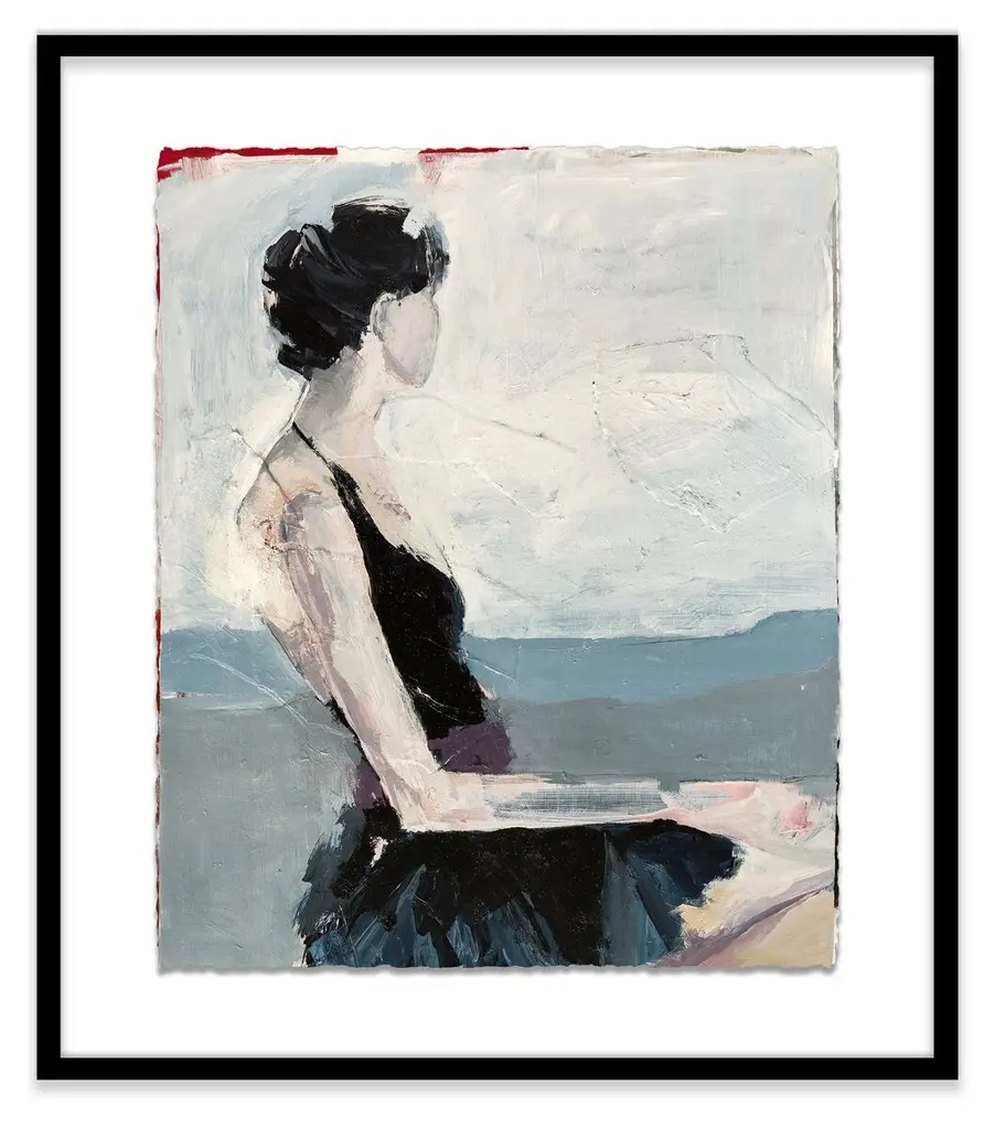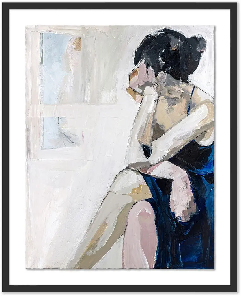 This evocative portrait is a faithful giclée reproduction of a painting by Jane Feil. Floated above a white mat within a wood frame, it arrives ready to hang.Born in Chicago, Jane Feil received a BFA from the California College of the Arts in 1976. In the decades that have followed, her paintings have focused on the endlessly fascinating human figure. Feil has raised six children and lived in Santa Monica for nearly 30 years.