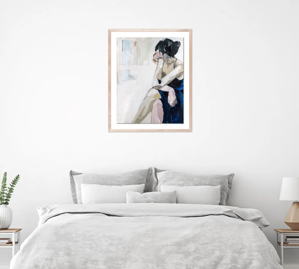 This evocative portrait is a faithful giclée reproduction of a painting by Jane Feil. Floated above a white mat within a wood frame, it arrives ready to hang.Born in Chicago, Jane Feil received a BFA from the California College of the Arts in 1976. In the decades that have followed, her paintings have focused on the endlessly fascinating human figure. Feil has raised six children and lived in Santa Monica for nearly 30 years.
