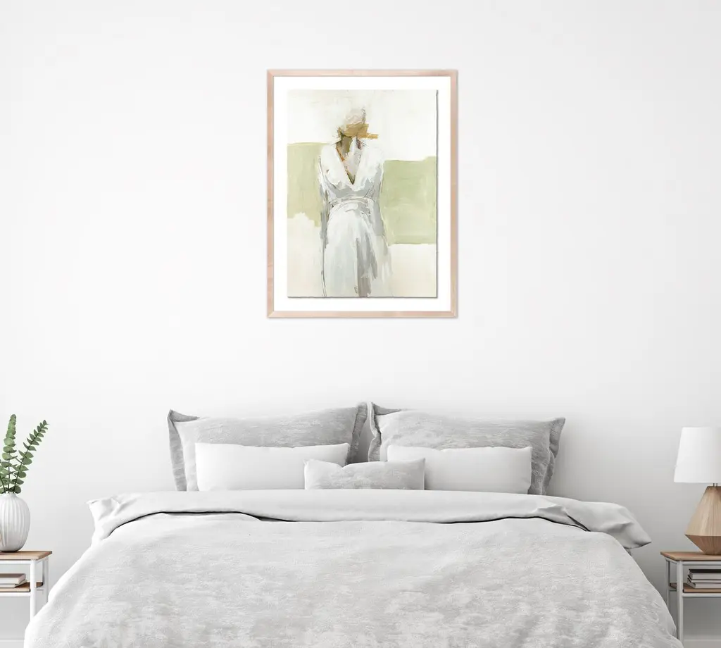This evocative, impressionistic portrait is a faithful giclée reproduction of a painting by Jane Feil. Floated above a white mat within a wood frame, it arrives ready to hang.Born in Chicago, Jane Feil received a BFA from the California College of the Arts in 1976. In the decades that have followed, her paintings have focused on the endlessly fascinating human figure. Feil has raised six children and lived in Santa Monica for nearly 30 years.