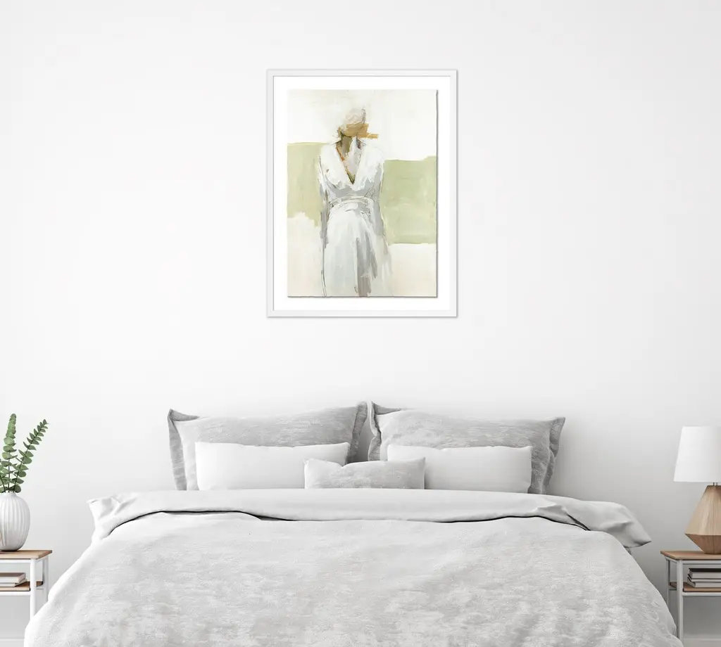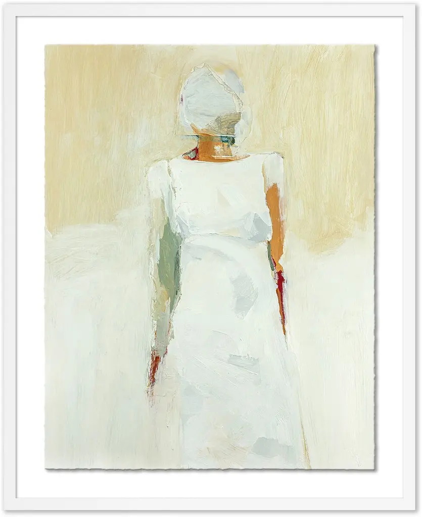 This evocative, impressionistic portrait is a faithful giclée reproduction of a painting by Jane Feil. Floated above a white mat within a wood frame, it arrives ready to hang.Born in Chicago, Jane Feil received a BFA from the California College of the Arts in 1976. In the decades that have followed, her paintings have focused on the endlessly fascinating human figure. Feil has raised six children and lived in Santa Monica for nearly 30 years.