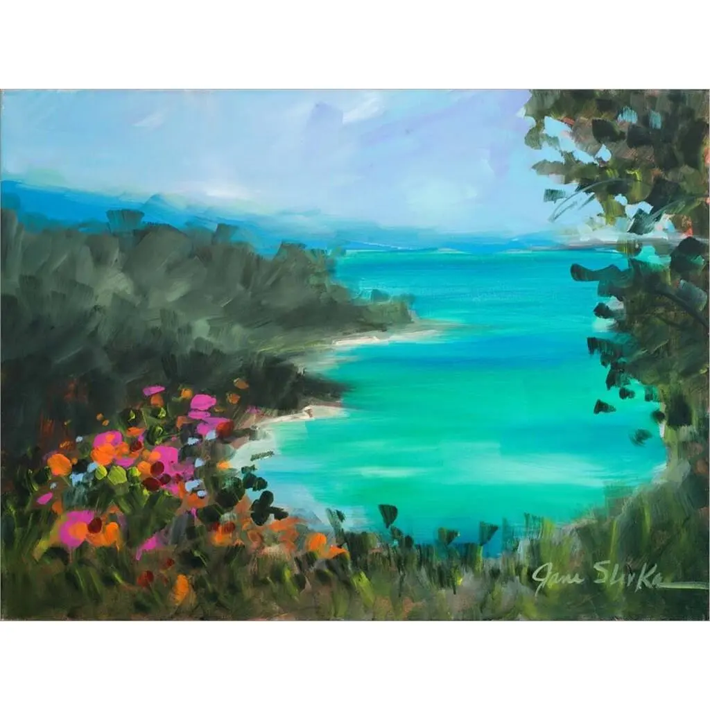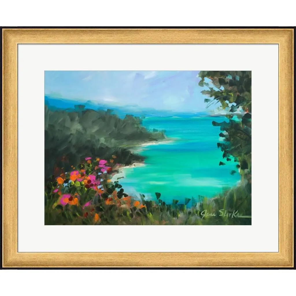 Overlooking the Inlet by Jane Slivka is a high quality piece of framed artwork. The finished size of this piece is 25.25" x 20.75". It has a Gold Black Accent Contemporary frame, White mat and is finished with high quality Acrylic Plexiglass. 100% Satisfaction Guaranteed.