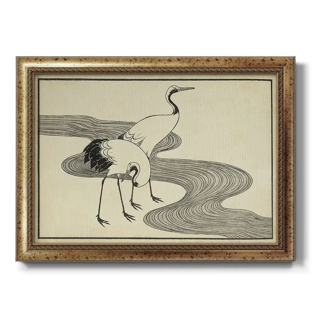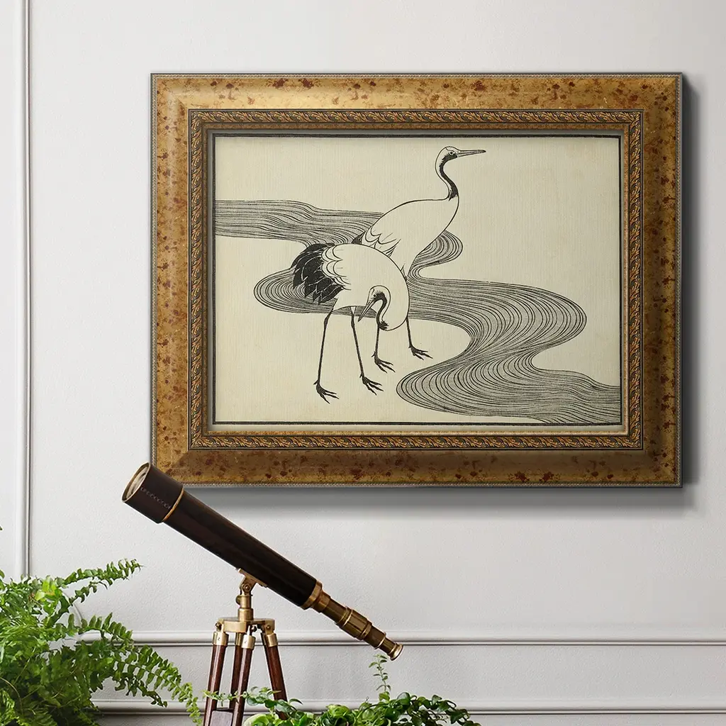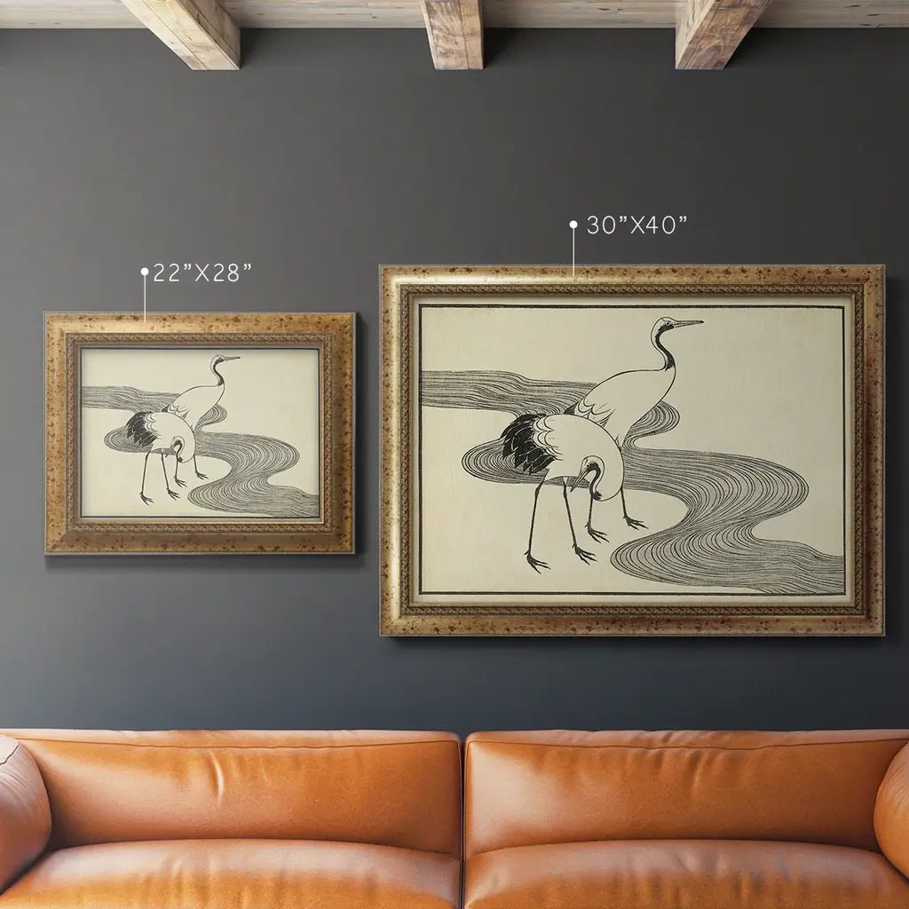 Japanese Cranes A Premium Framed Canvas- Ready to Hang A Premium Framed Canvas created to last. Framed in distressed wood and available in an array of sizes and colors Featuring a beveled a solid wood stretcher bar, each piece comes ready to hand 3 SIZES AVAILABLE 16''X20'' - Overall Size 18'X27'' - Overall Size 24''x36'' - Overall Size Each piece is made to order. Each piece comes with hanging hardware. Made in the USA Ready to Hang Giclee Paper Print Acrylic Glass Beveled Matt Board