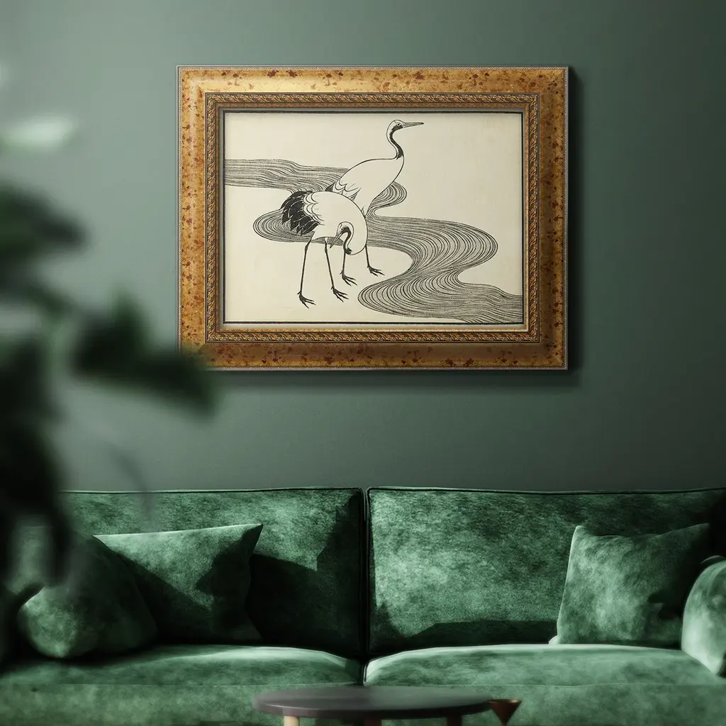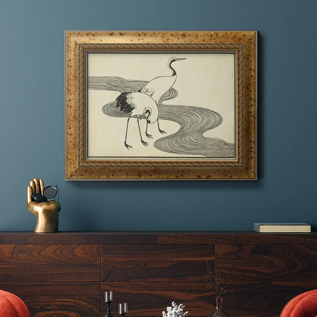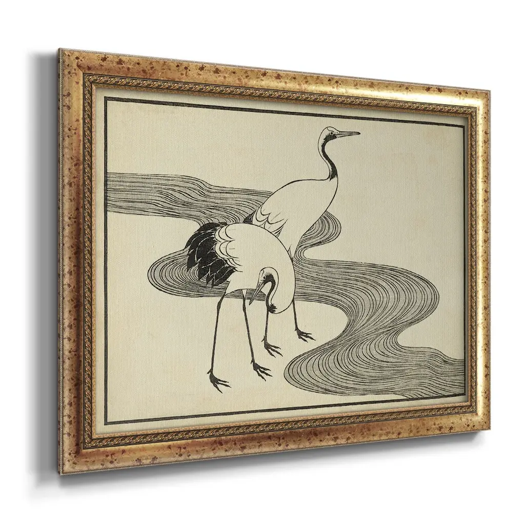 Japanese Cranes A Premium Framed Canvas- Ready to Hang A Premium Framed Canvas created to last. Framed in distressed wood and available in an array of sizes and colors Featuring a beveled a solid wood stretcher bar, each piece comes ready to hand 3 SIZES AVAILABLE 16''X20'' - Overall Size 18'X27'' - Overall Size 24''x36'' - Overall Size Each piece is made to order. Each piece comes with hanging hardware. Made in the USA Ready to Hang Giclee Paper Print Acrylic Glass Beveled Matt Board