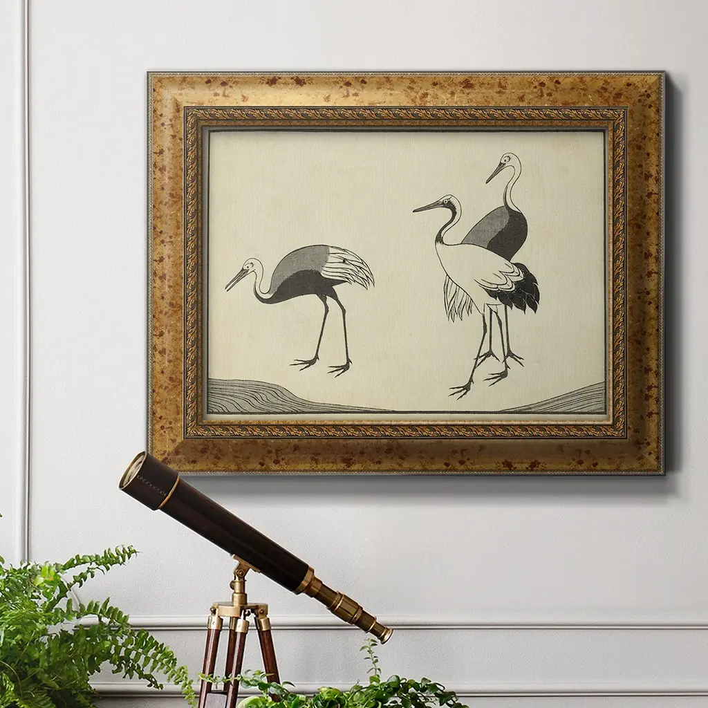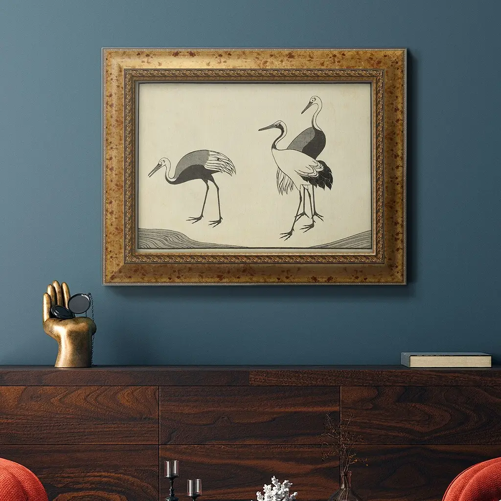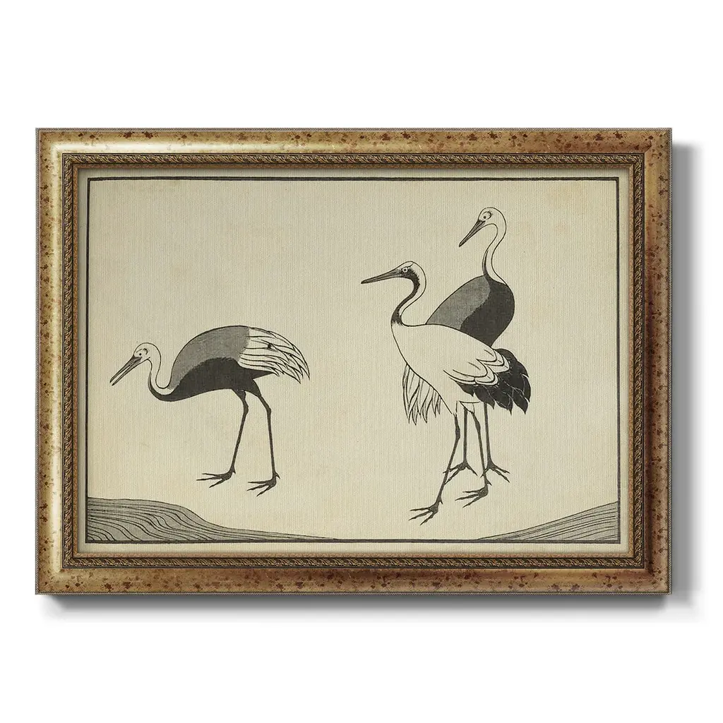 Japanese Cranes B Premium Framed Canvas- Ready to Hang A Premium Framed Canvas created to last. Framed in distressed wood and available in an array of sizes and colors Featuring a beveled a solid wood stretcher bar, each piece comes ready to hand 3 SIZES AVAILABLE 16''X20'' - Overall Size 18'X27'' - Overall Size 24''x36'' - Overall Size Each piece is made to order. Each piece comes with hanging hardware. Made in the USA Ready to Hang Giclee Paper Print Acrylic Glass Beveled Matt Board
