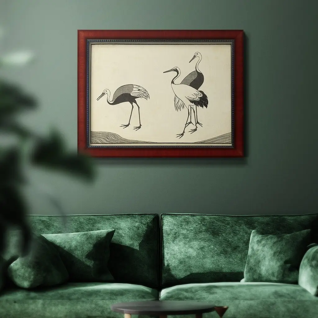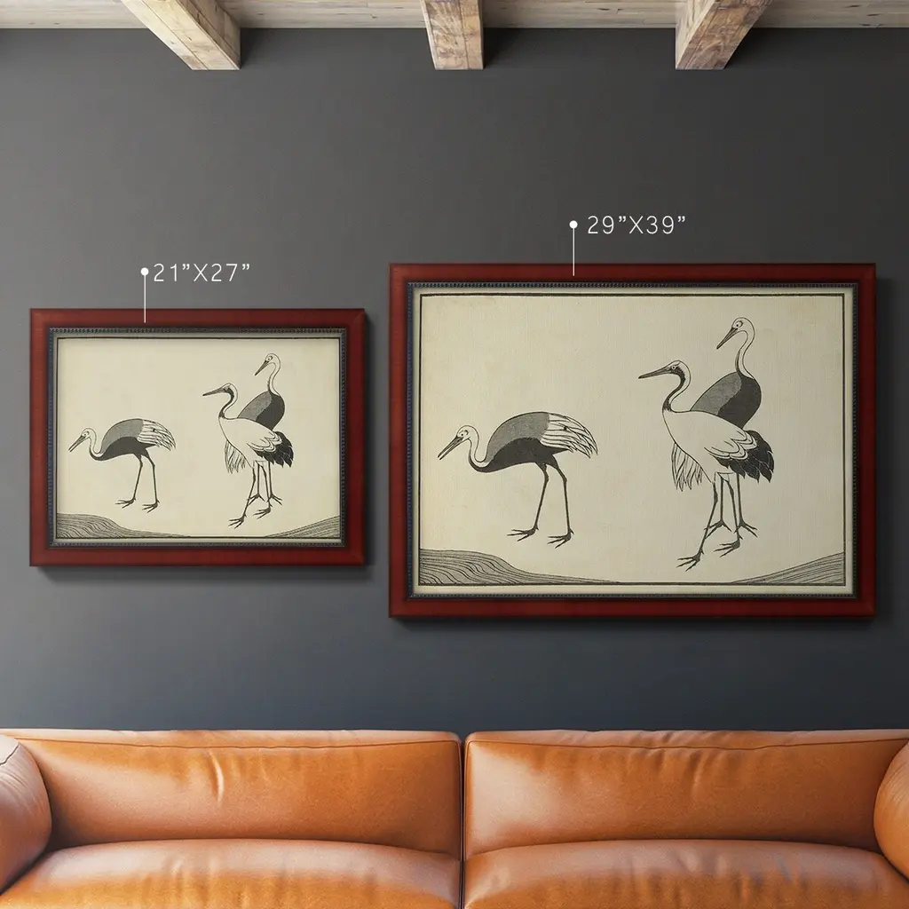 Japanese Cranes B Premium Framed Canvas- Ready to Hang A Premium Framed Canvas created to last. Framed in distressed wood and available in an array of sizes and colors Featuring a beveled a solid wood stretcher bar, each piece comes ready to hand 3 SIZES AVAILABLE 16''X20'' - Overall Size 18'X27'' - Overall Size 24''x36'' - Overall Size Each piece is made to order. Each piece comes with hanging hardware. Made in the USA Ready to Hang Giclee Paper Print Acrylic Glass Beveled Matt Board