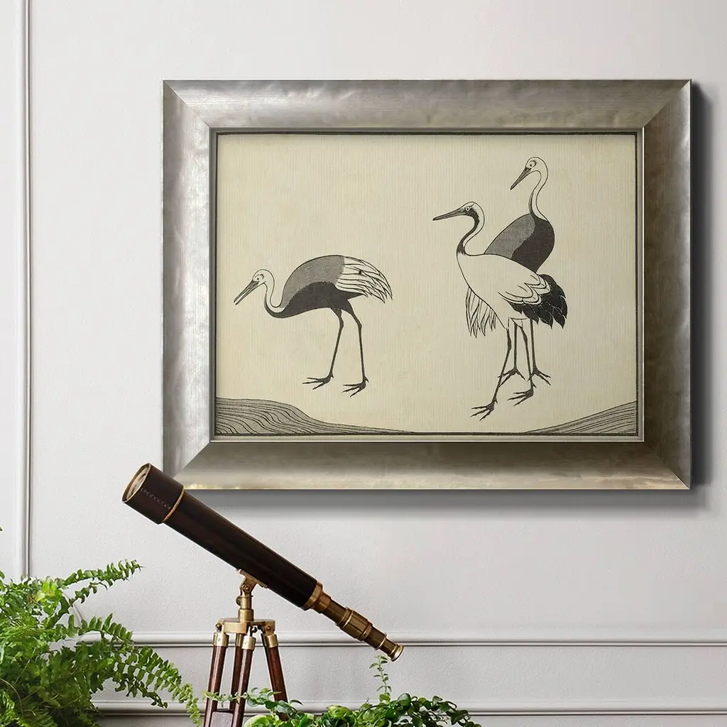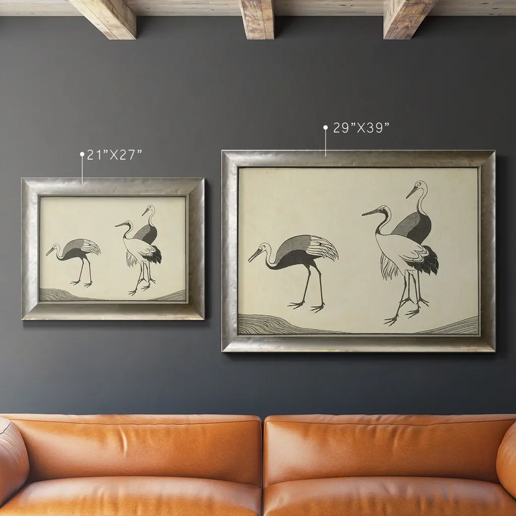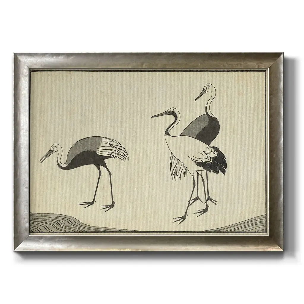 Japanese Cranes B Premium Framed Canvas- Ready to Hang A Premium Framed Canvas created to last. Framed in distressed wood and available in an array of sizes and colors Featuring a beveled a solid wood stretcher bar, each piece comes ready to hand 3 SIZES AVAILABLE 16''X20'' - Overall Size 18'X27'' - Overall Size 24''x36'' - Overall Size Each piece is made to order. Each piece comes with hanging hardware. Made in the USA Ready to Hang Giclee Paper Print Acrylic Glass Beveled Matt Board